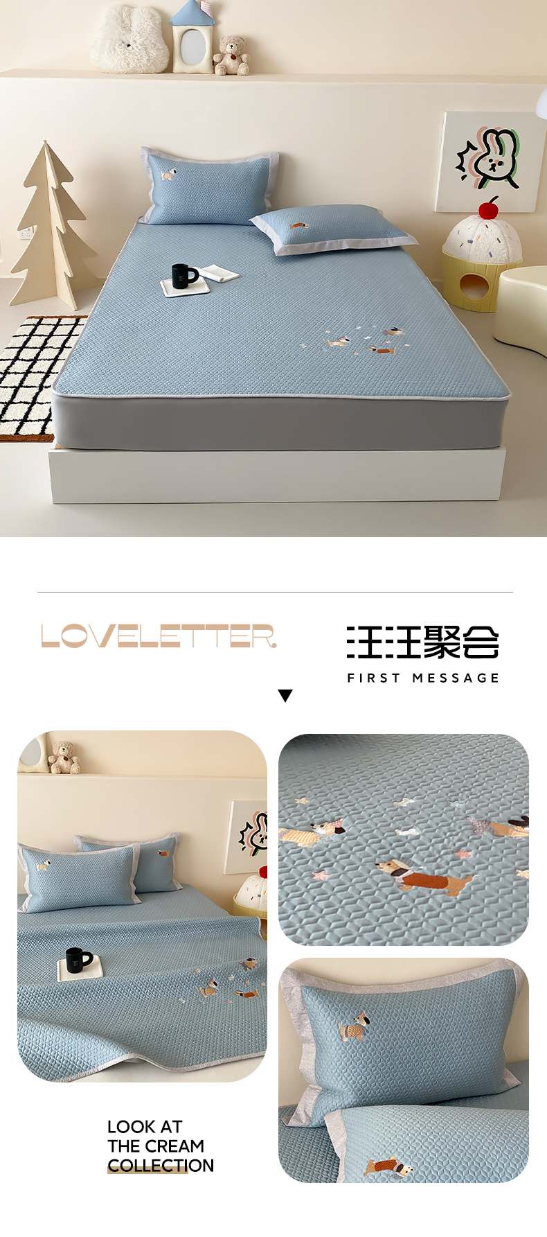 (总)由有家居 2025新款新品A类PE高凉感分子进口刺绣豆豆凉席三件套,巴拉宝宝,欢乐颂,气球咪咪,汪汪聚会,熊猫伙伴