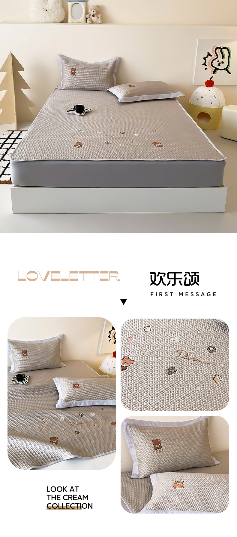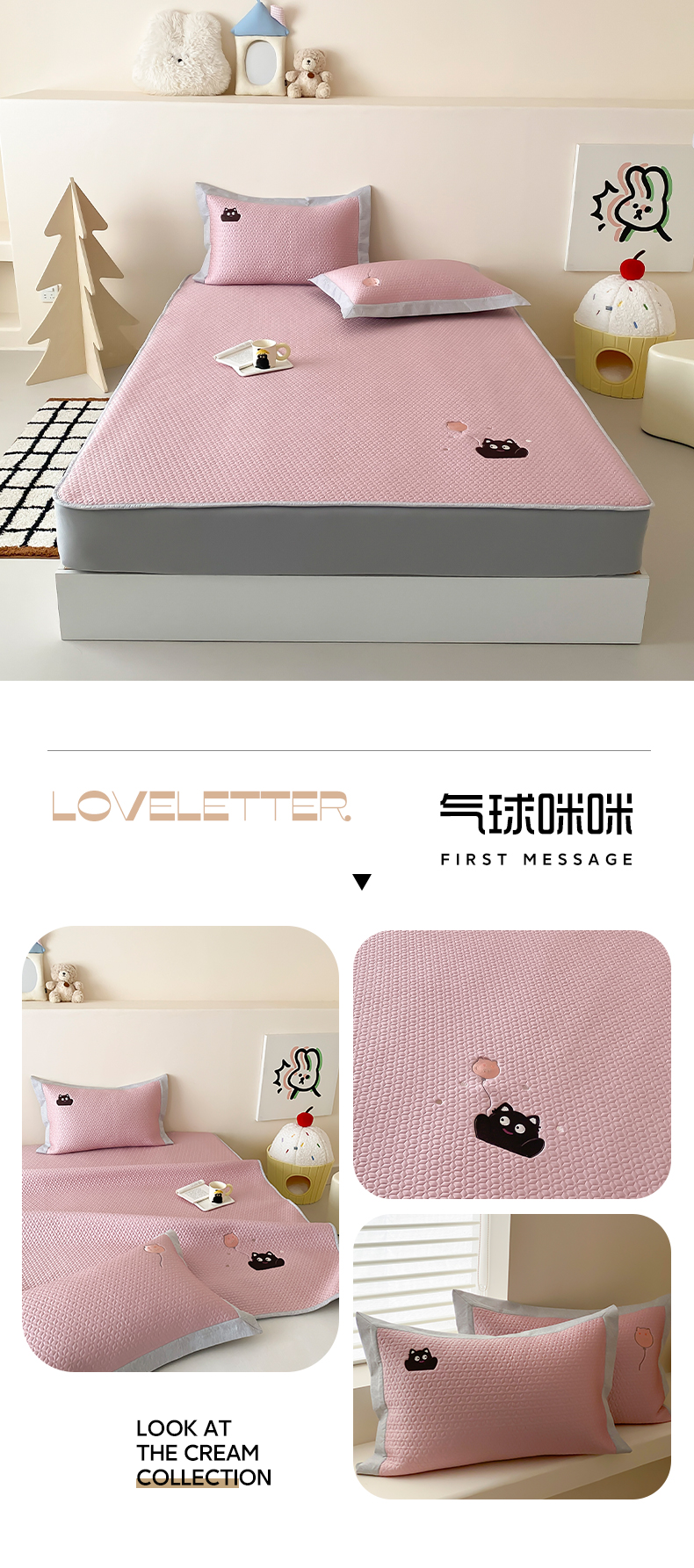 (总)由有家居 2025新款原创新品A类PE高凉感分子卡通毛巾绣豆豆凉席三件套,蛋糕熊,鳄鱼卡卡,咖啡猫,气球兔兔,三个伙伴