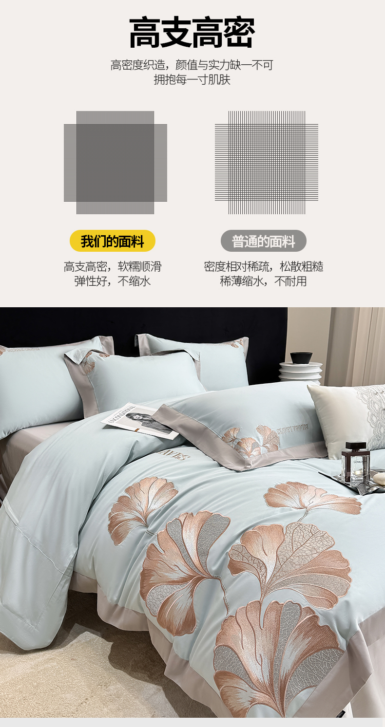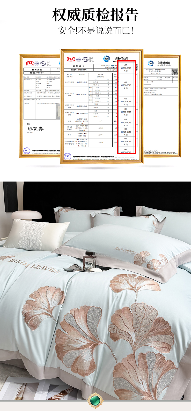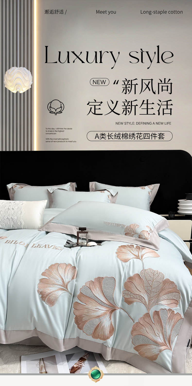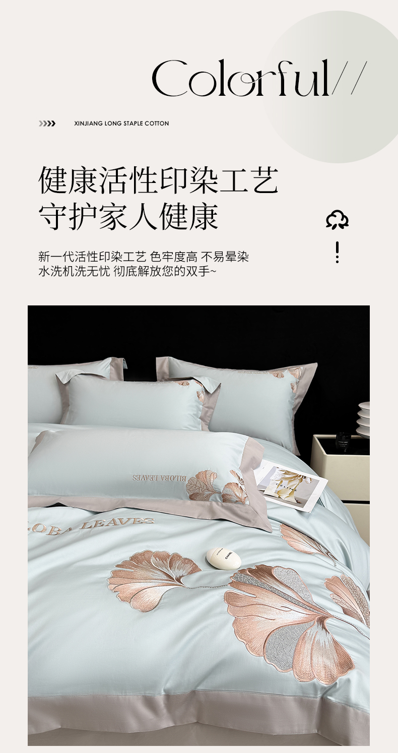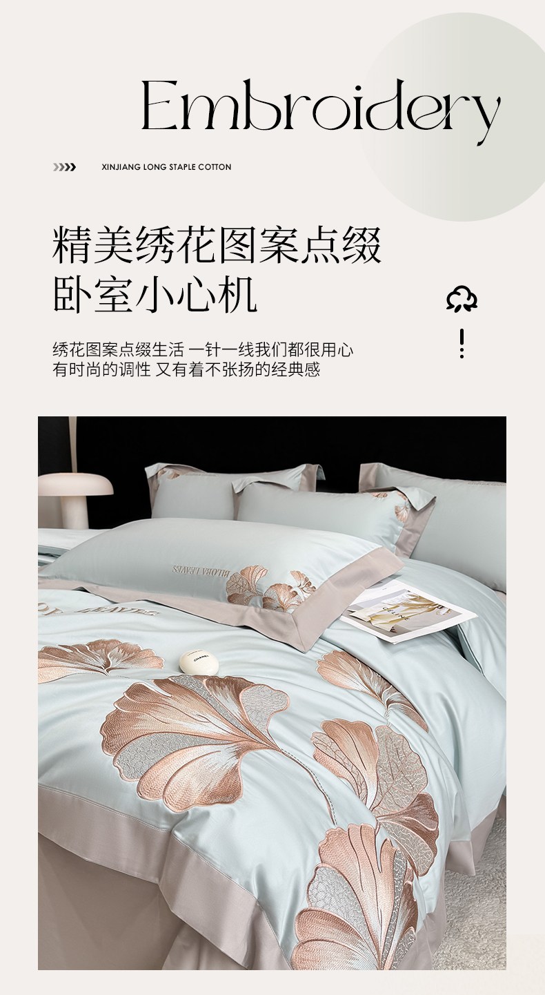 商品名称:家居1号 2025新款a类长绒棉绣花四件套 金色银杏-苹果绿