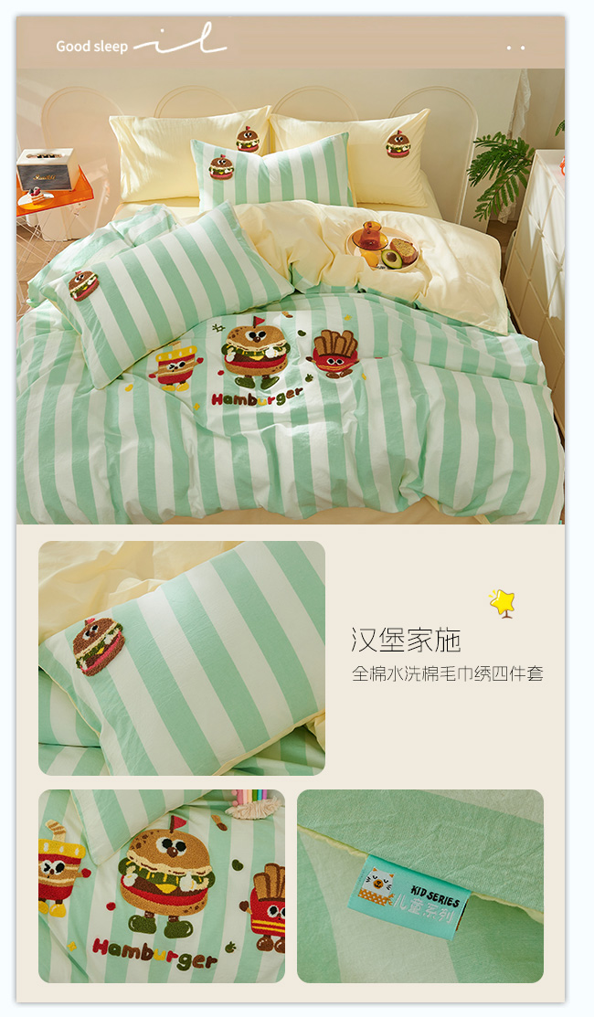 当前位置: 91家纺网 > 商品网购 > 床品套件 > 四件套 > 毛巾绣四件套 > 徕米家居 2025新款色织全棉水洗棉毛巾绣四件套 汉堡家族