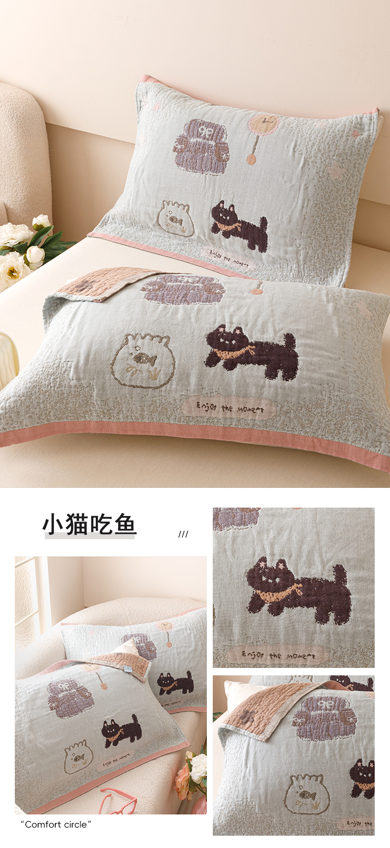 商品名称:2025新款纯棉全棉纱布枕巾一对装全棉四层纱布 小猫吃鱼
