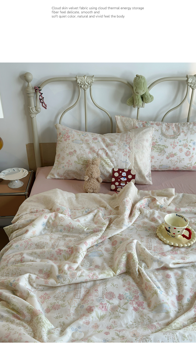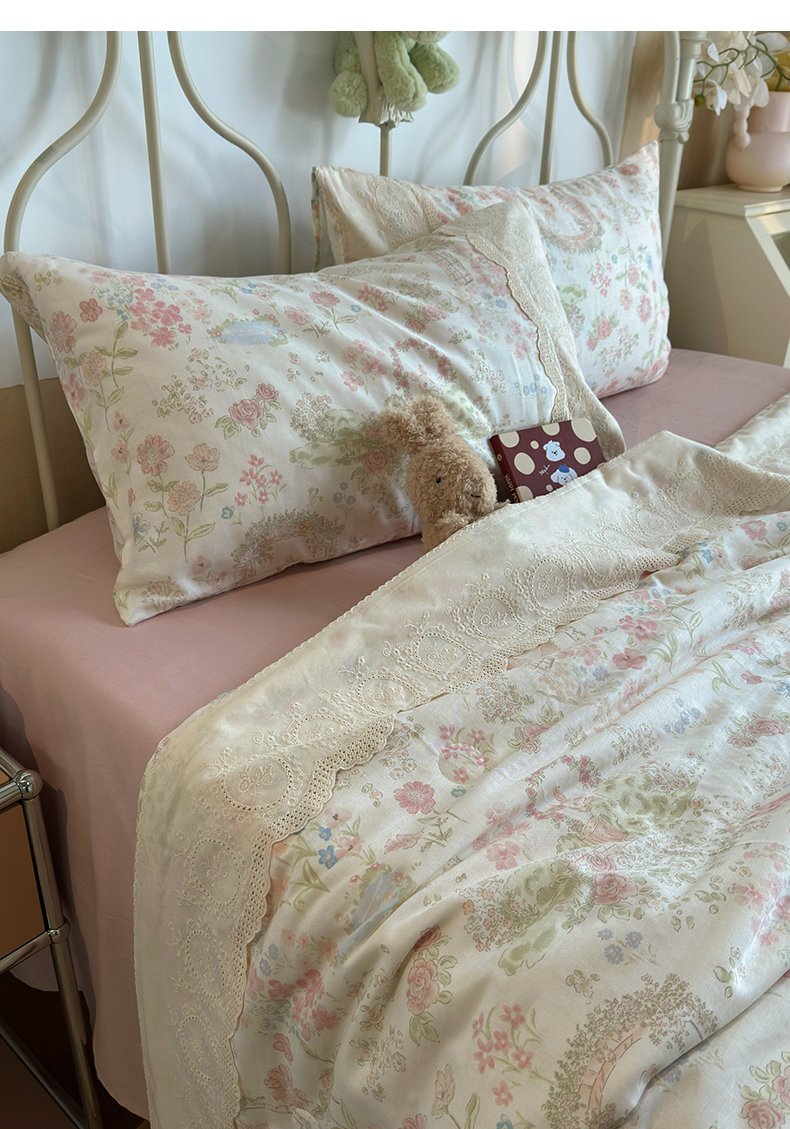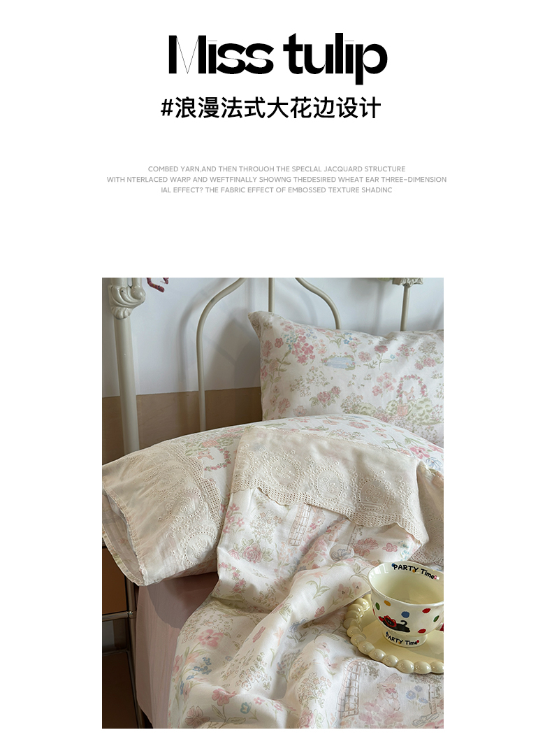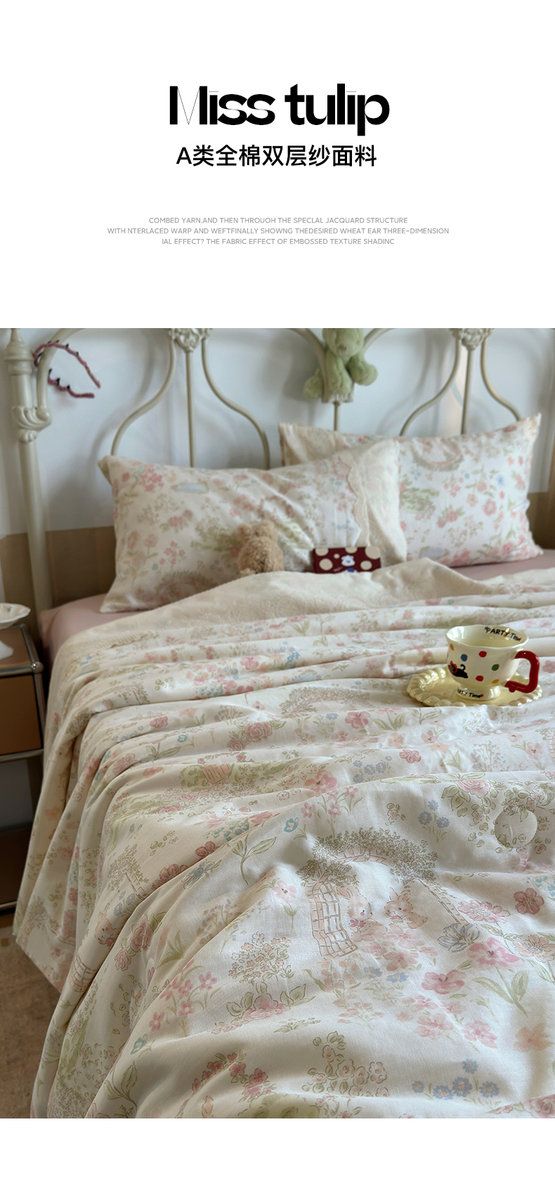 当前位置: 91家纺网 > 商品网购 > 床品套件 > 四件套 > 夏被四件套 > 绫韵家纺 2025夏季新品A类全棉纯棉双层纱法式大花边夏被空调被四件套 庄园秘境