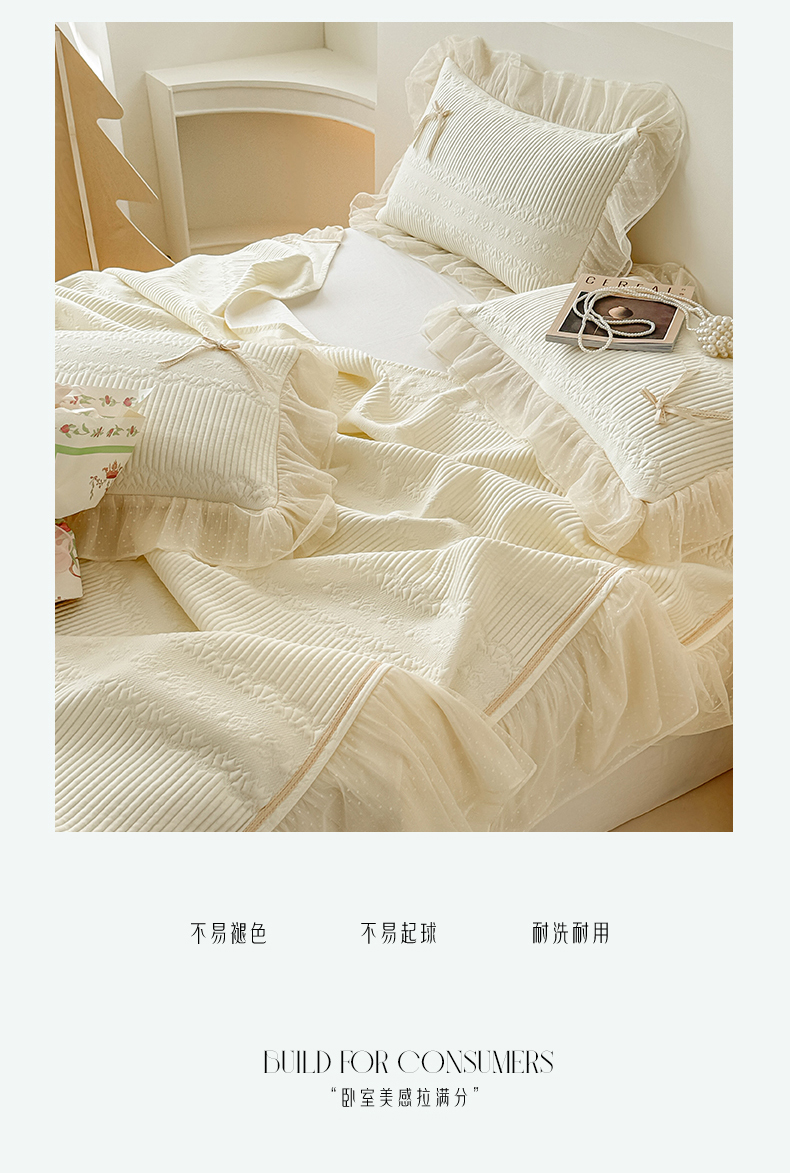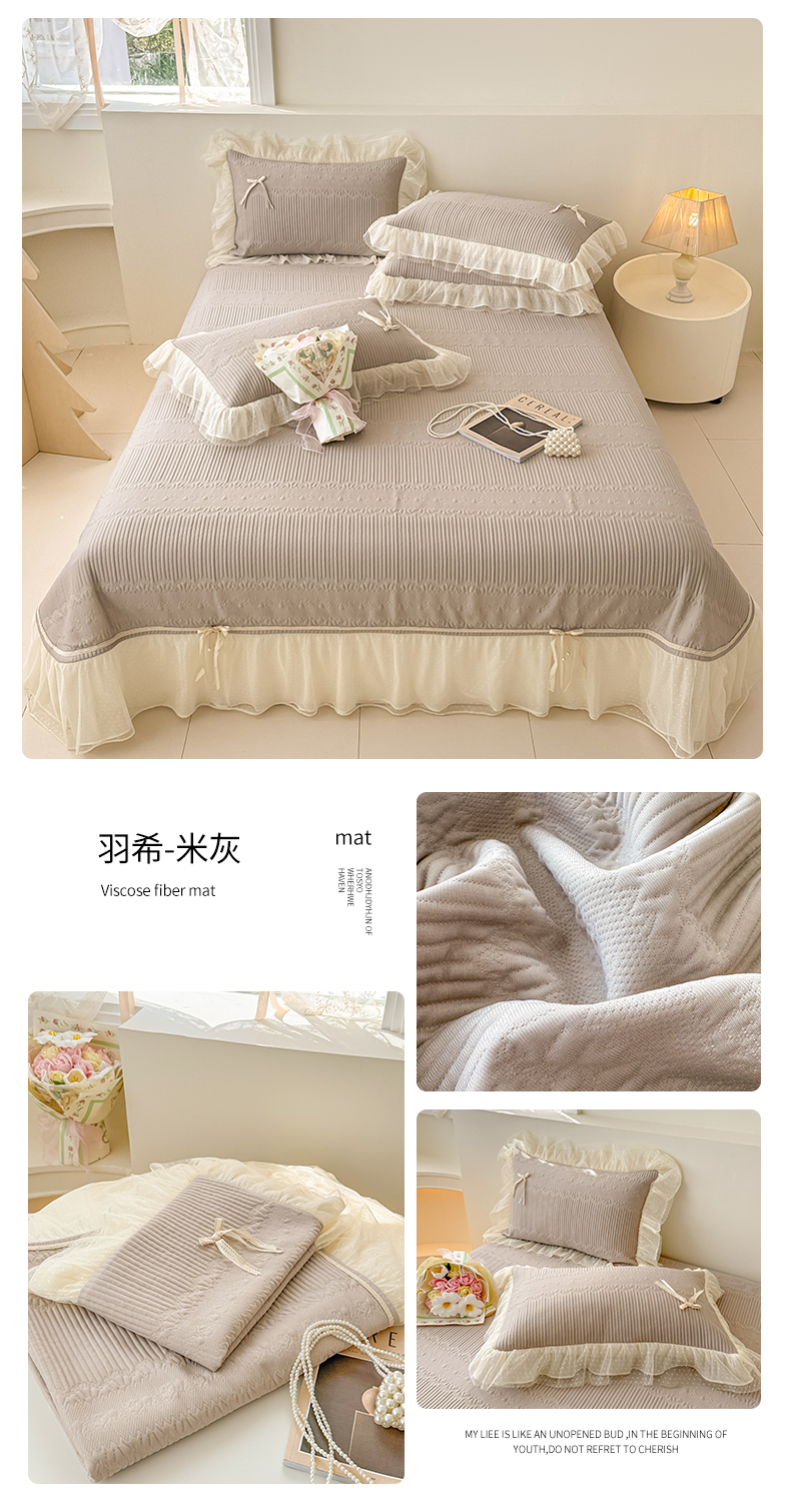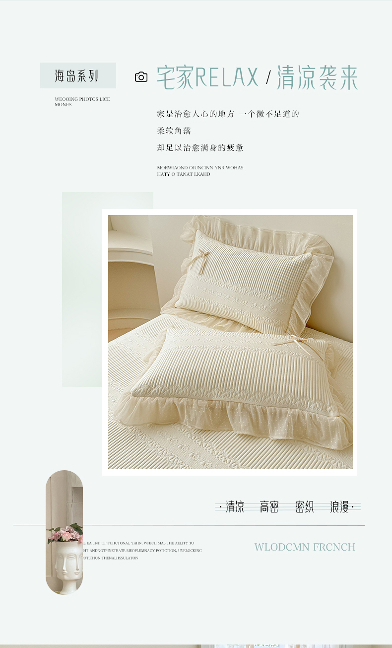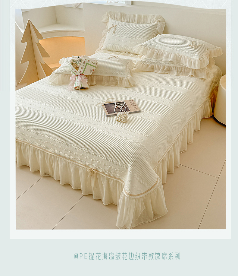 蓝邻家纺 2025春夏新款PE提花海岛皱花边织带款凉席系列-场景二 羽希-米白
