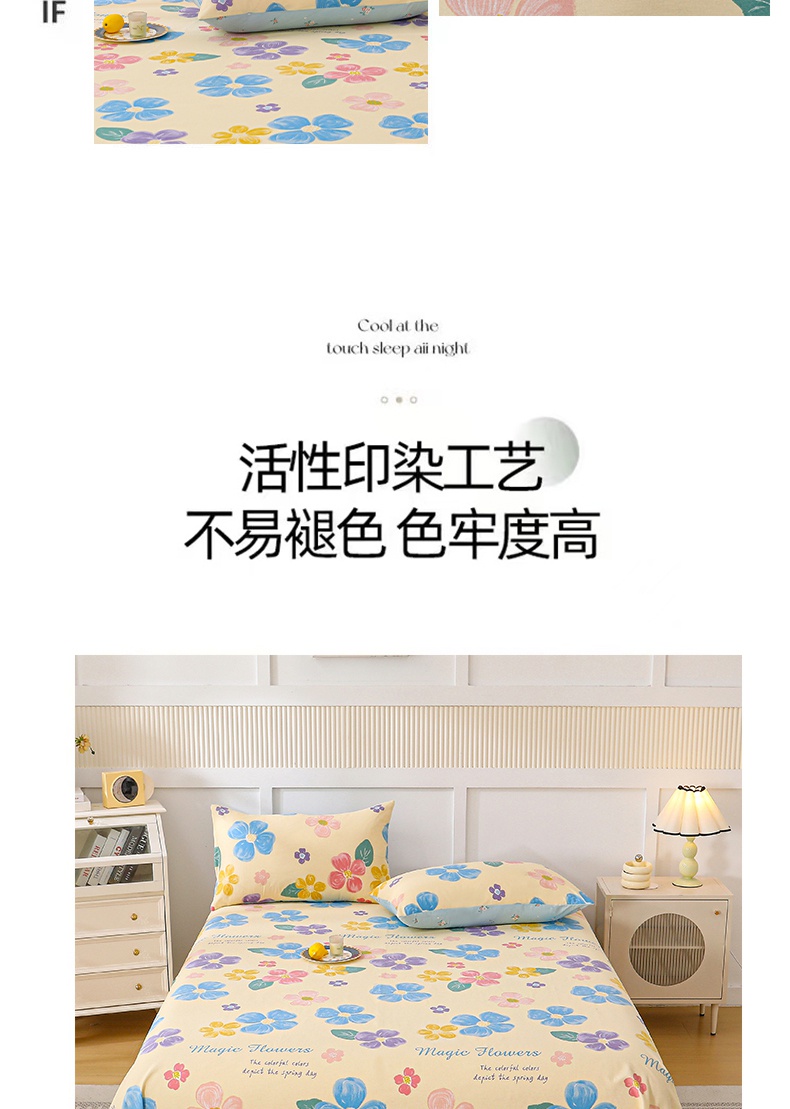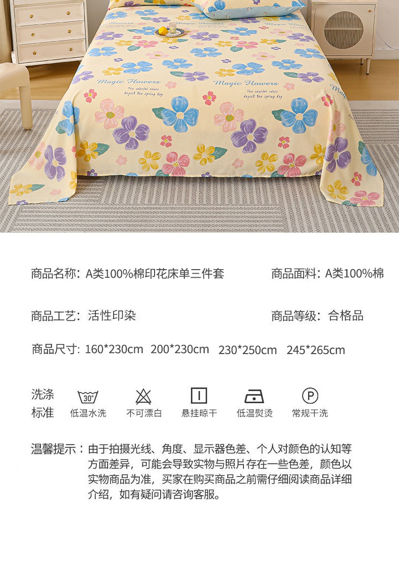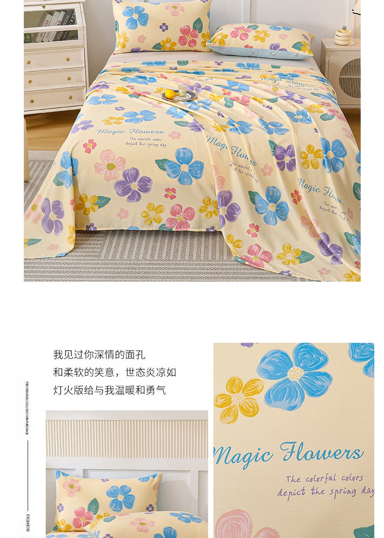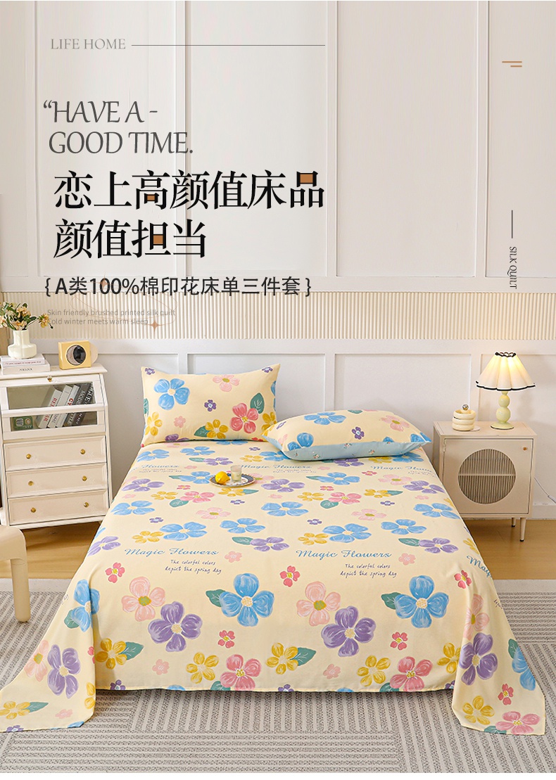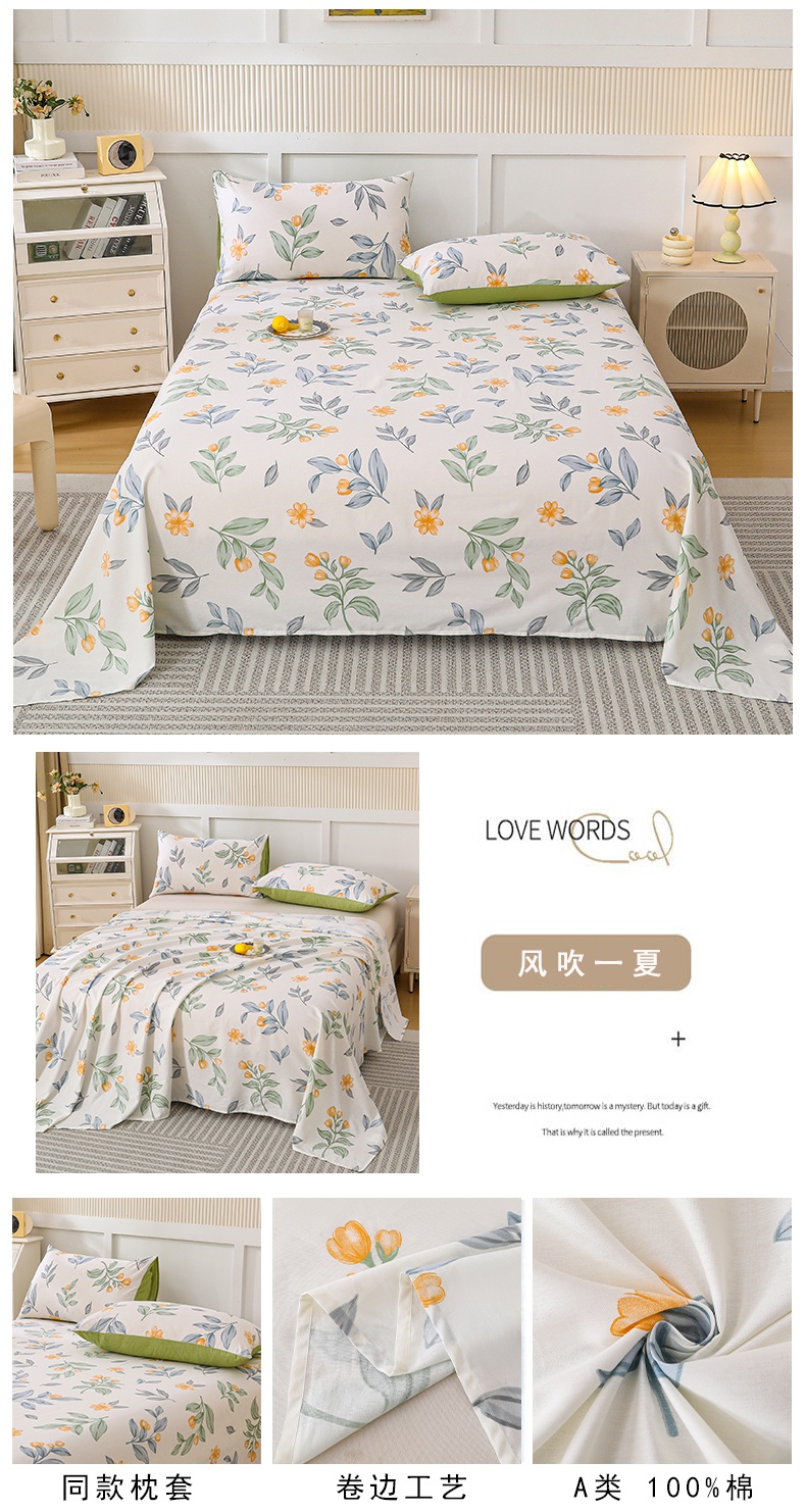 商品名称:宇彬家纺 2025直播新款13070全棉纯棉印花双人单床单枕套三件套喷气小清新简约学生被单 花屿芷