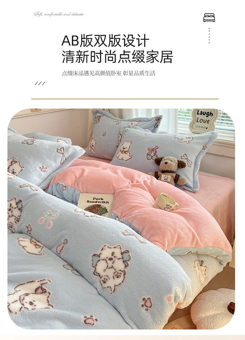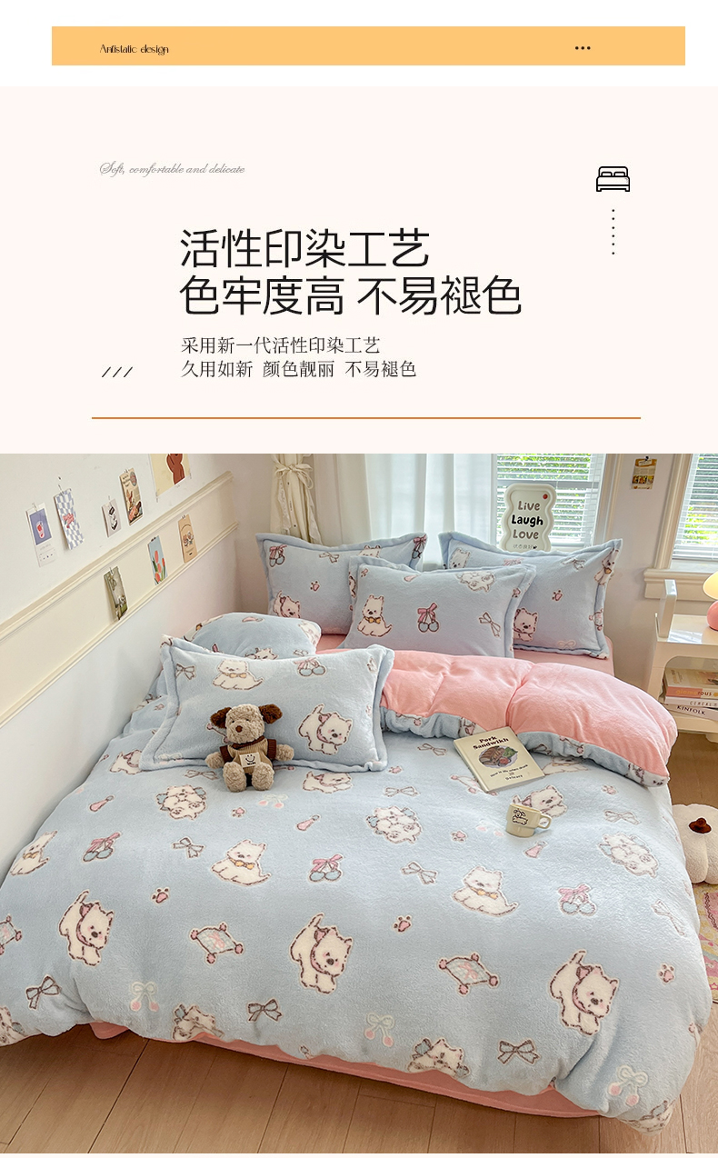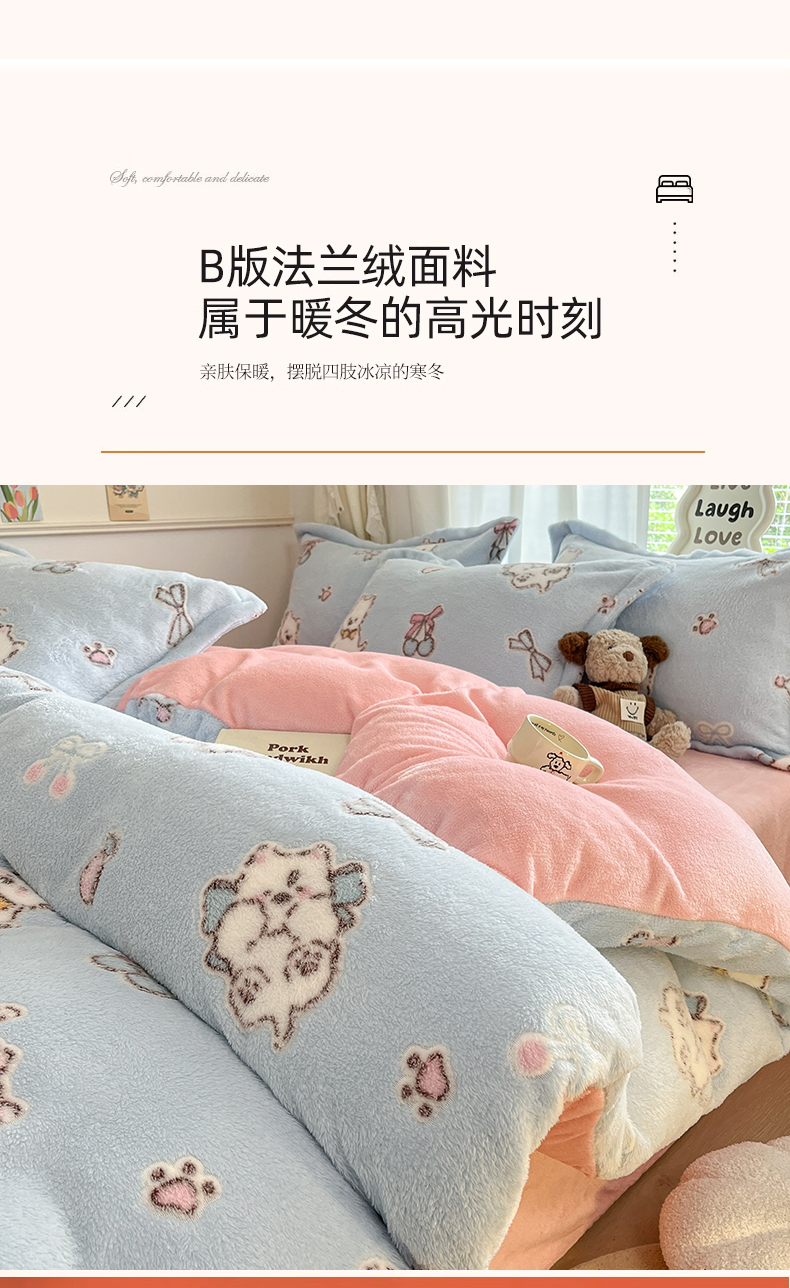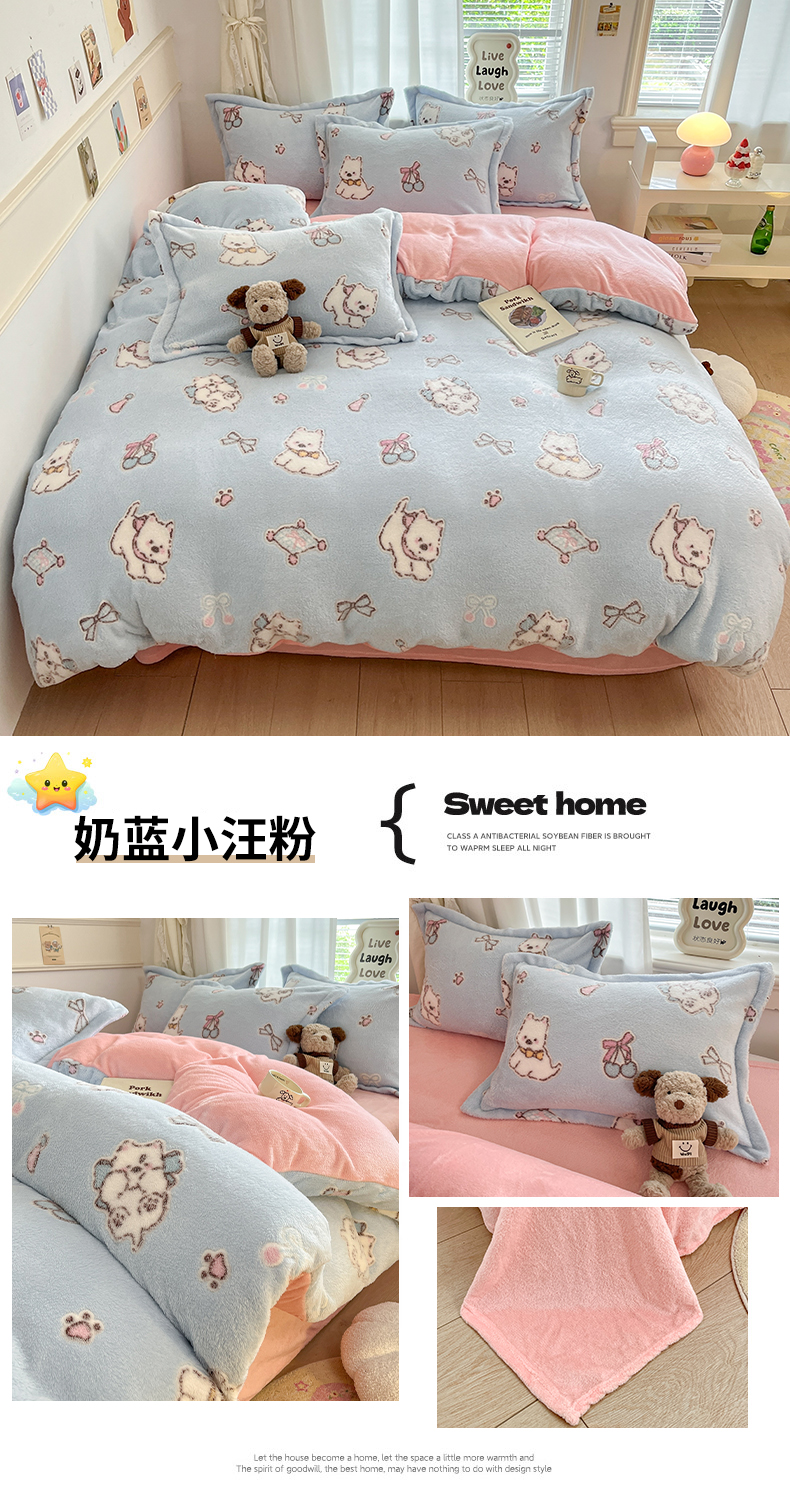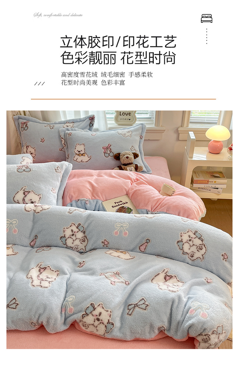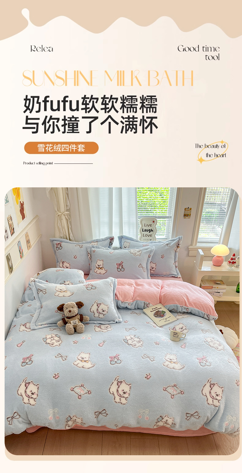 当前位置: 91家纺网 > 商品网购 > 床品套件 > 四件套 > 法莱绒四件套 > 川悦生活2025新款立体雪花绒印花大床四件套系列二场景二 奶蓝小汪粉