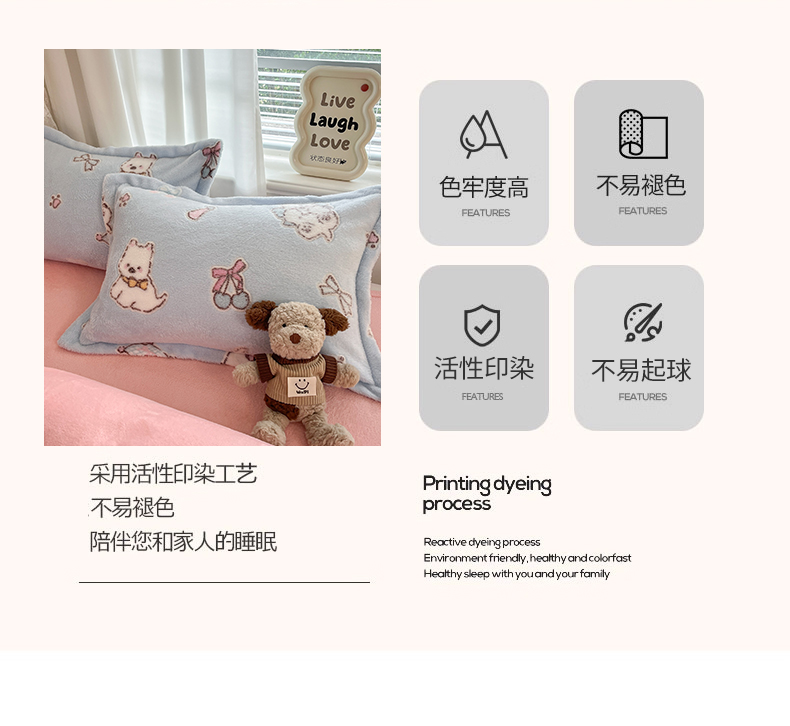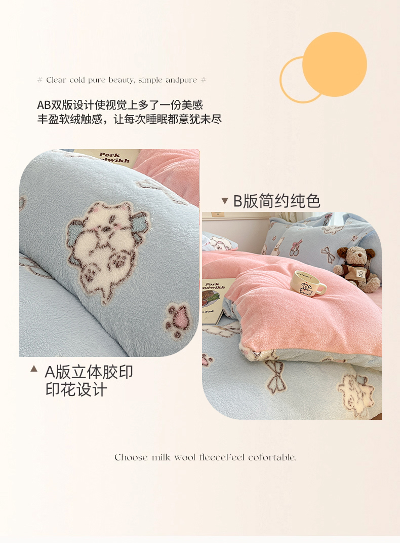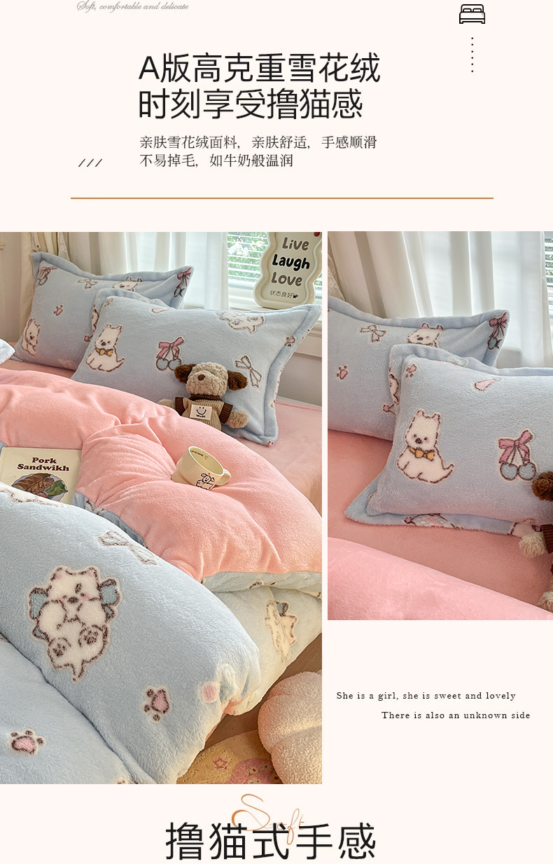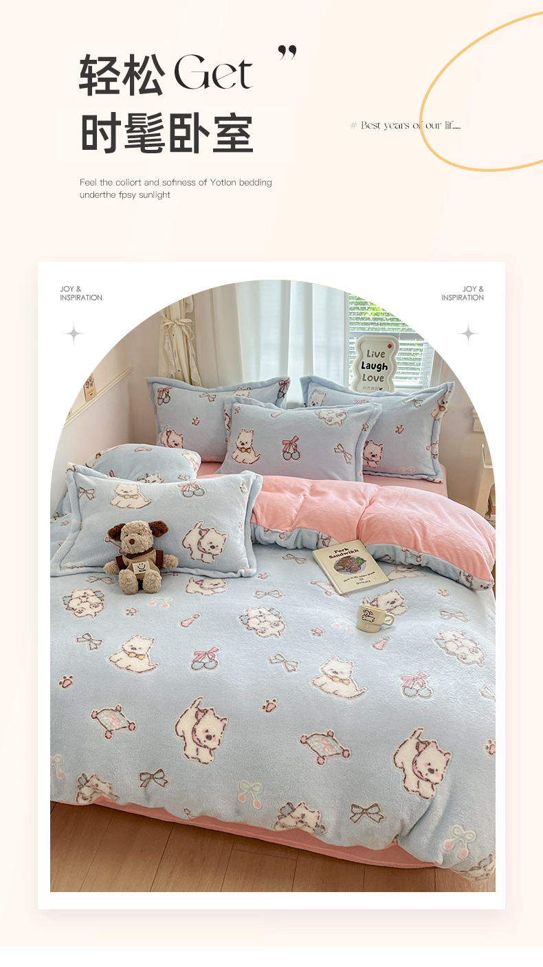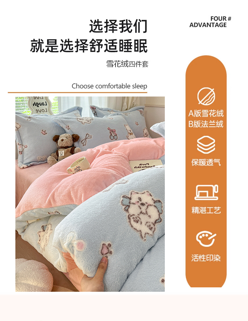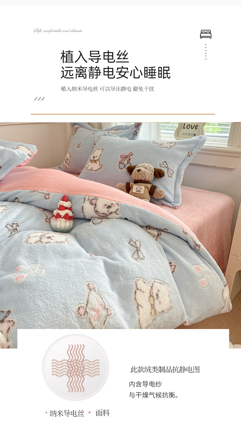 当前位置: 91家纺网 > 商品网购 > 床品套件 > 四件套 > 法莱绒四件套 > 川悦生活2025新款立体雪花绒印花大床四件套系列二场景二 奶蓝小汪粉