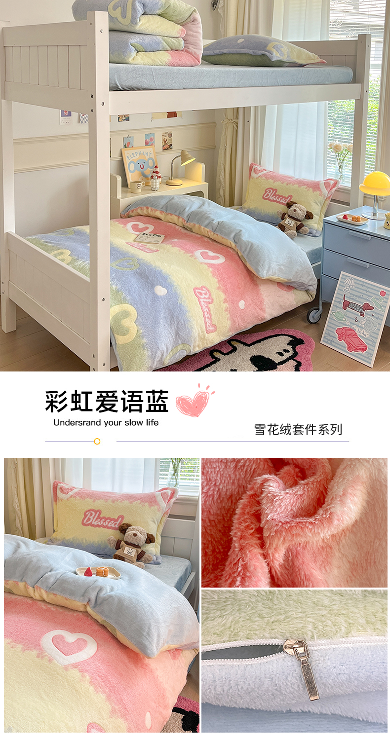 当前位置: 91家纺网 > 商品网购 > 床品套件 > 四件套 > 法莱绒四件套 > 川悦生活 2025新款立体雪花绒印花四件套学生床系列一场景二 彩虹爱语蓝