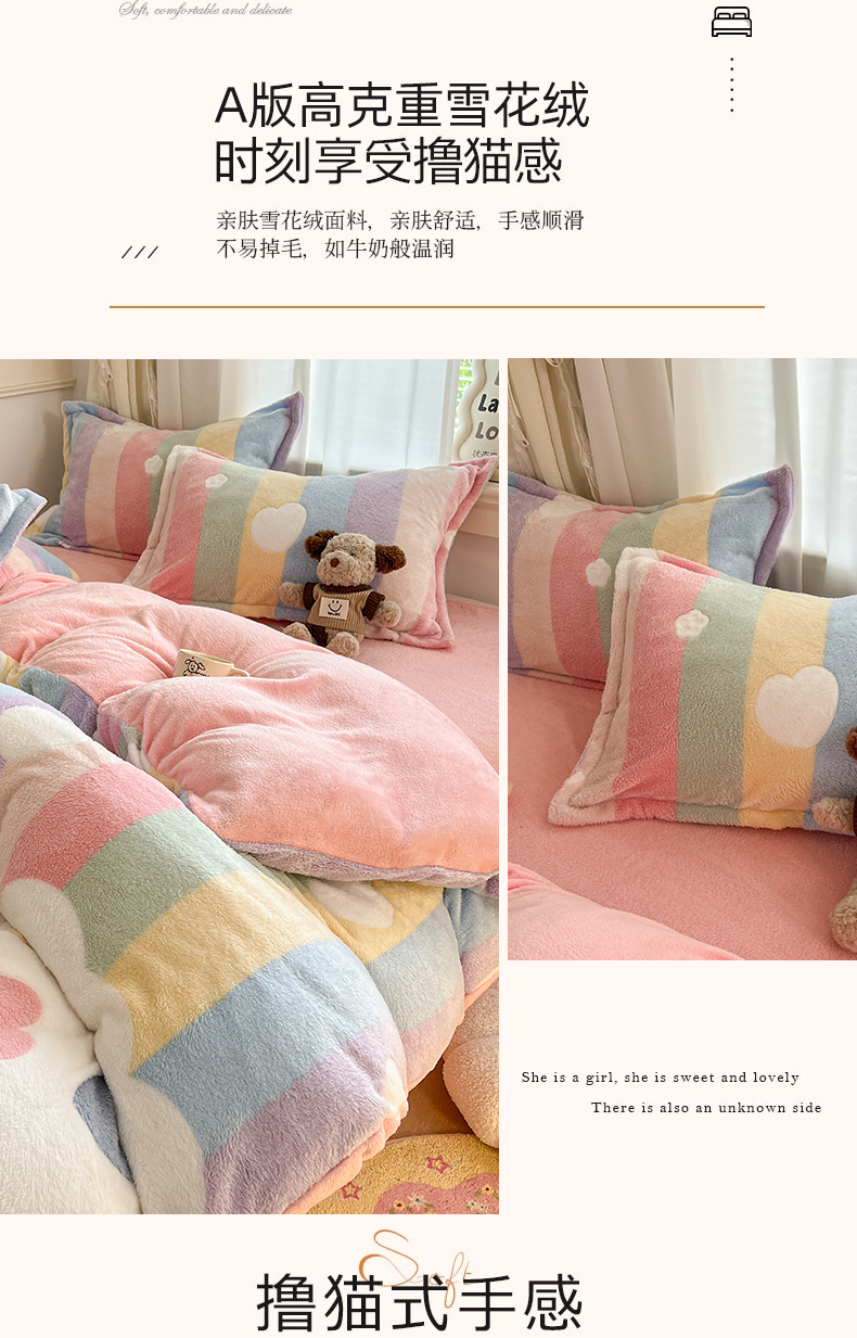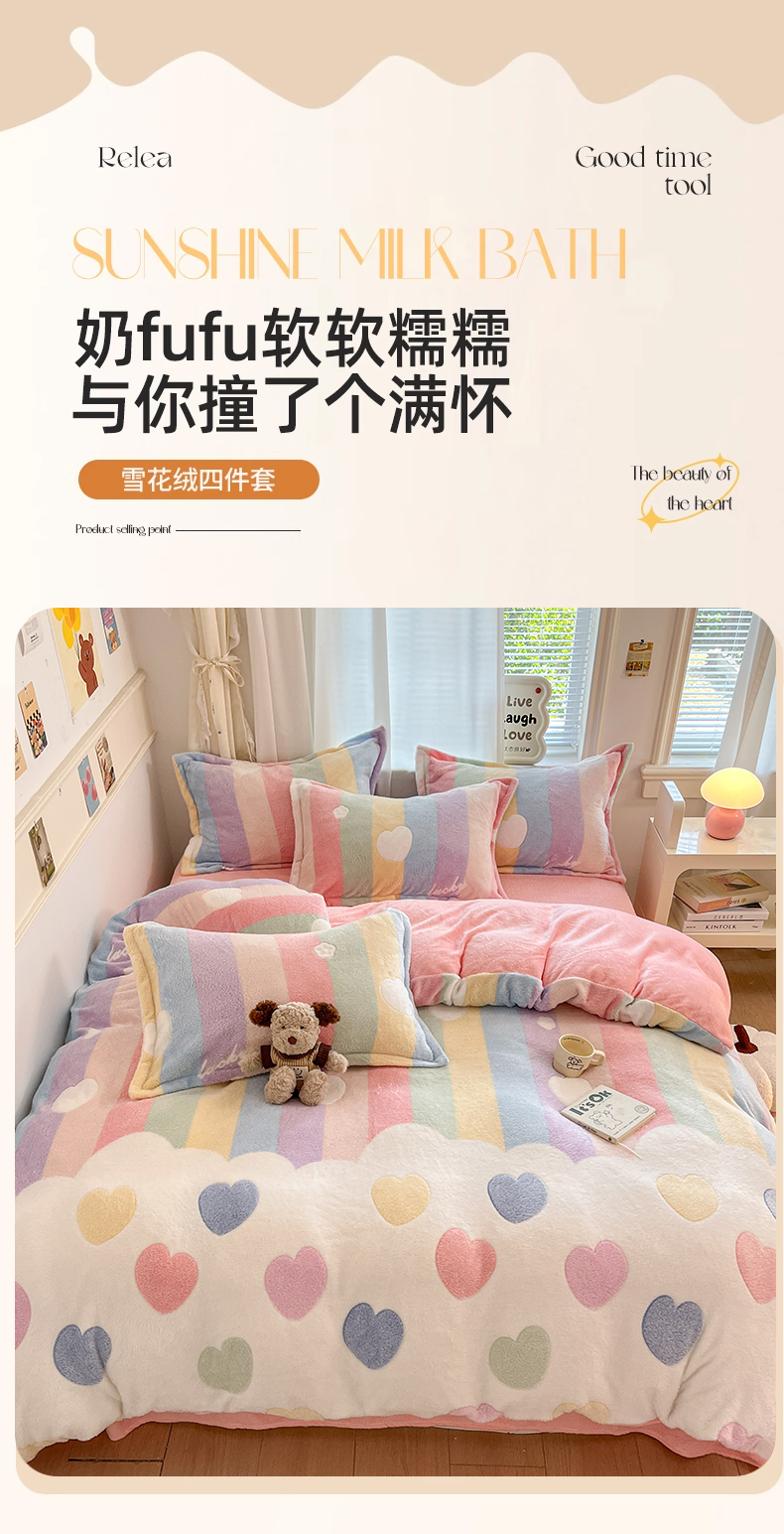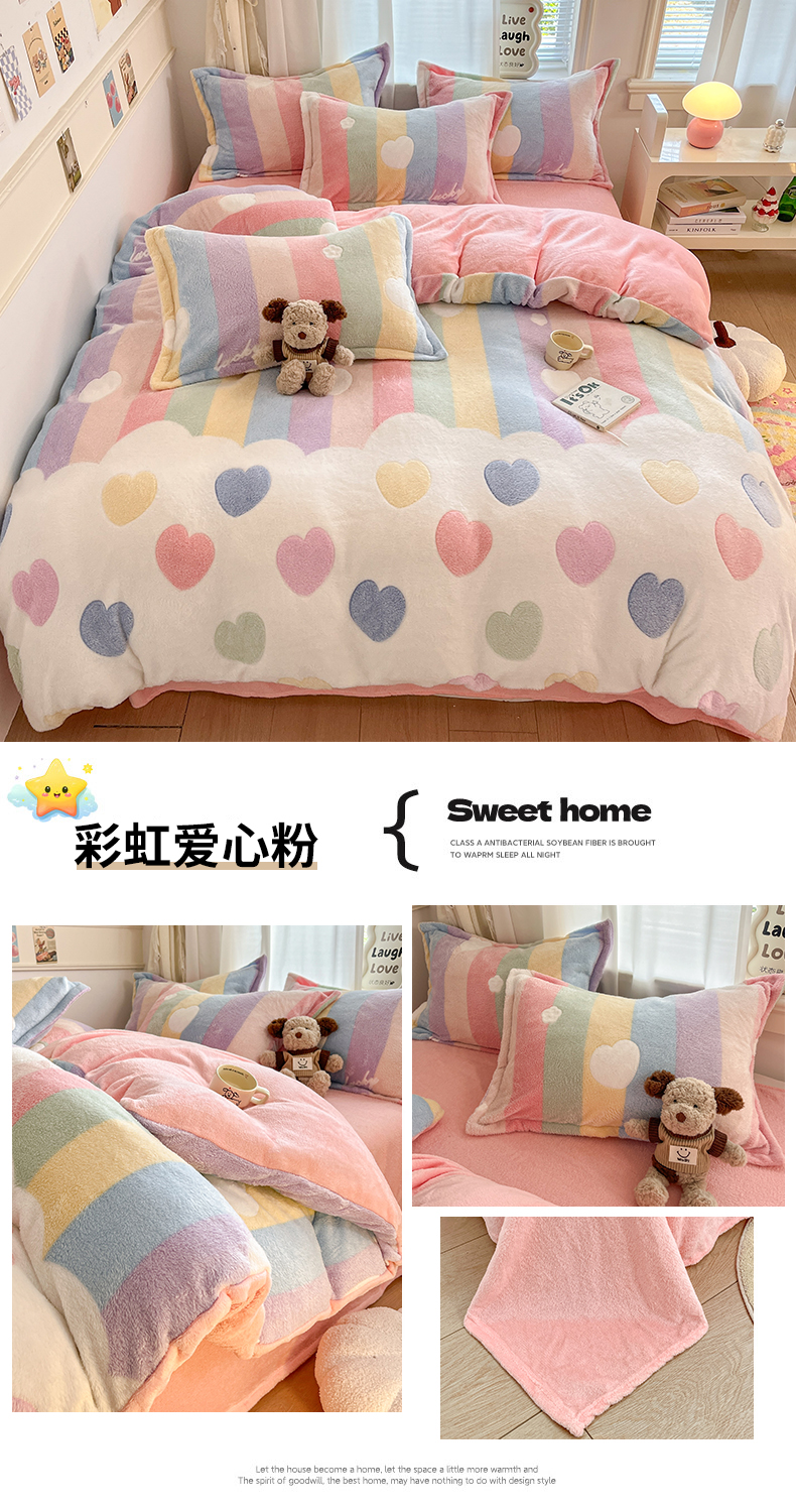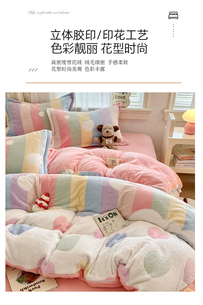 当前位置: 91家纺网 > 商品网购 > 床品套件 > 四件套 > 法莱绒四件套 > 川悦生活 2025新款立体雪花绒印花大床四件套系列一场景二 彩虹爱心粉