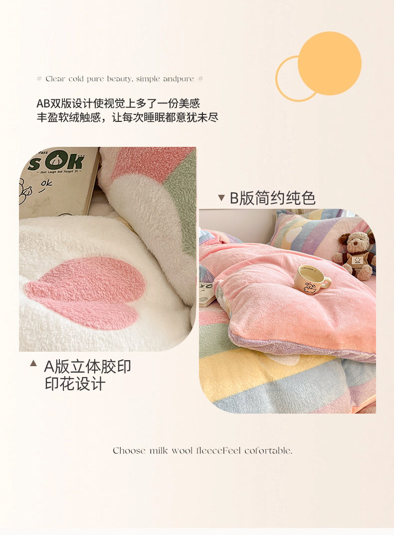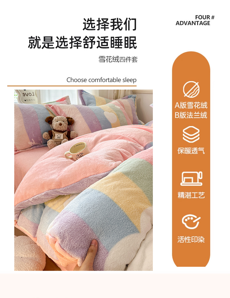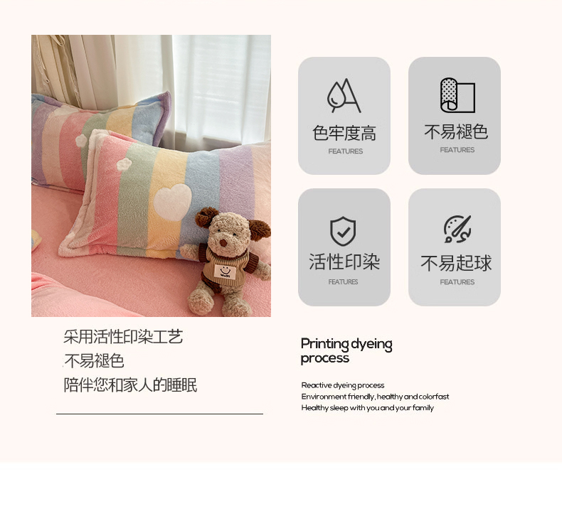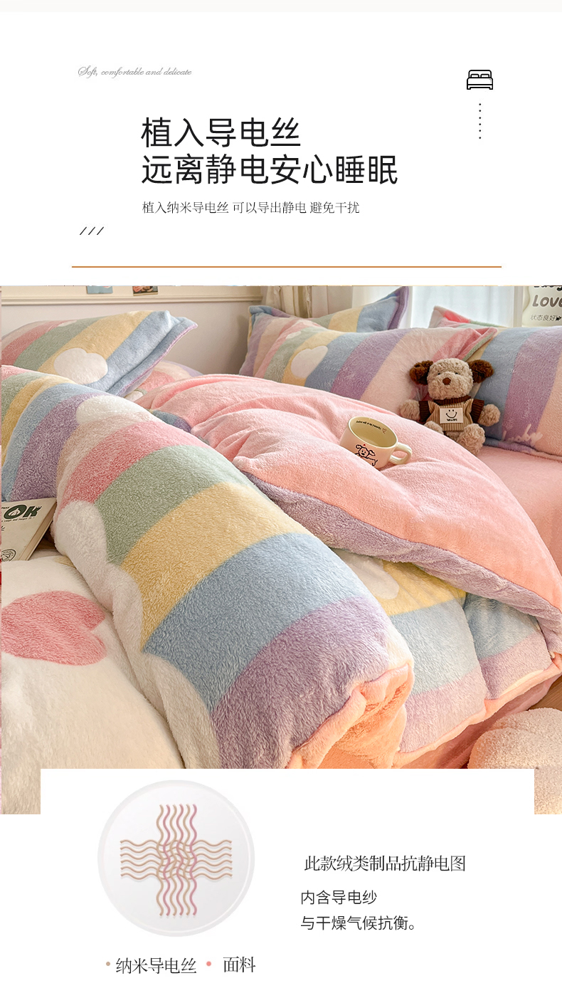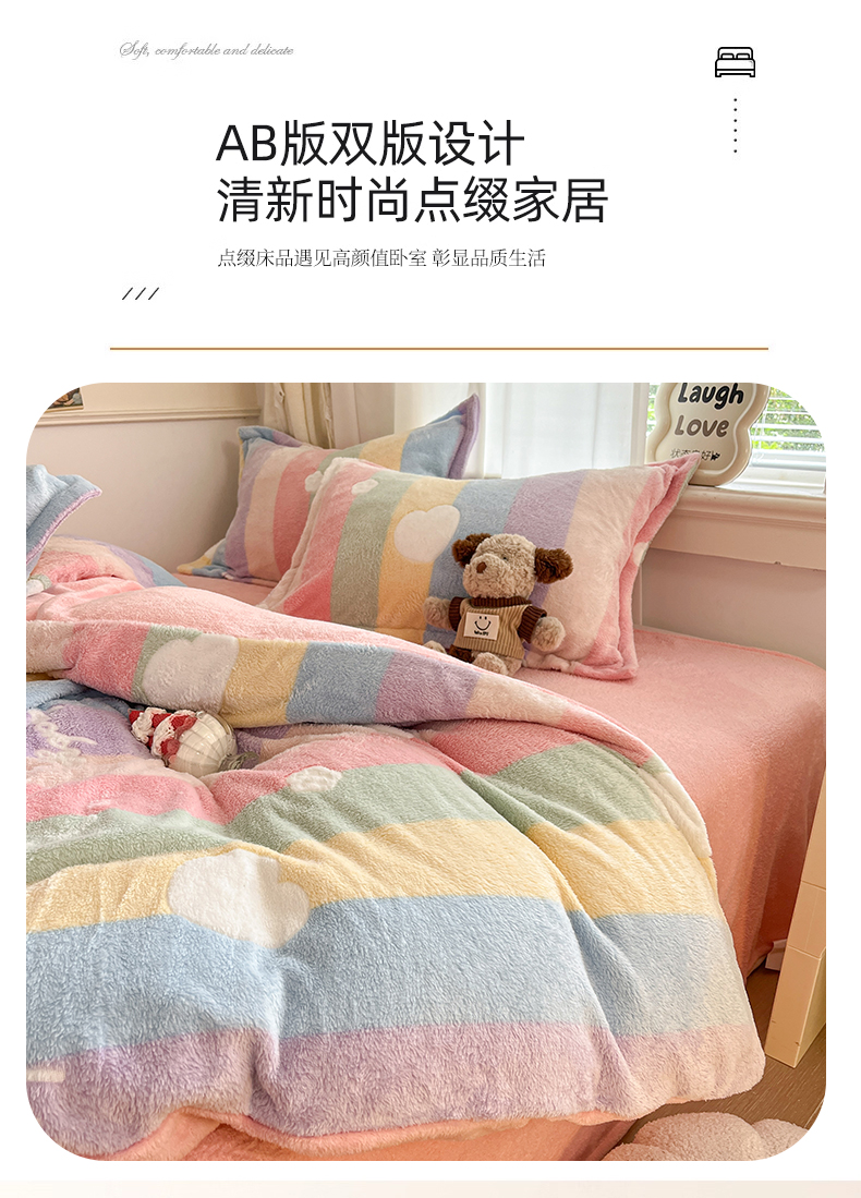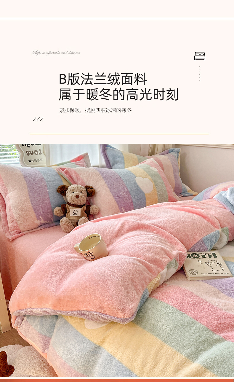 当前位置: 91家纺网 > 商品网购 > 床品套件 > 四件套 > 法莱绒四件套 > 川悦生活 2025新款立体雪花绒印花大床四件套系列一场景二 彩虹爱心粉