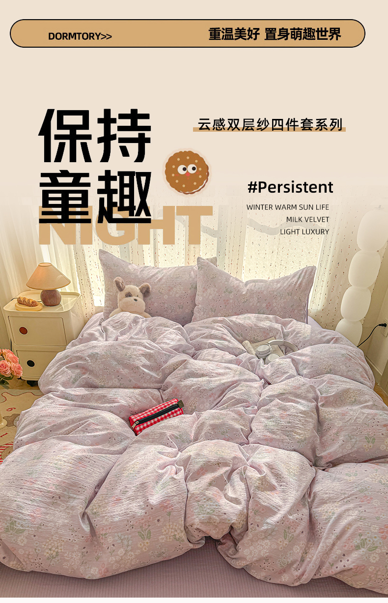 当前位置: 91家纺网 > 商品网购 > 床品套件 > 四件套 > 双层纱四件套 > 艾特你 2025新款云感双层纱卡通萌趣四件套 遇见-夕颜
