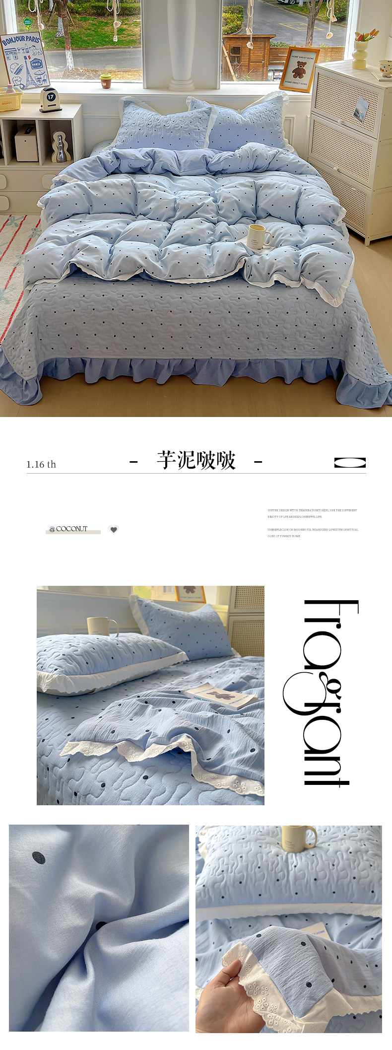 商品名称:美梦家纺 2025新款皱皱纱花边夹棉床盖四件套 港尾咖啡汪