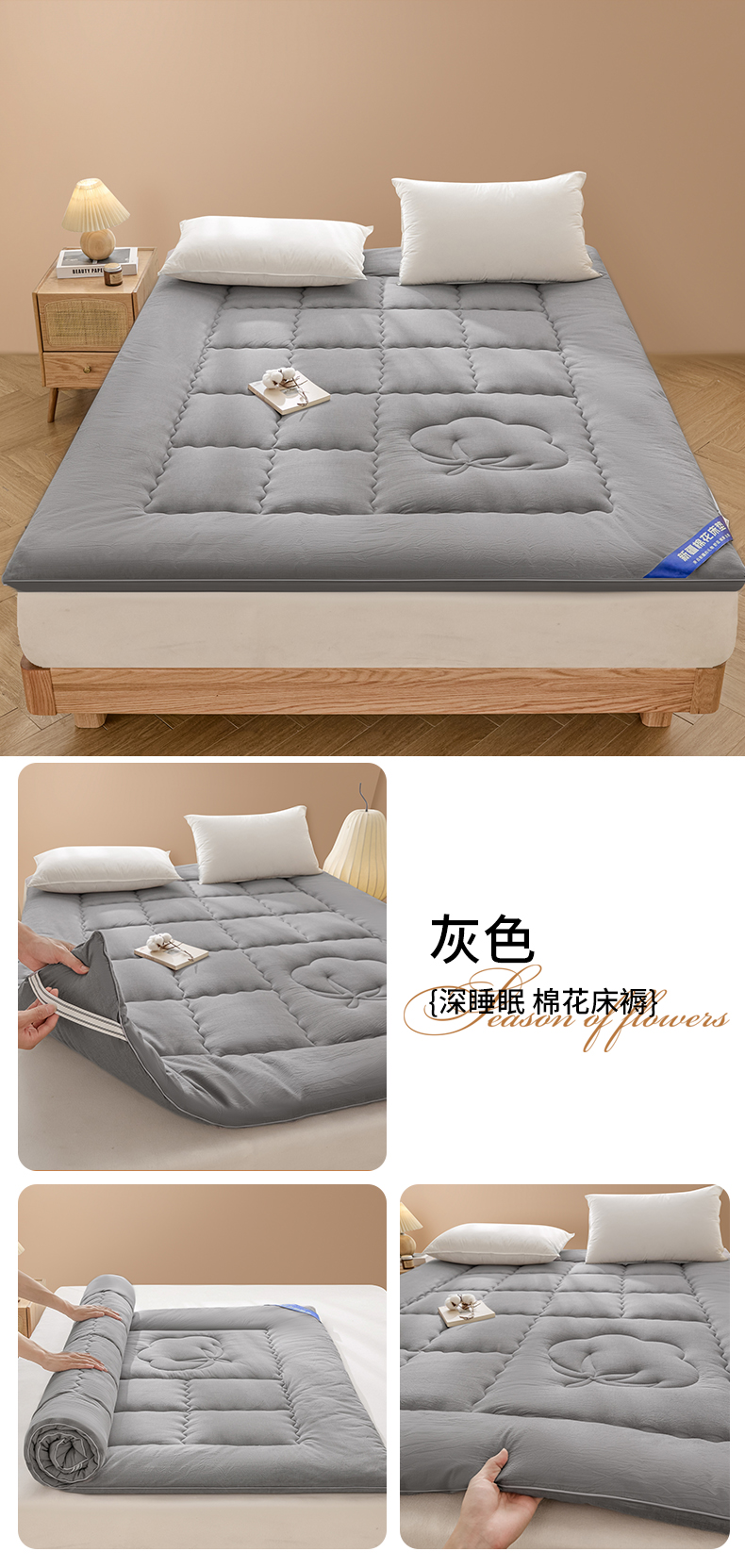 (总)悠米悠家 2025新款亲肤加厚棉花夹棉床褥,白色,粉色,灰色,蓝色