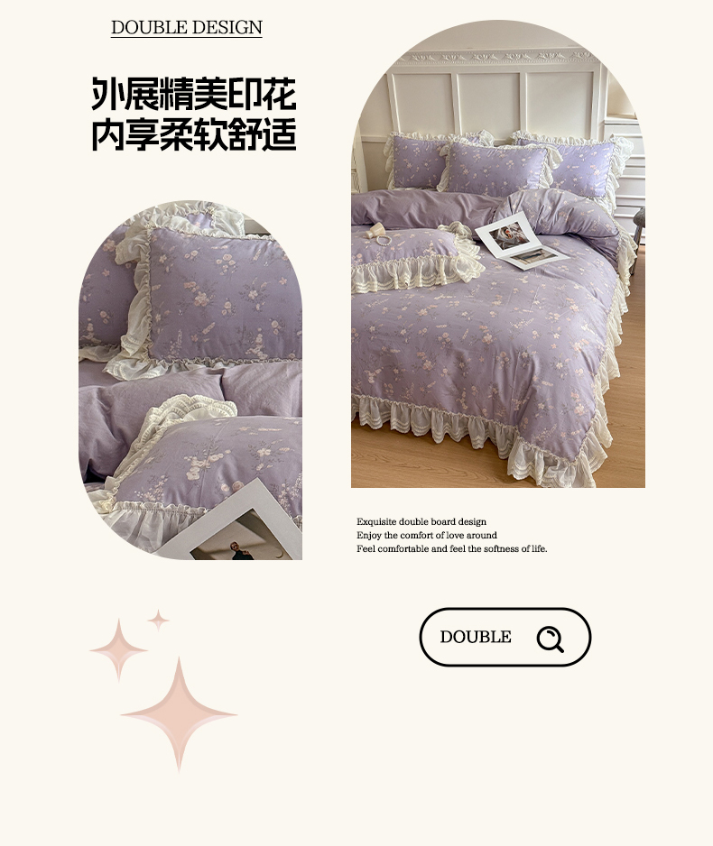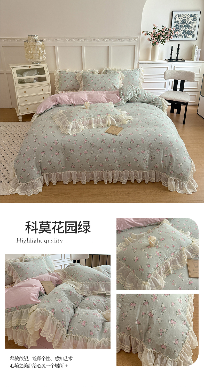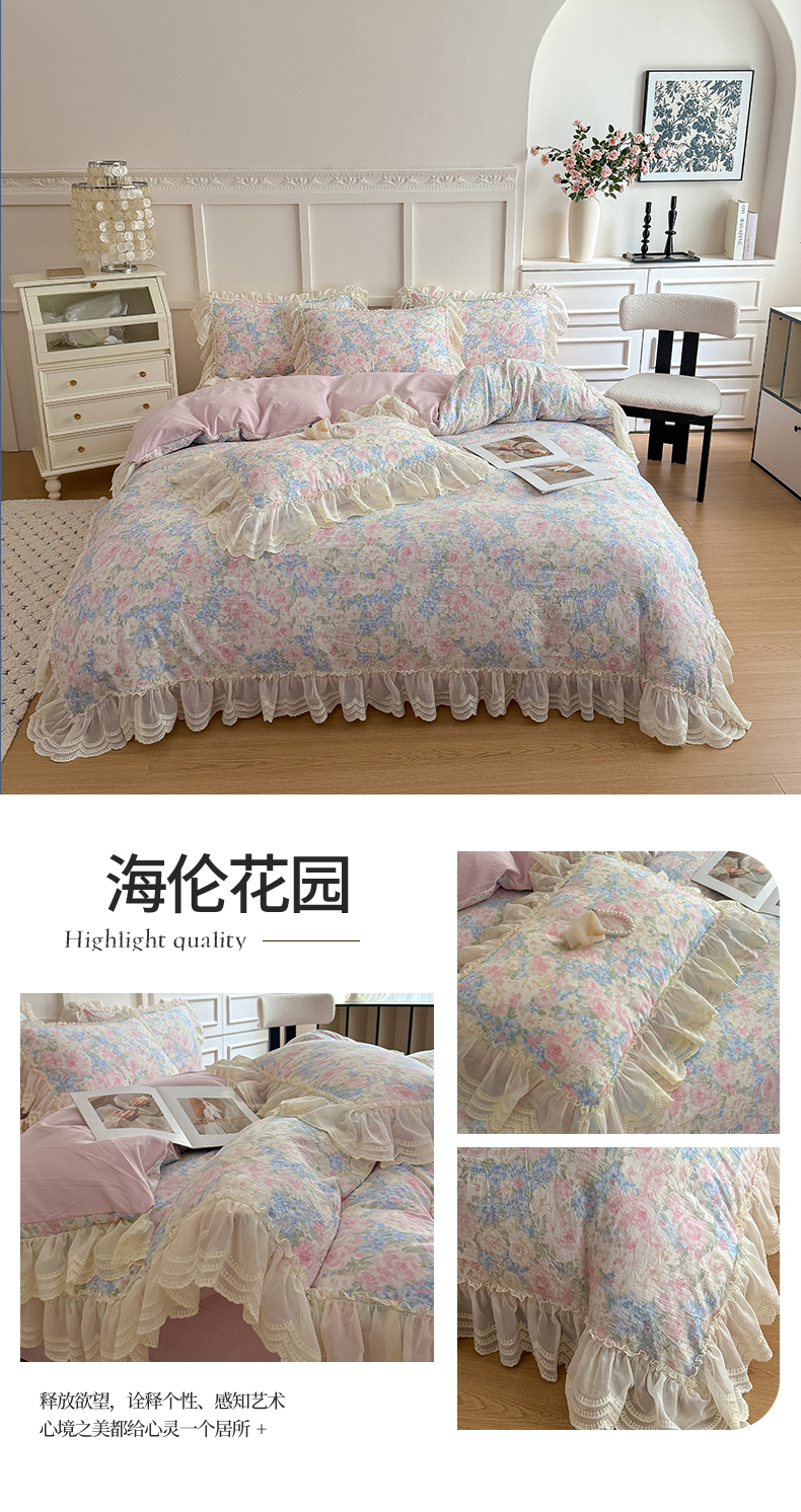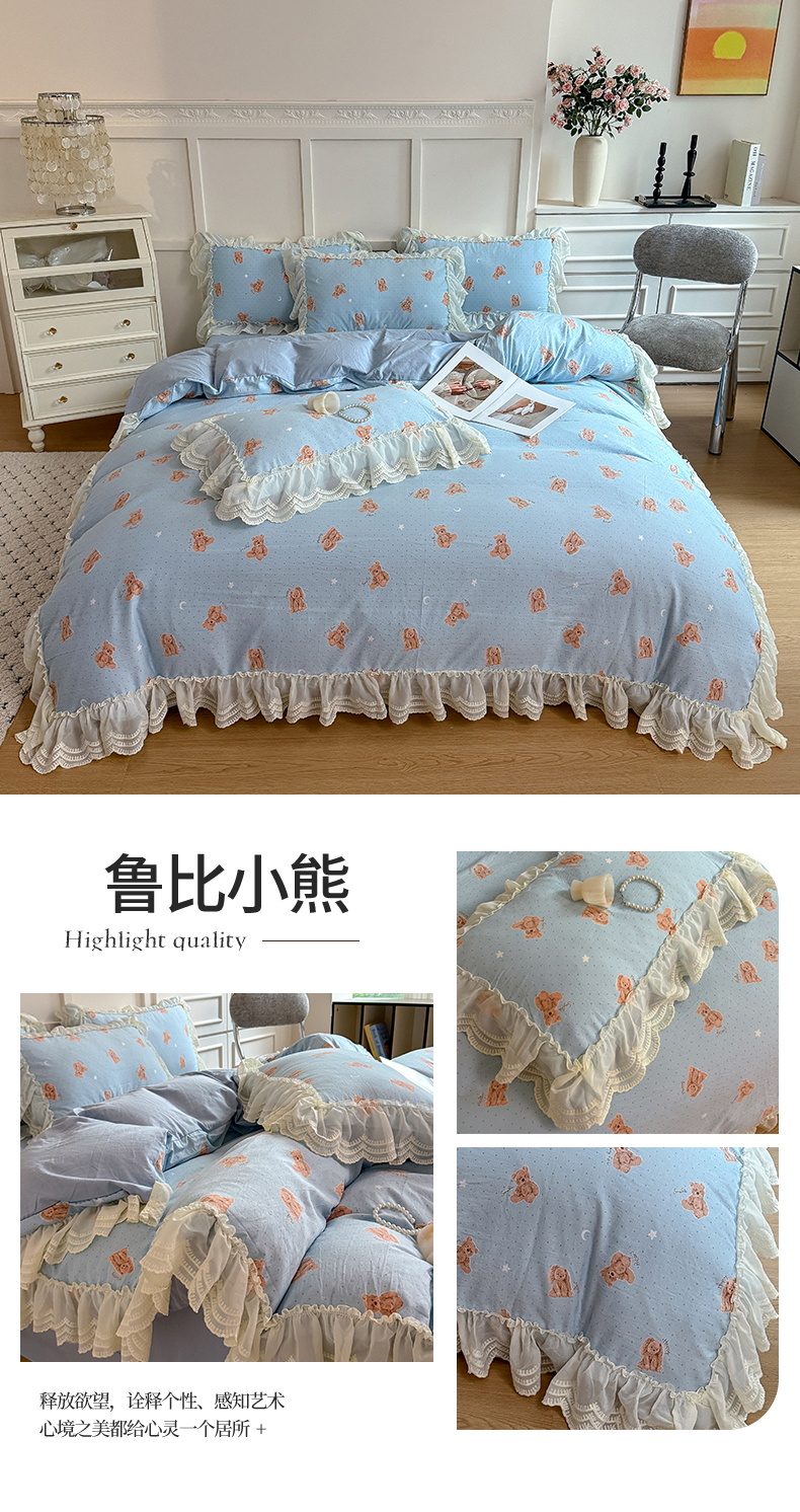 (总)吾欢心 2026春夏新款古法水洗仿棉韩版双层花边四件套,KT猫,斑马,彩色蝴蝶结,卡通小狗,可爱星星人,萌宠宝贝,秘境花园,奶萌小狗,田园趣味,汐颜,小草莓,樱桃派