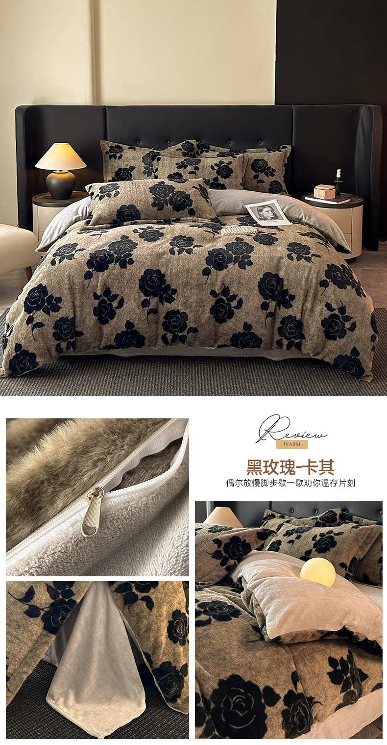 当前位置: 91家纺网 > 商品网购 > 床品套件 > 四件套 > 其它四件套 > 库里梦家纺 2025直播网红爆款轻奢欧美风獭兔毛雕花绒四件套 黑玫瑰-卡其