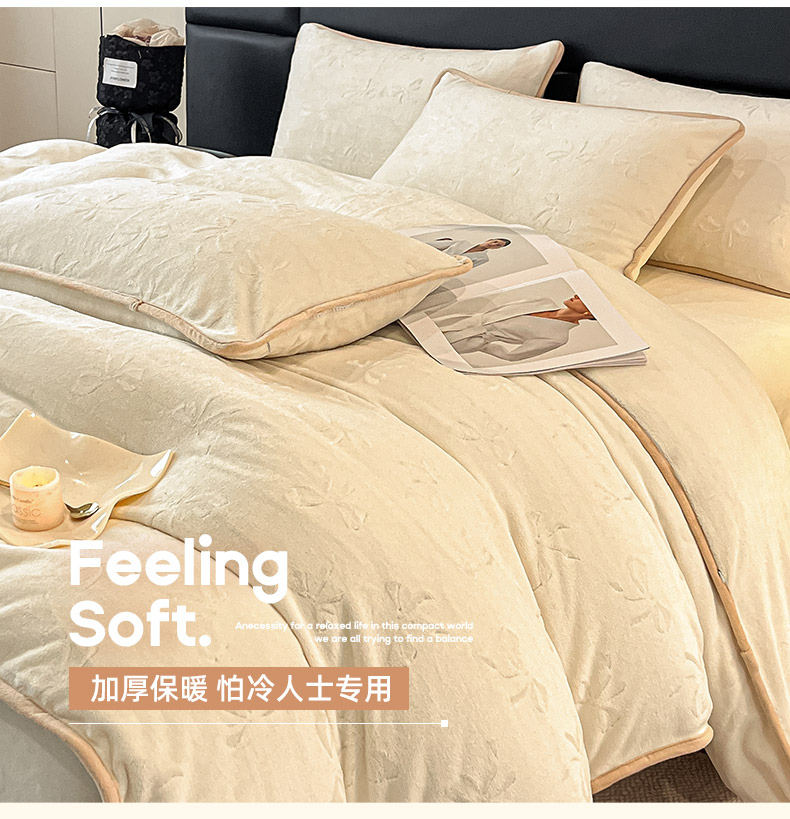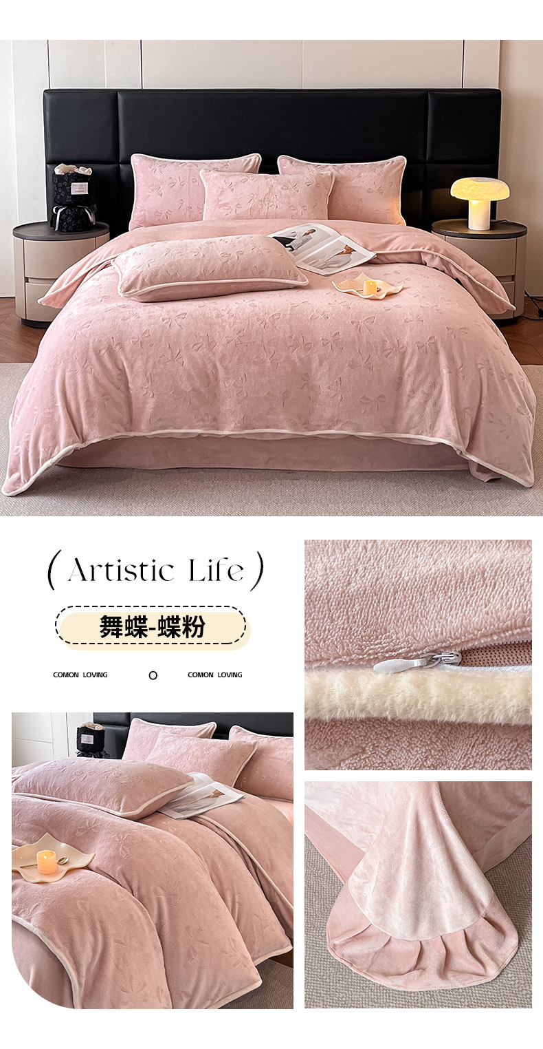 当前位置: 91家纺网 > 商品网购 > 床品套件 > 四件套 > 牛奶绒四件套 > 金阳光家纺 2025新款A类立体雕花蝴蝶结包边款牛奶绒四件套-舞蝶系列 舞蝶-蝶白灰