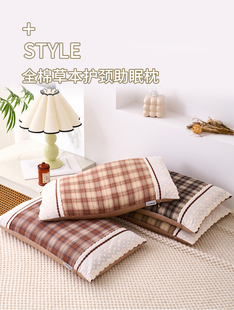 大熊枕芯 2025新款 全棉花边荞麦枕 格子花边-褐