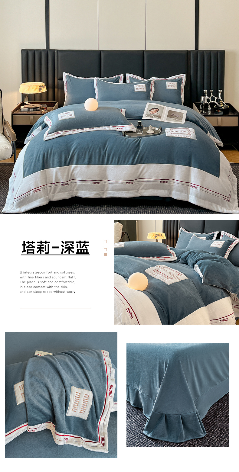 商品名称:苹果星家纺 2025新款无印良品风230克全消光牛奶绒大拼角压线刺绣四件套-塔莉 塔莉-深蓝