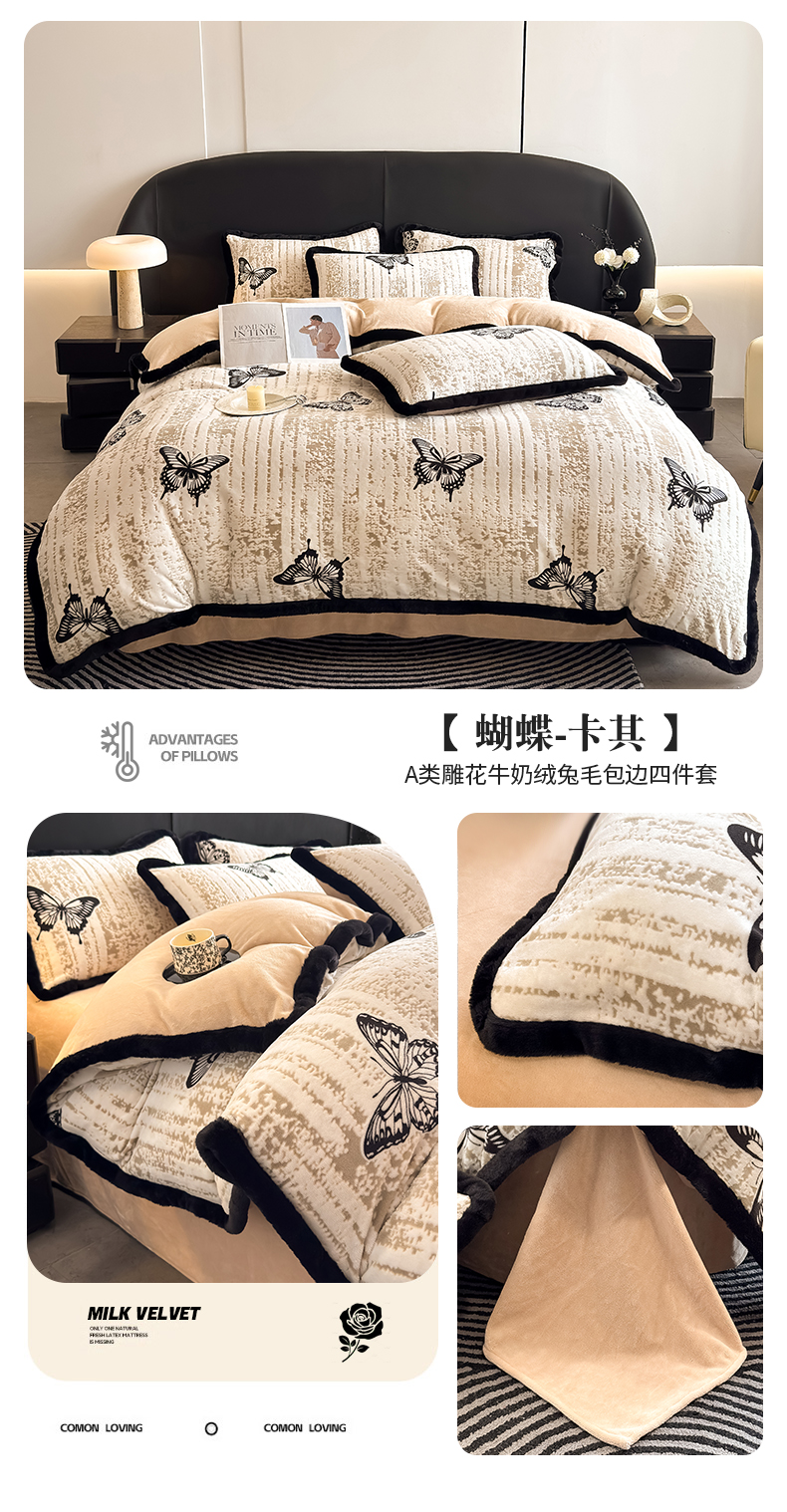 商品名称:卡罗兰 2025新款雕花牛奶绒兔毛包边四件套 蝴蝶-卡其