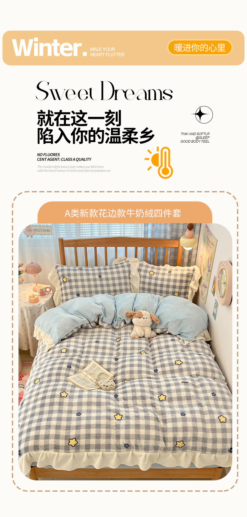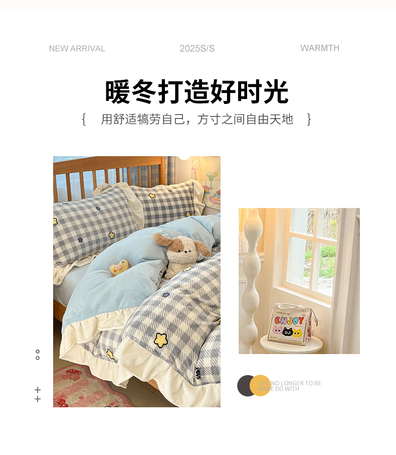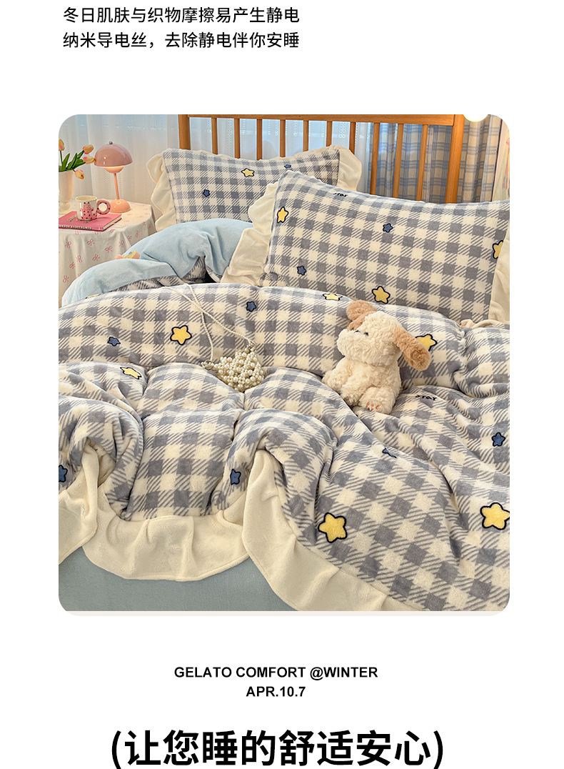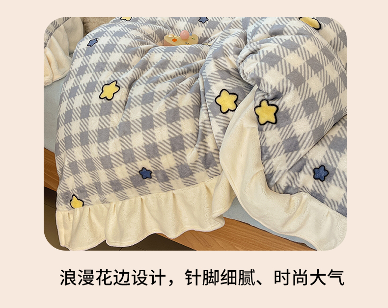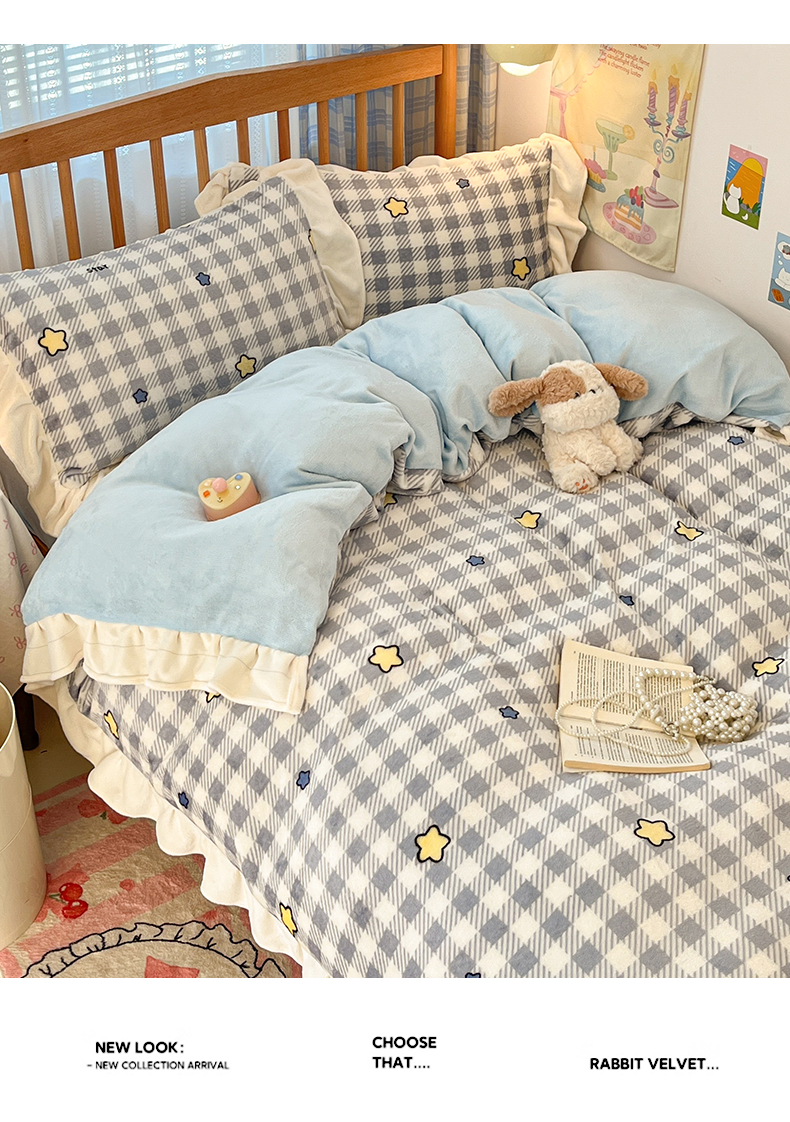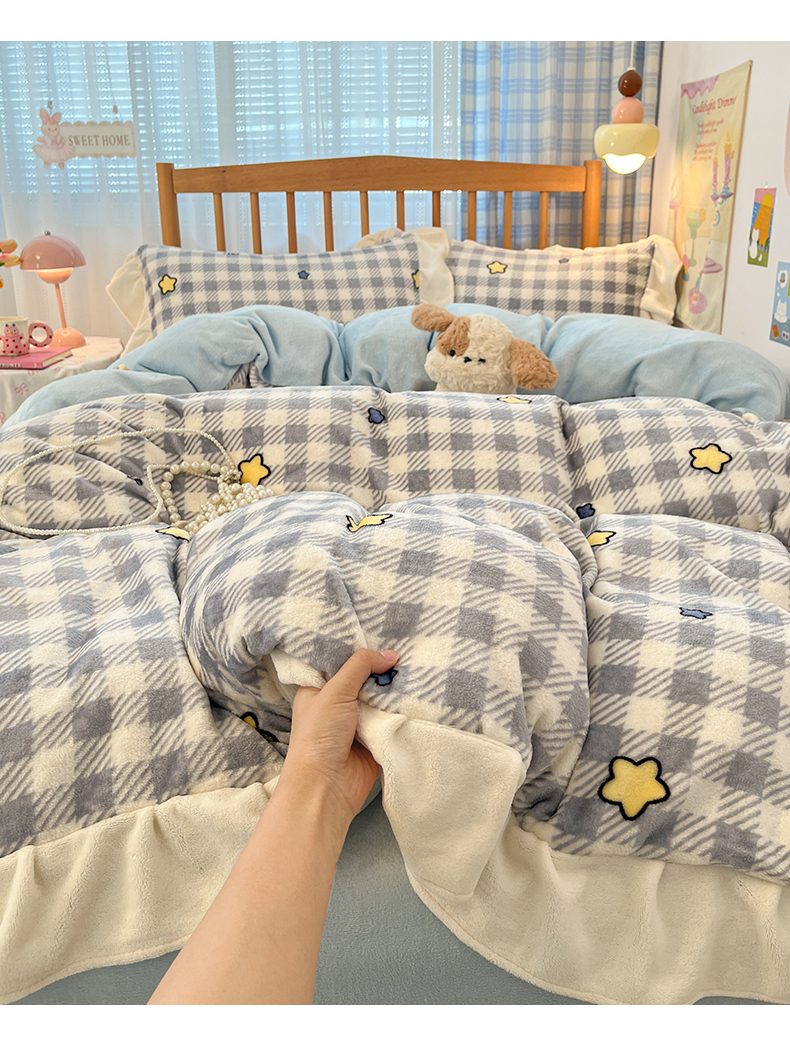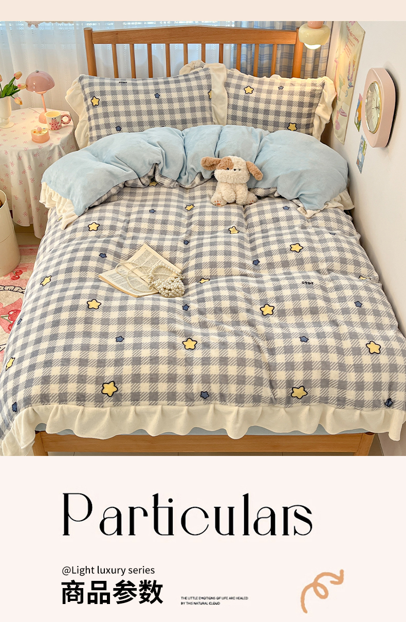 当前位置: 91家纺网 > 商品网购 > 床品套件 > 四件套 > 牛奶绒四件套 > 川悦生活 2025新款A类韩版花边牛奶绒四件套 花边简空星号蓝