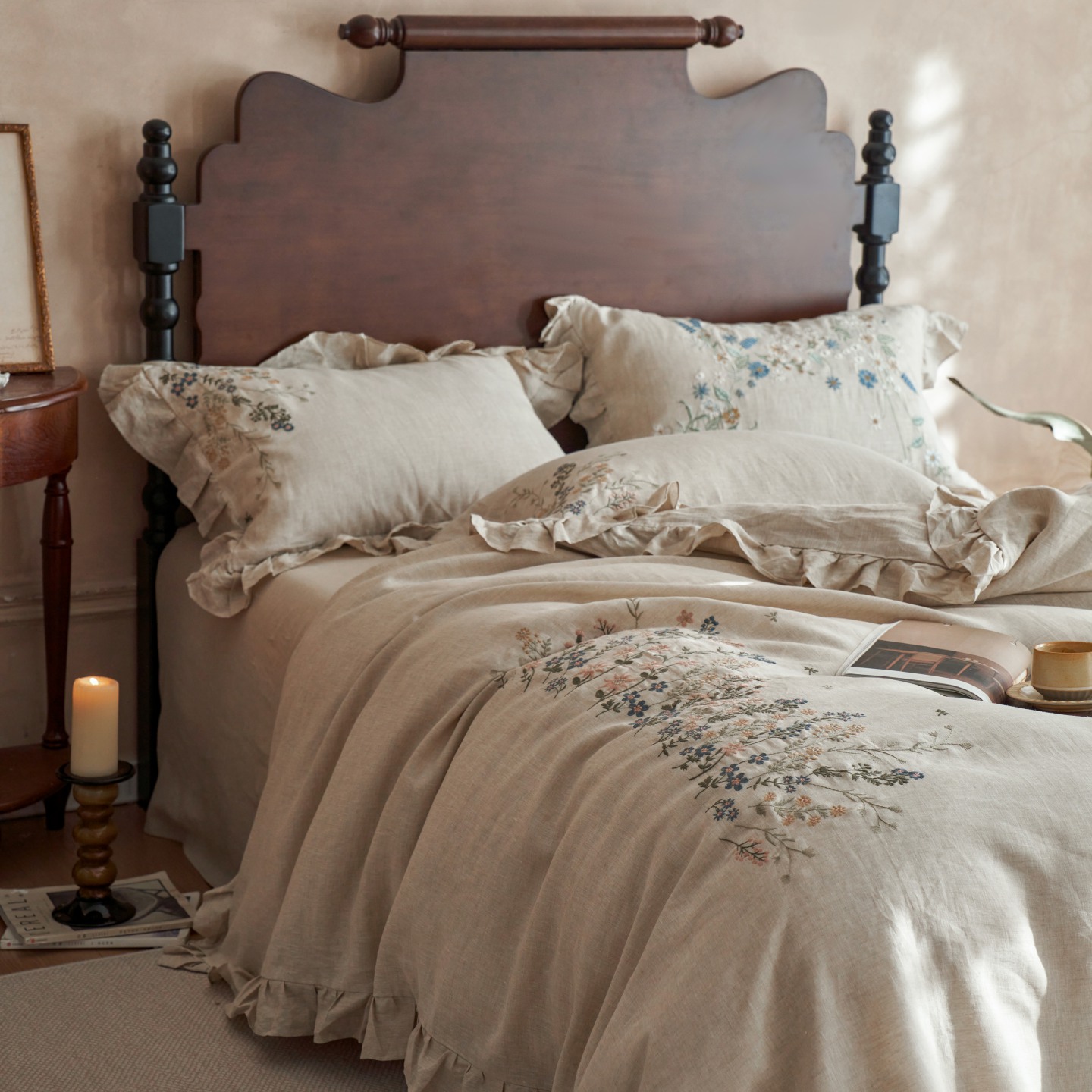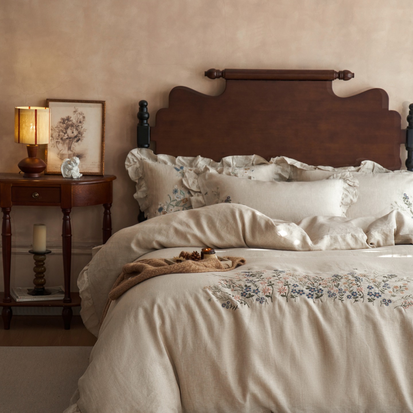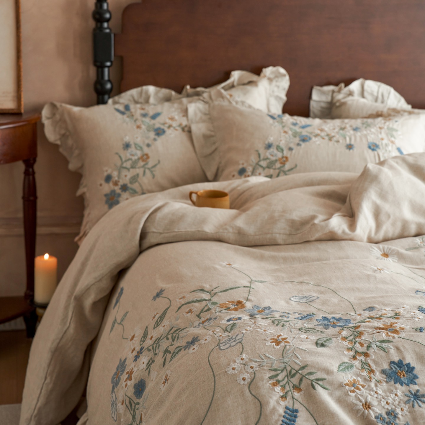 安莱生活 2025新款百分百纯亚麻重工艺刺绣四件套 花非花-雨露
