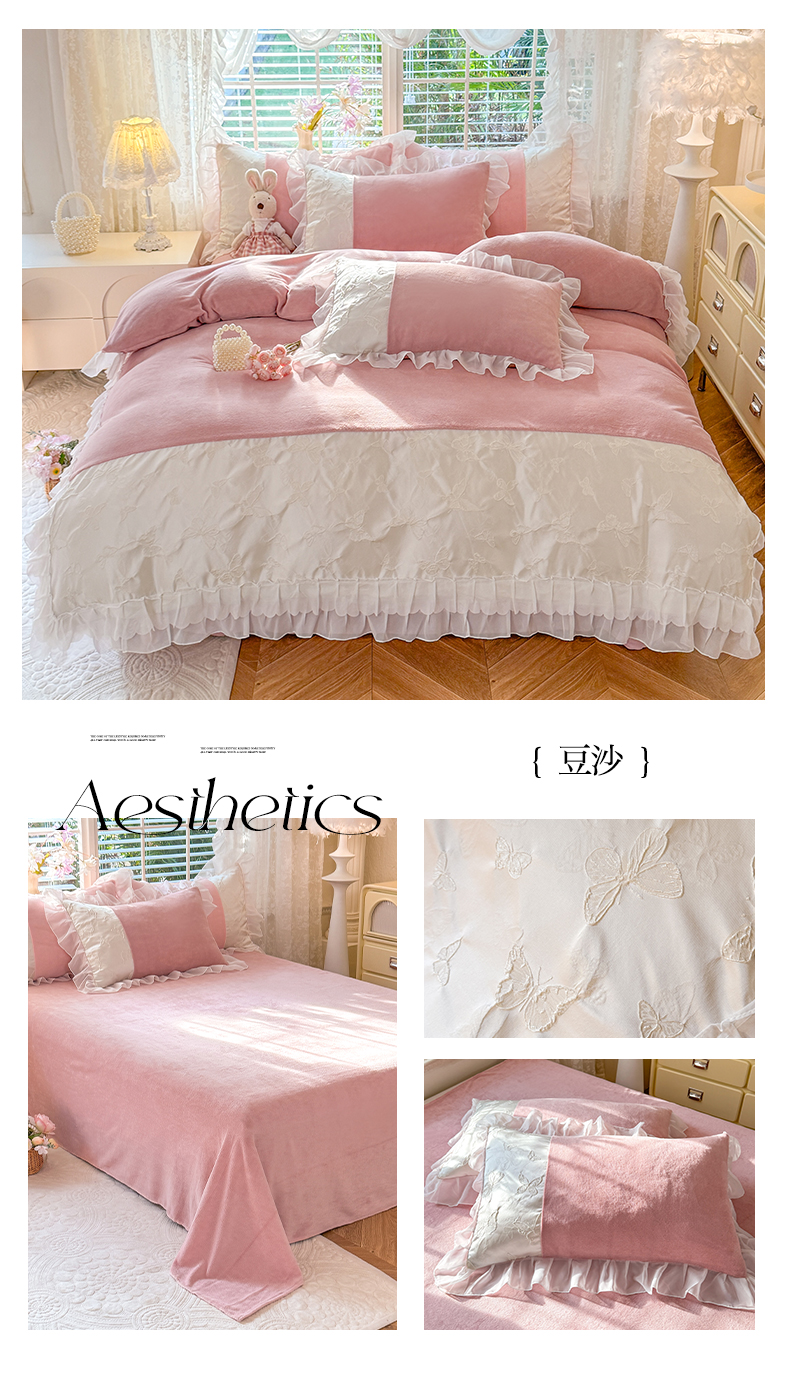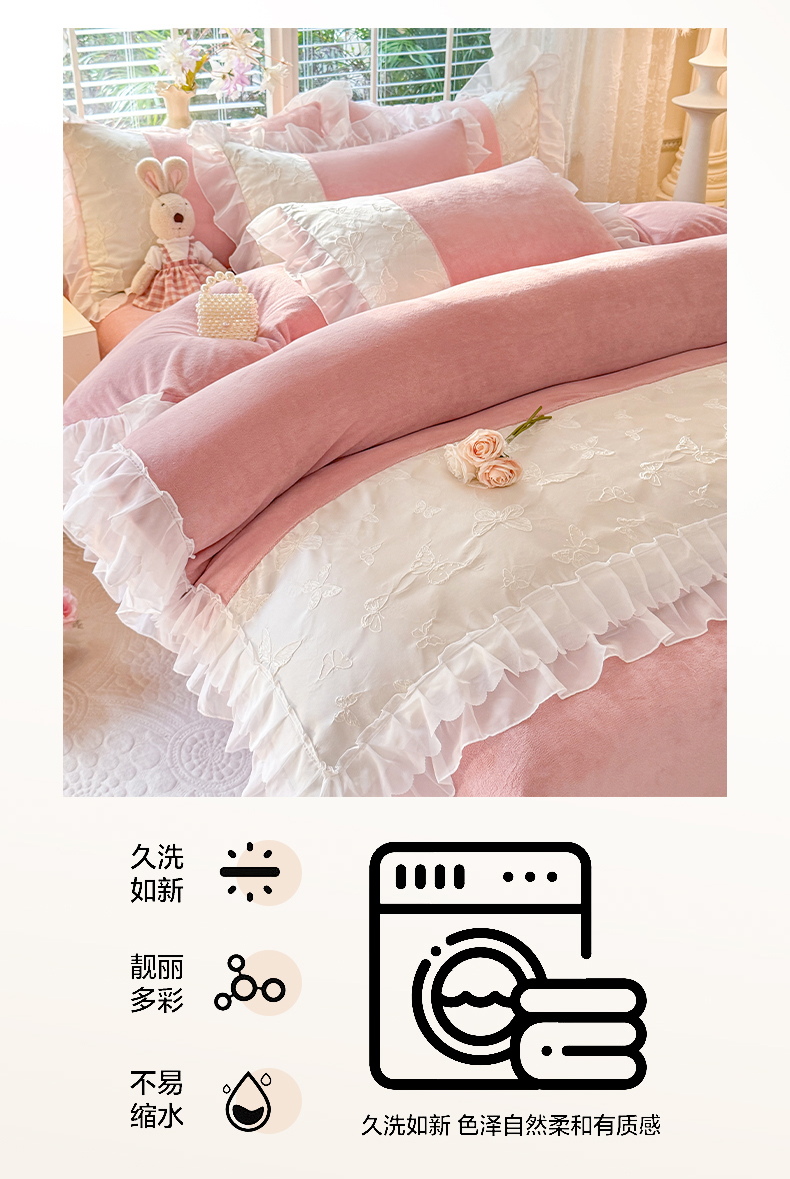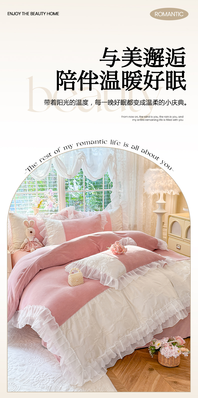 (总)艾米家居 2025秋冬新款浮雕牛奶绒花边四件套,白色,豆沙,粉色