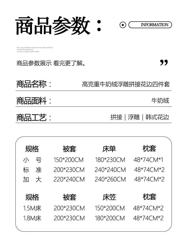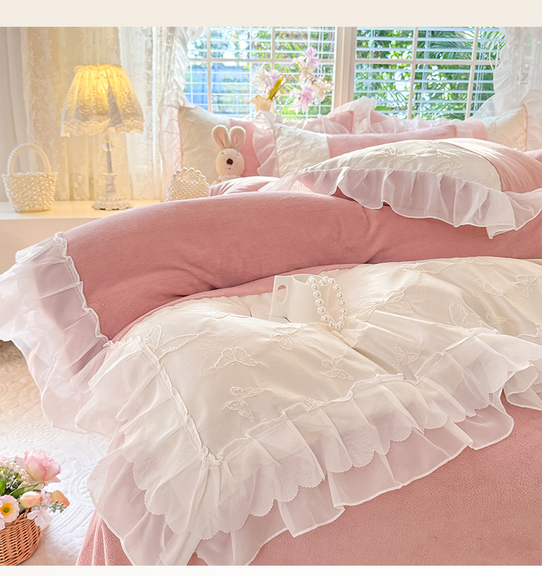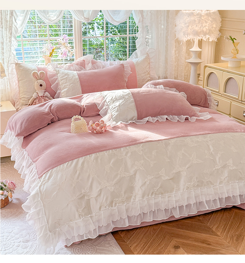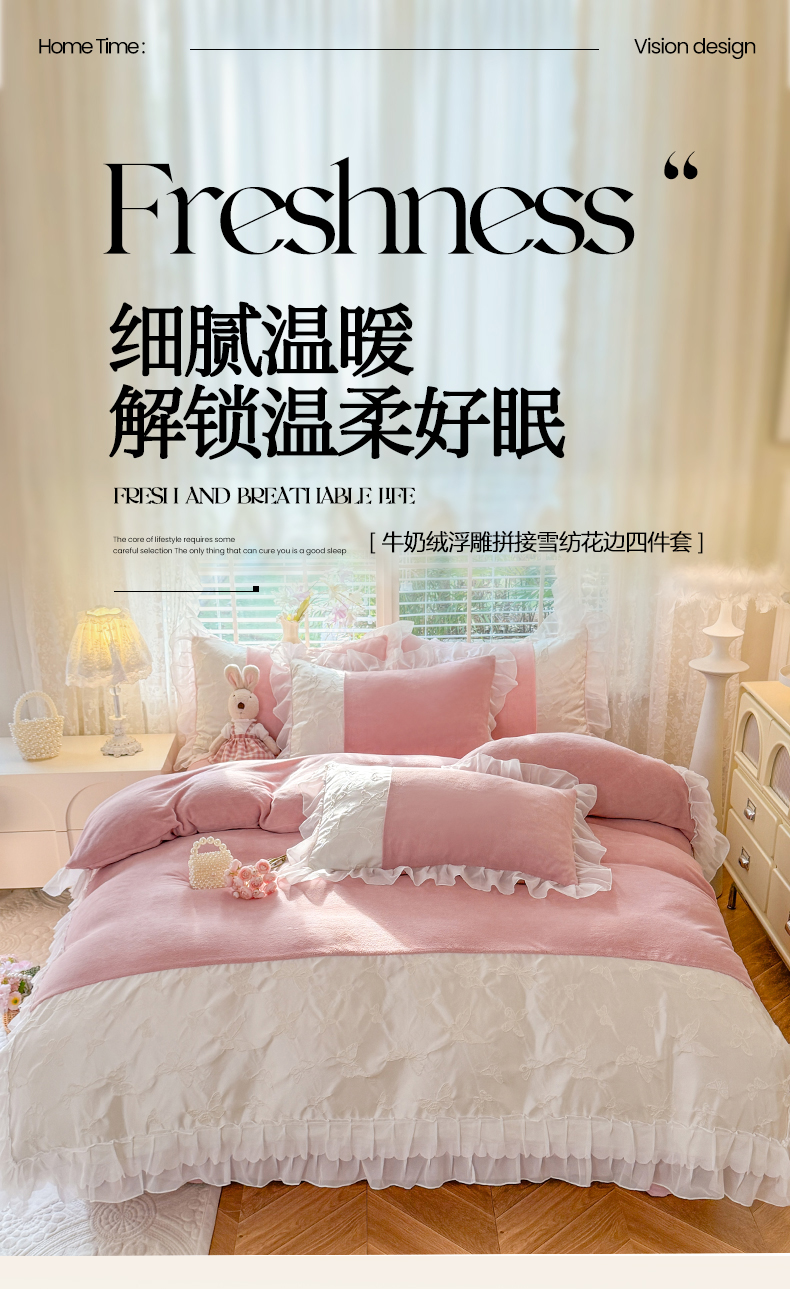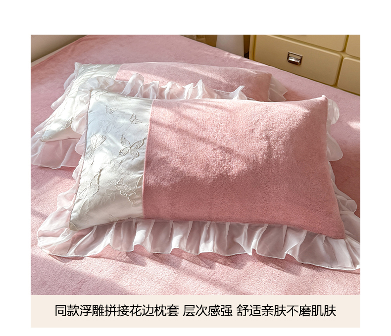 (总)艾米家居 2025秋冬新款浮雕牛奶绒花边四件套,白色,豆沙,粉色
