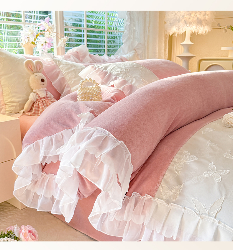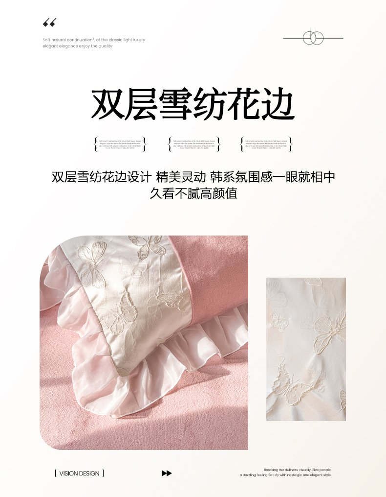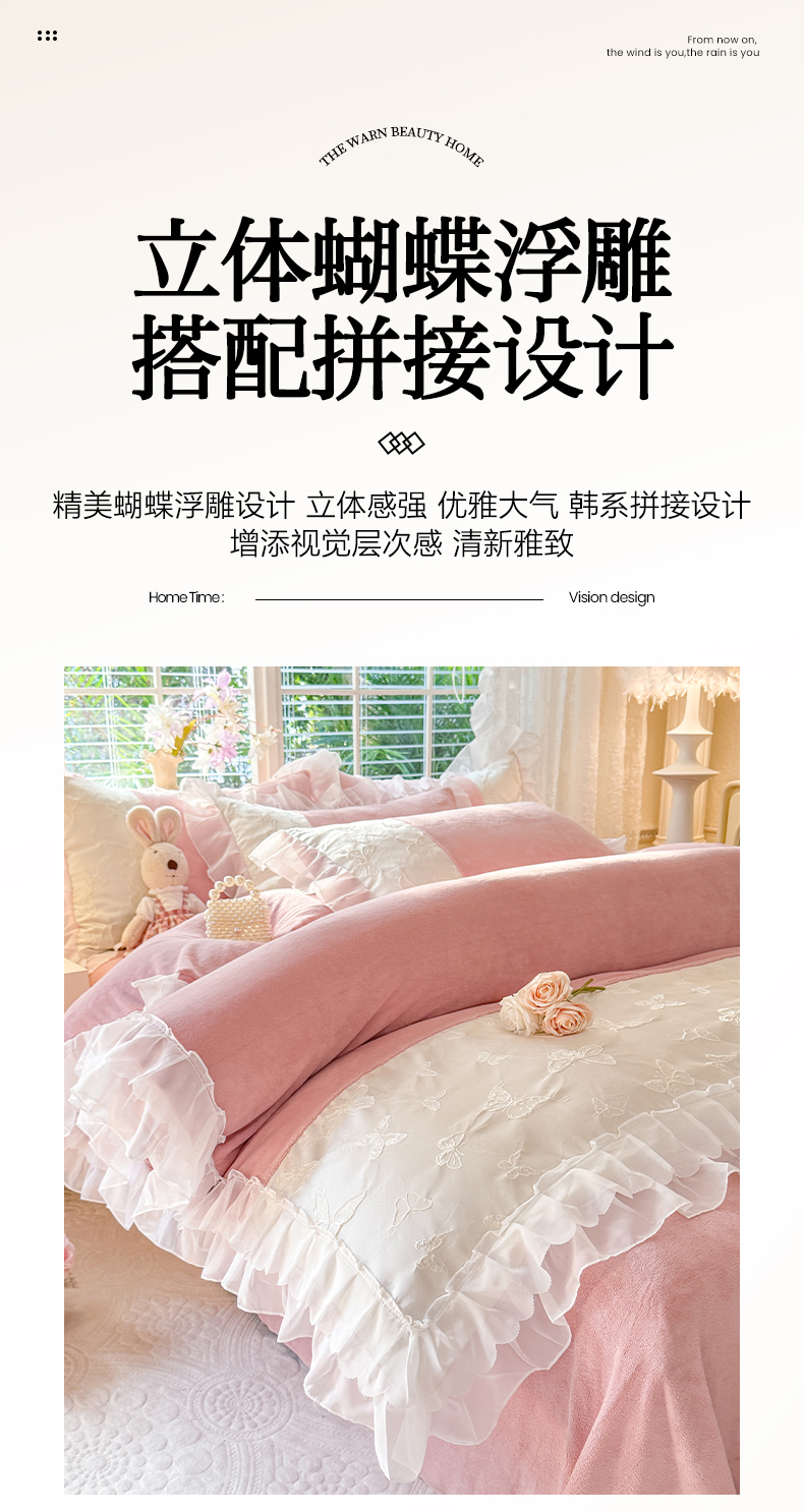 (总)艾米家居 2025秋冬新款牛奶绒泡泡印花花边四件套,豆沙条纹粉,蝴蝶花,太阳花