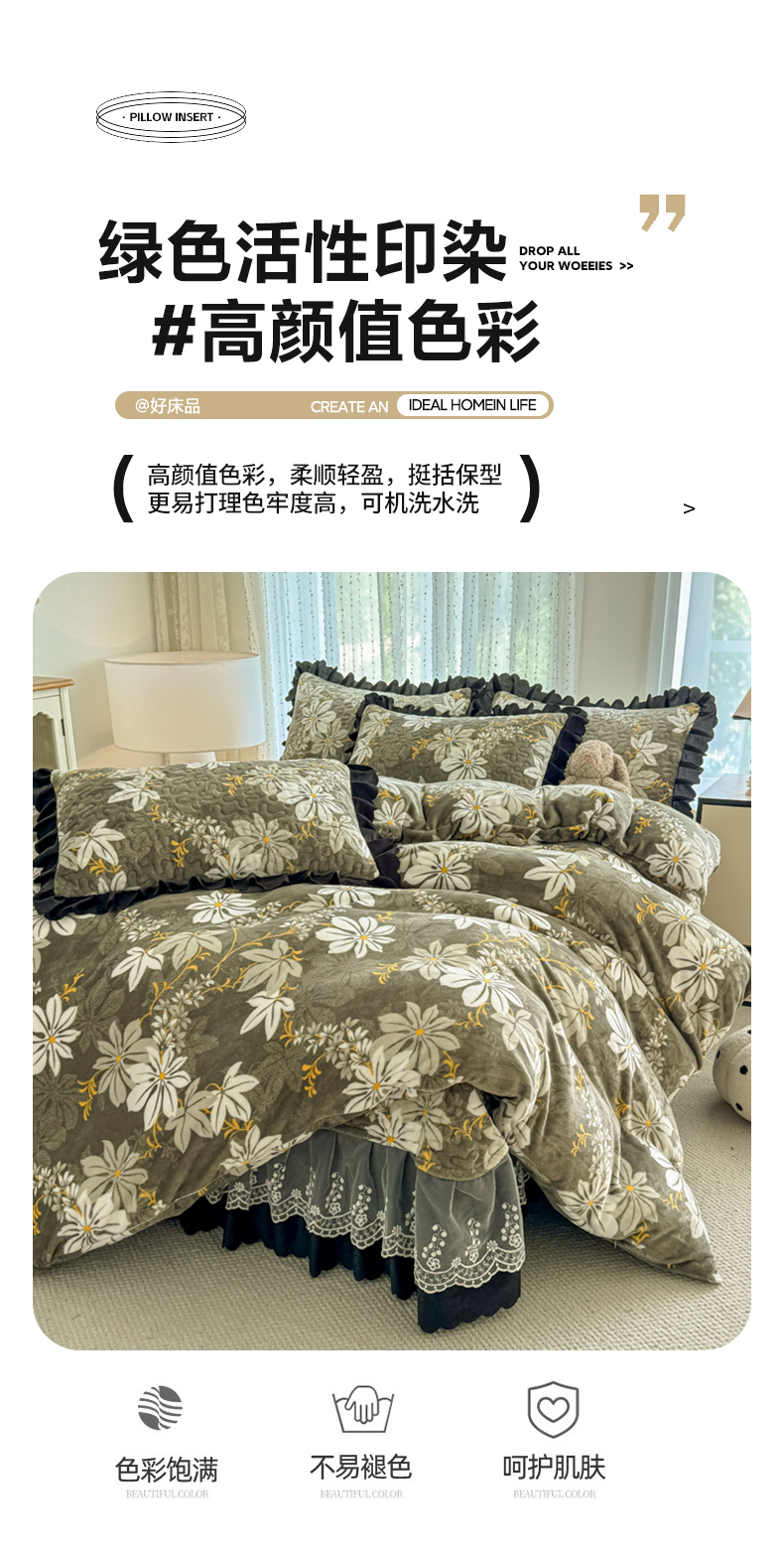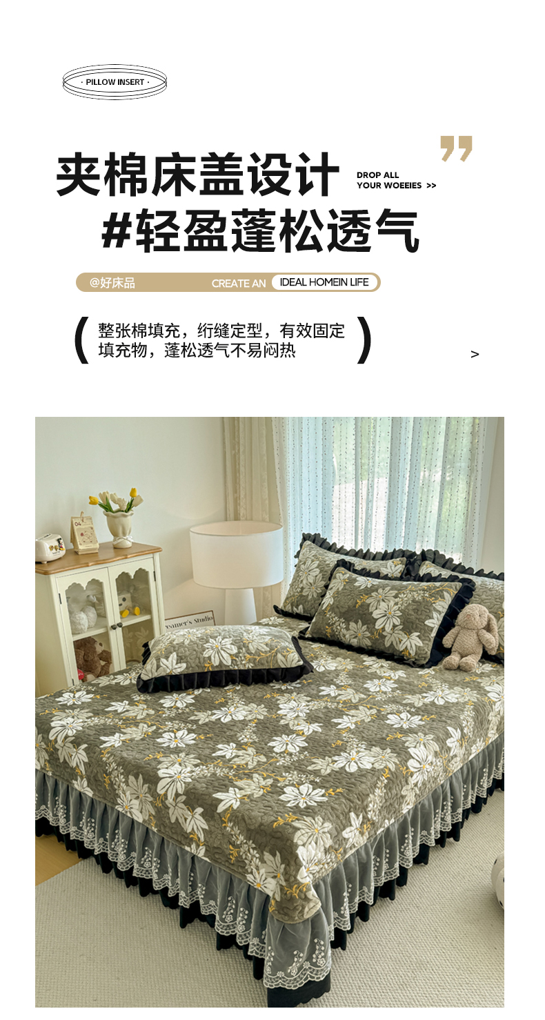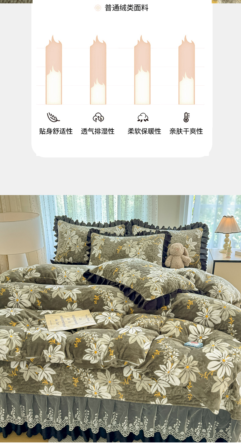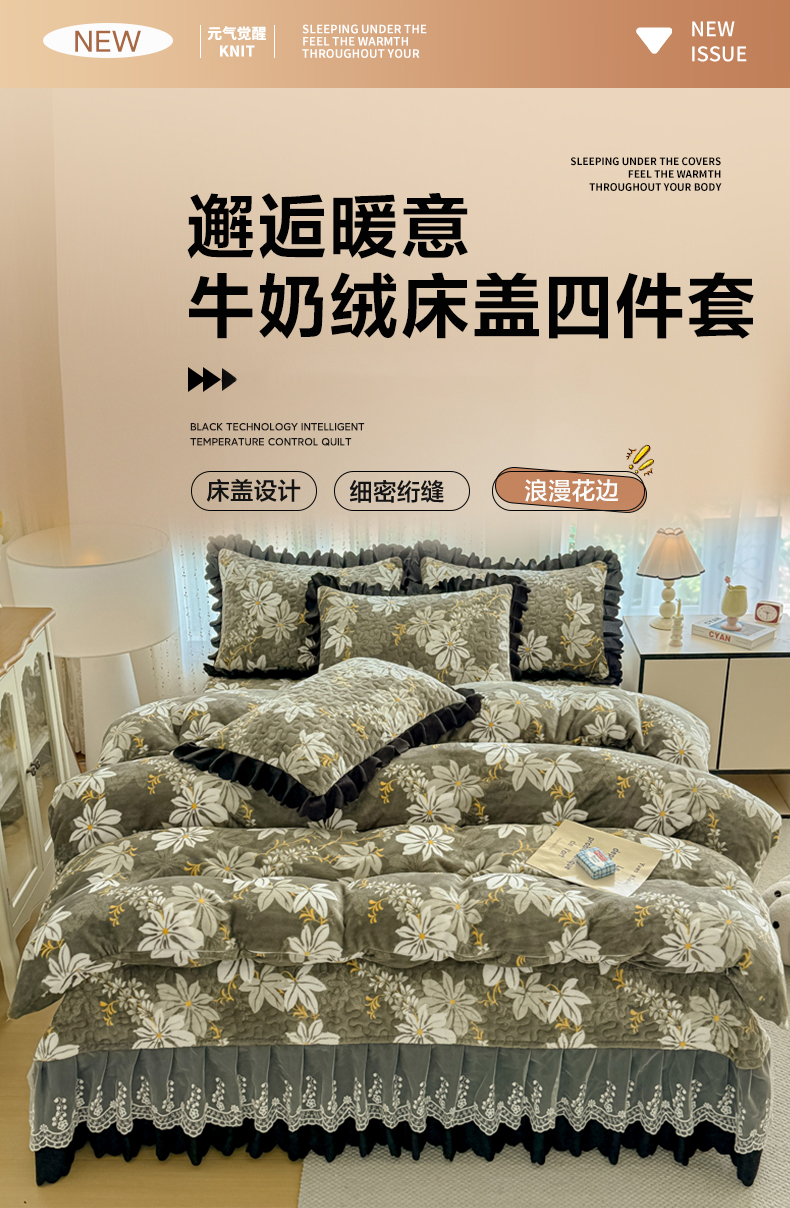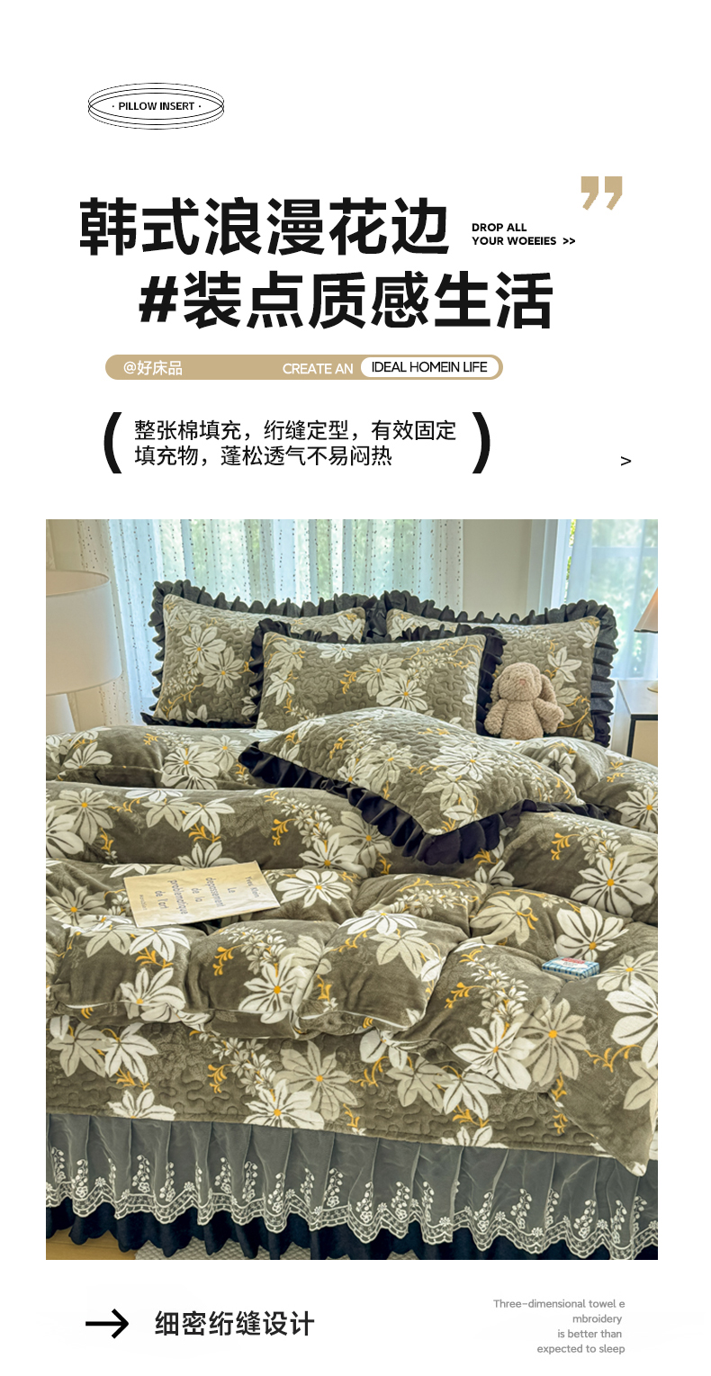 当前位置: 91家纺网 > 商品网购 > 床品套件 > 四件套 > 牛奶绒四件套 > 绒耀 2025新款直播爆款双层蕾丝花边牛奶绒印花床盖四件套床盖单件三件套 温婉佳人