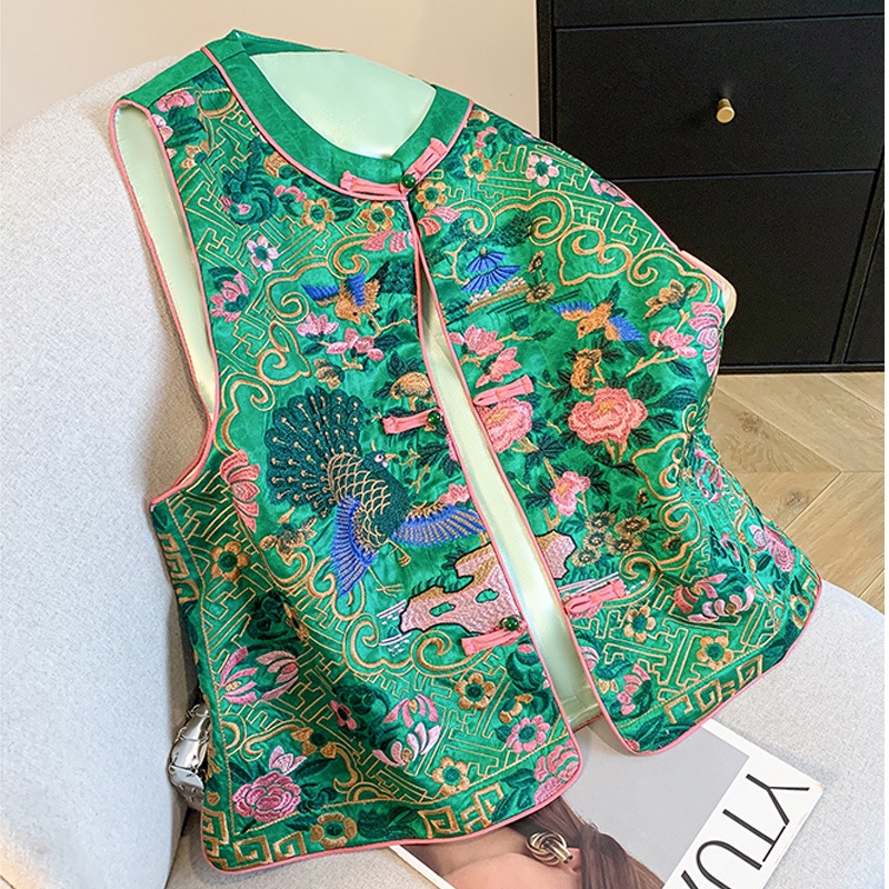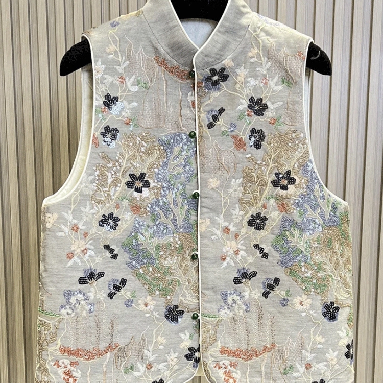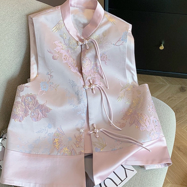 洛兰沙家居馆【只代发】【只代发】 2025新款复古织锦缎细纱棉麻拼接马甲背心刺绣中式盘扣上衣 34