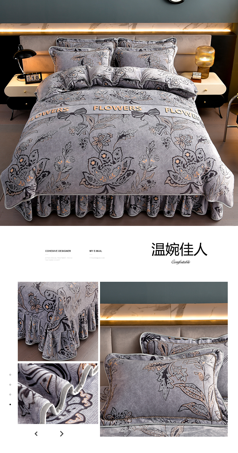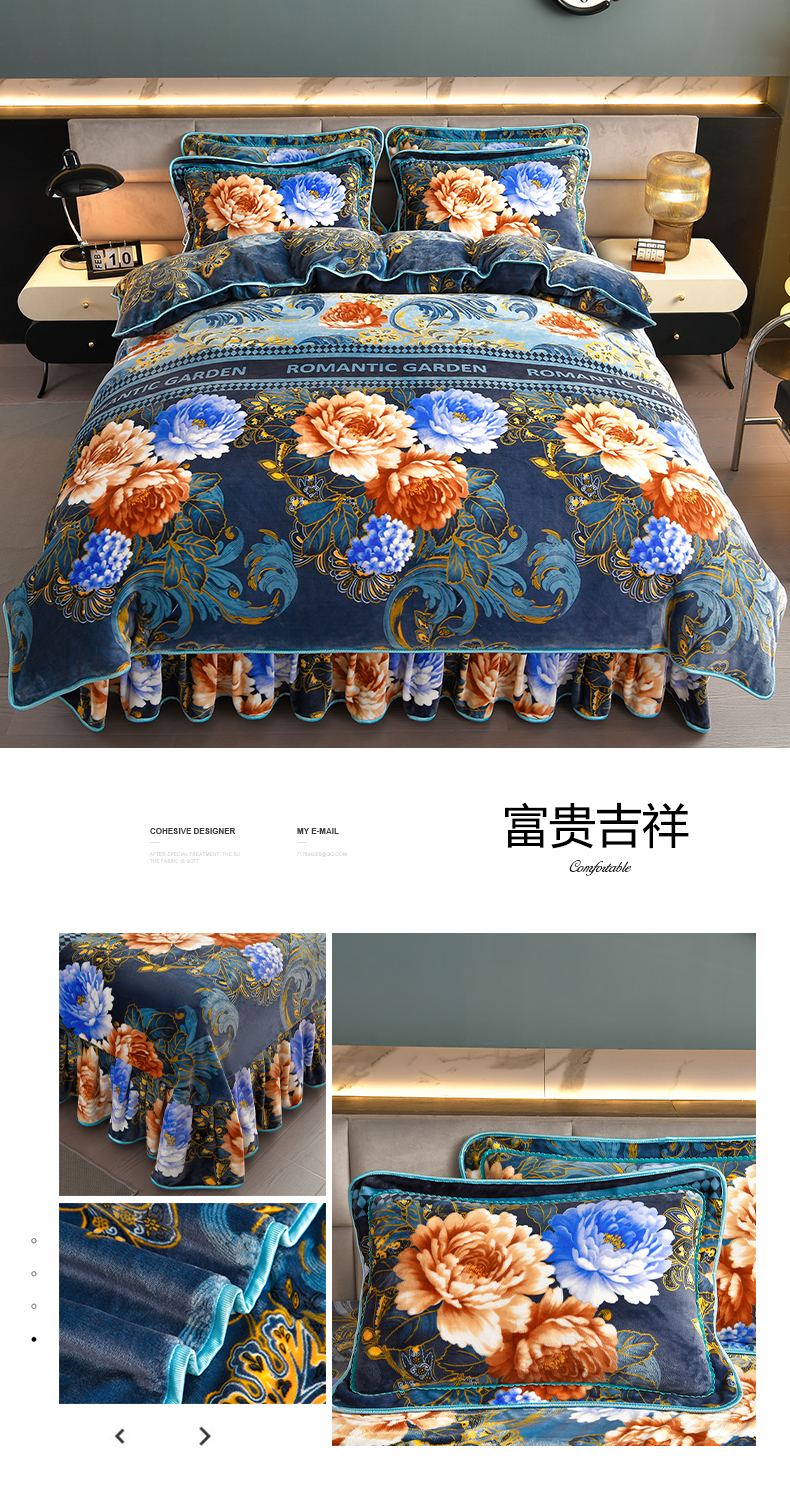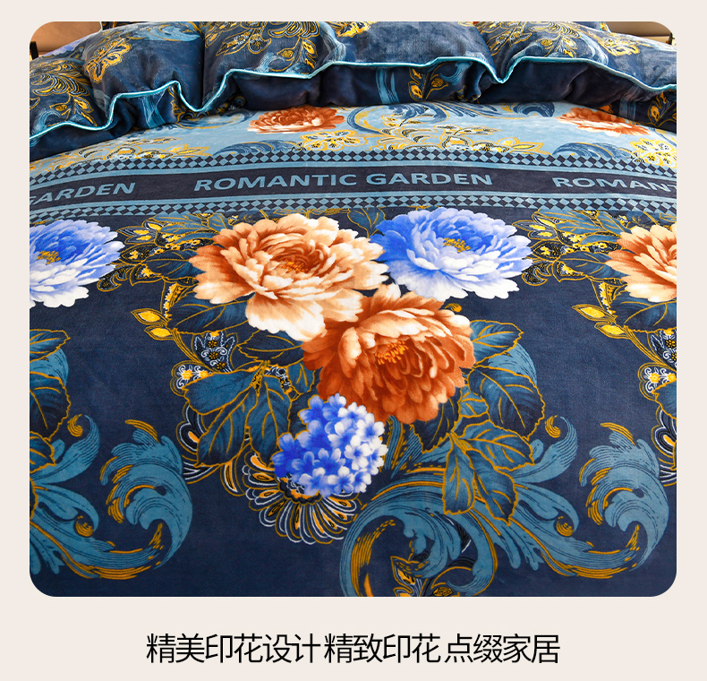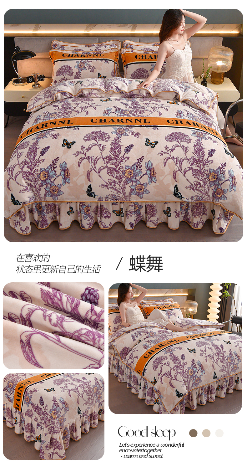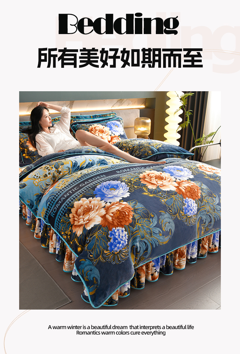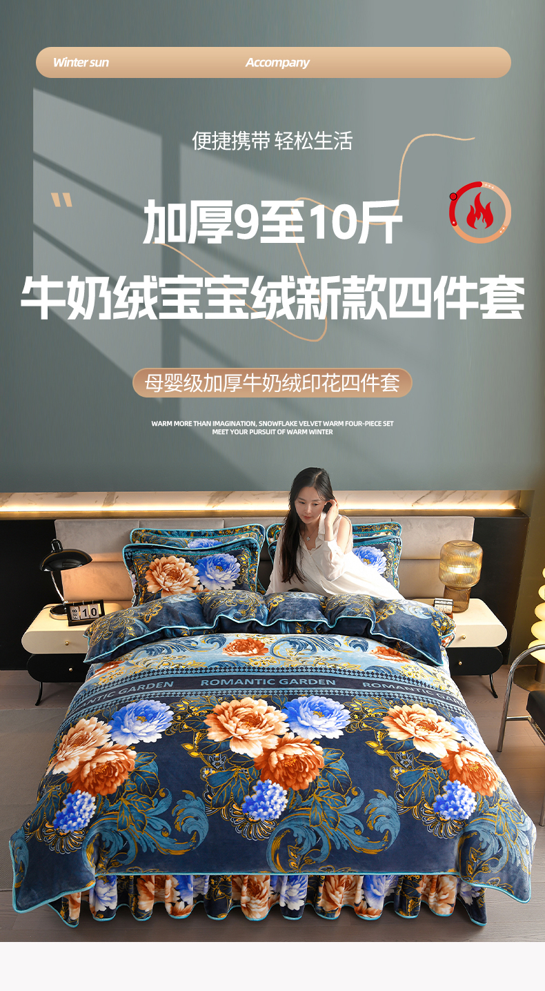商品名称:(总)董成龙家纺 20256新款高克重9-10斤加厚印花超柔牛奶绒爆款法莱绒金貂绒床裙四件套控价