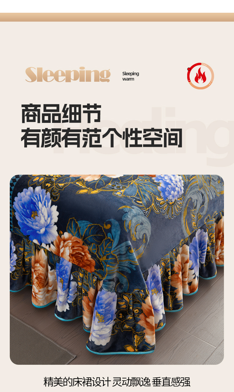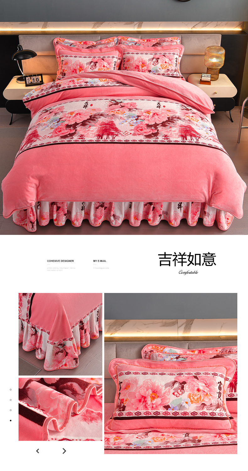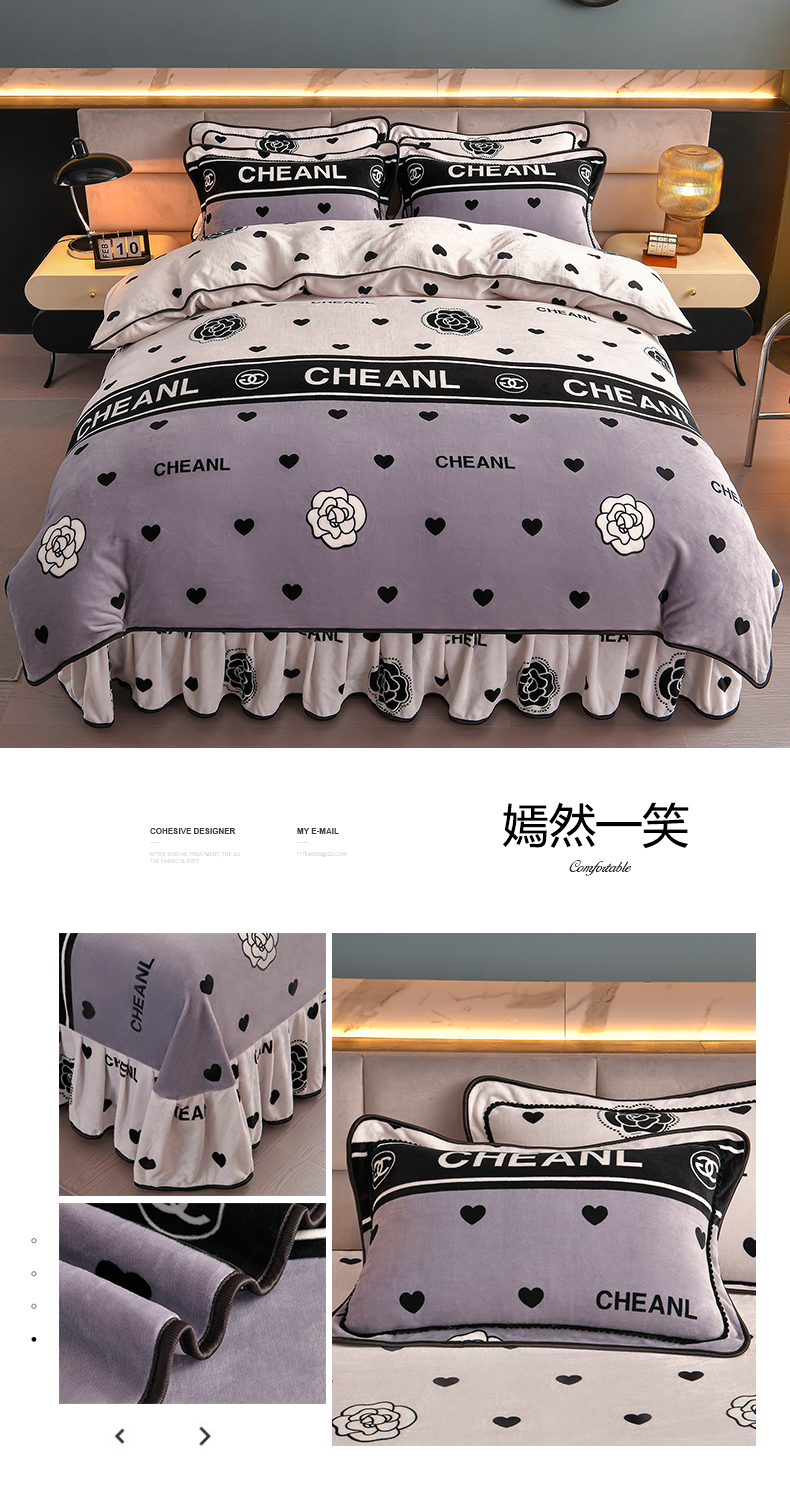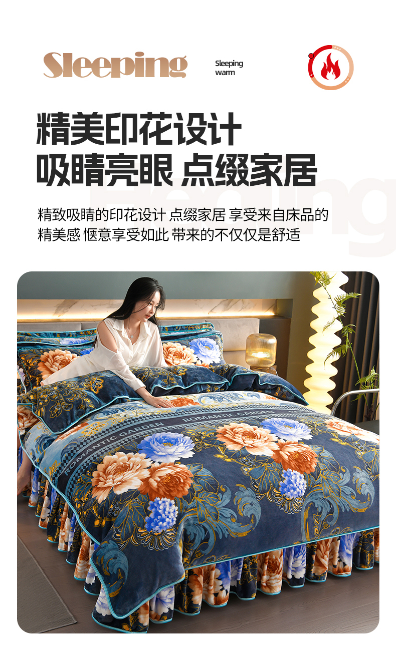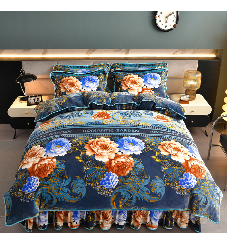 商品名称:(总)董成龙家纺 20256新款高克重9-10斤加厚印花超柔牛奶绒爆款法莱绒金貂绒床裙四件套控价