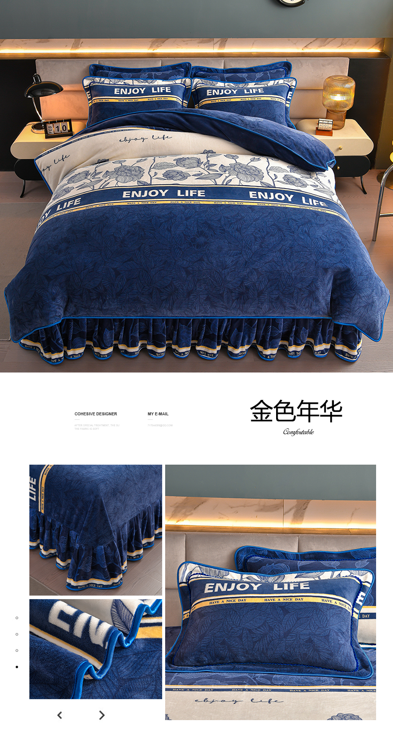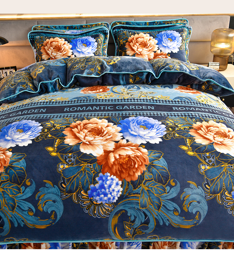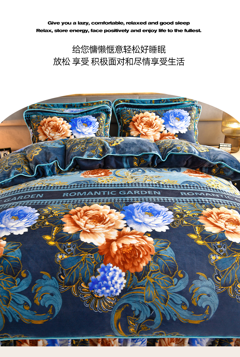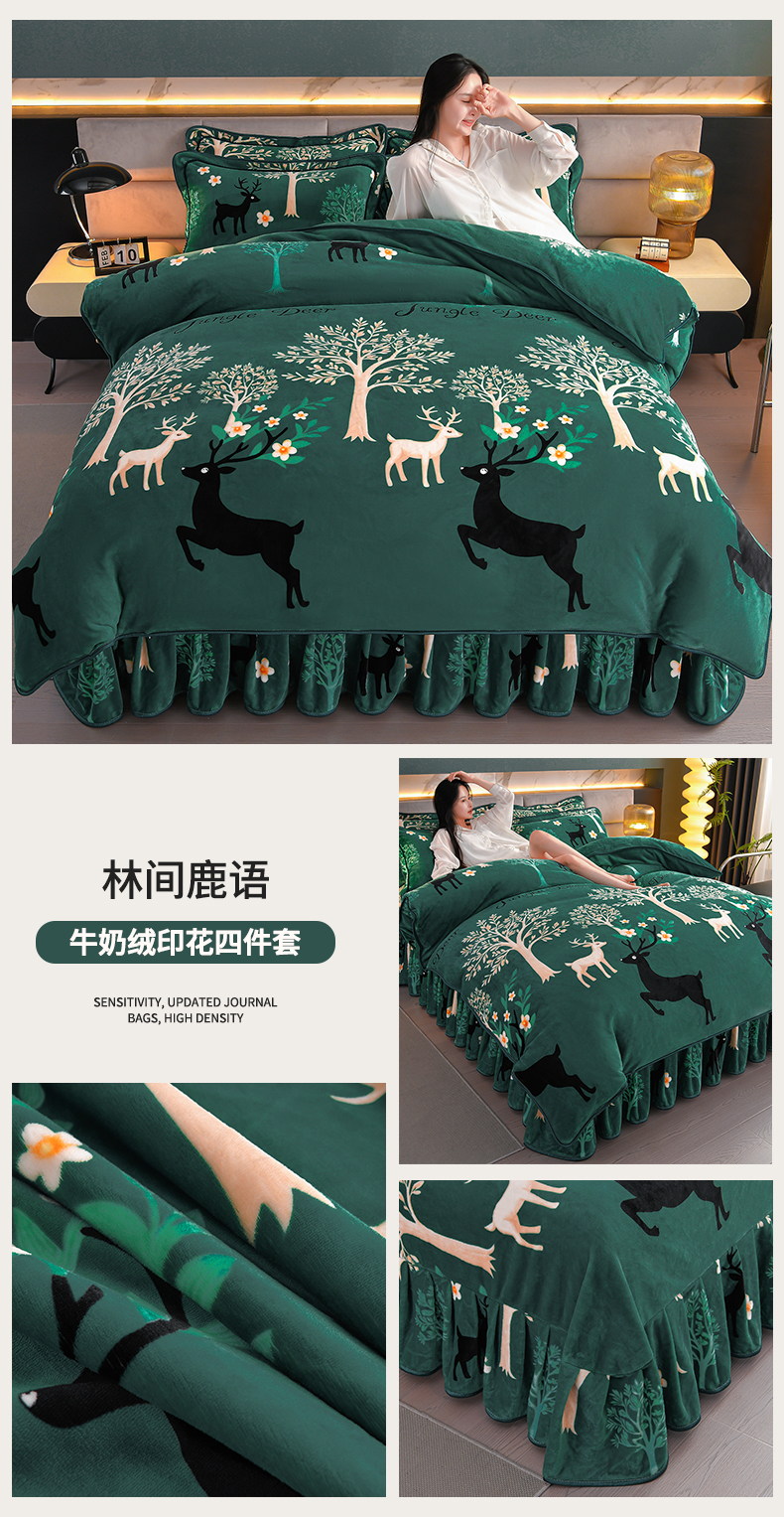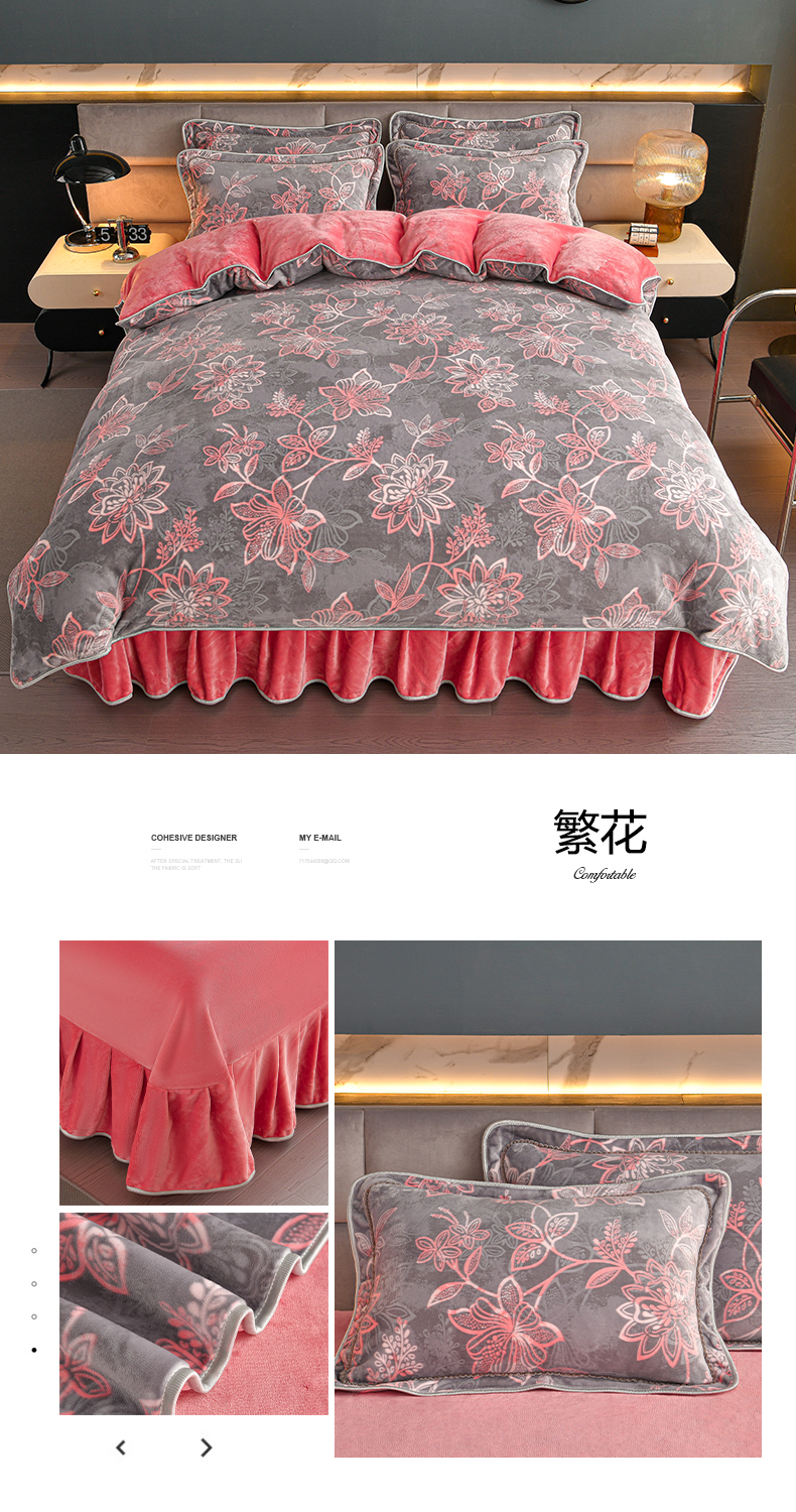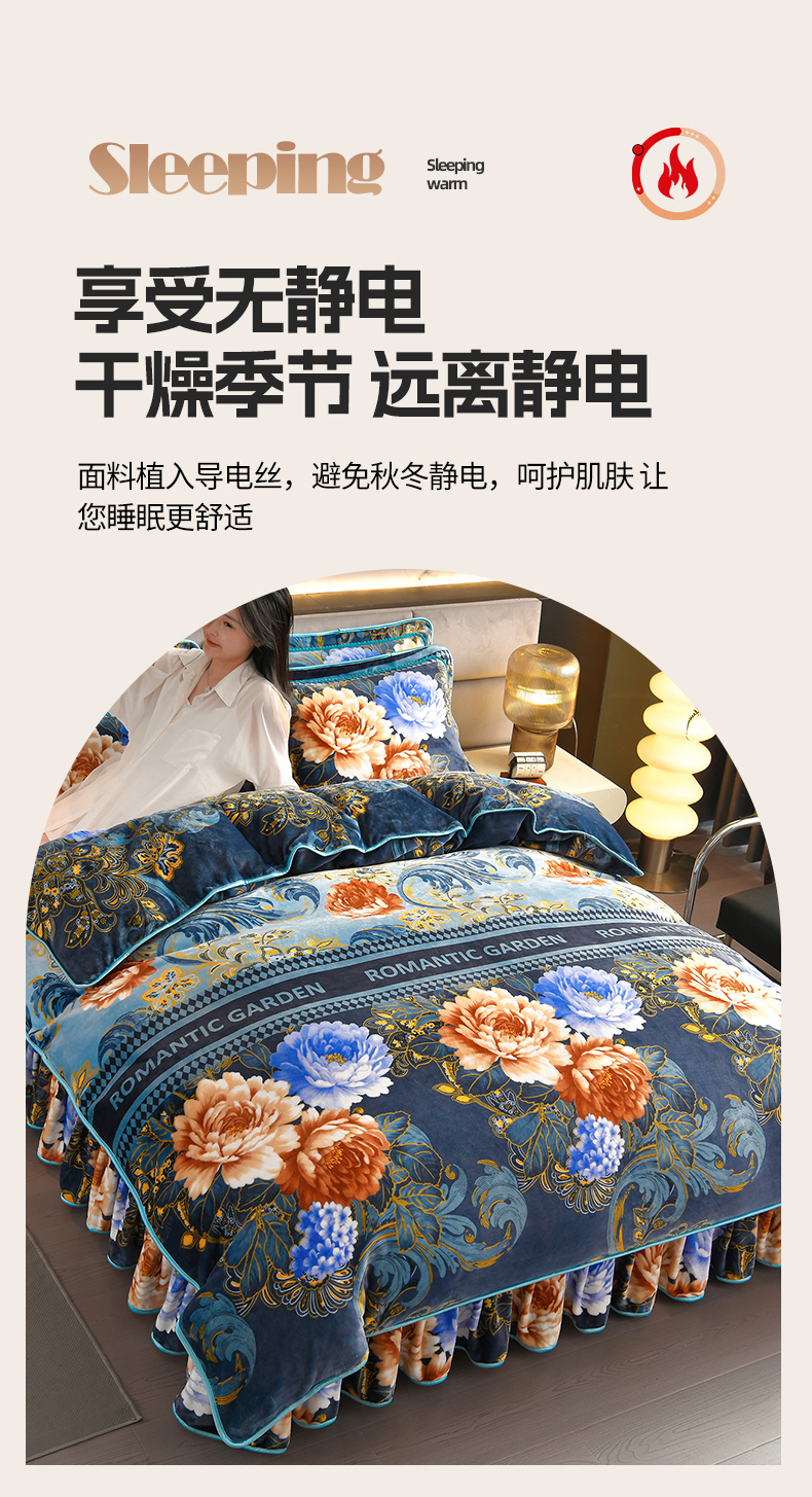 商品名称:(总)董成龙家纺 20256新款高克重9-10斤加厚印花超柔牛奶绒爆款法莱绒金貂绒床裙四件套控价