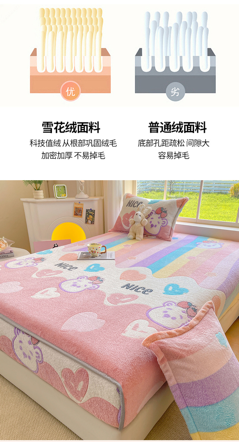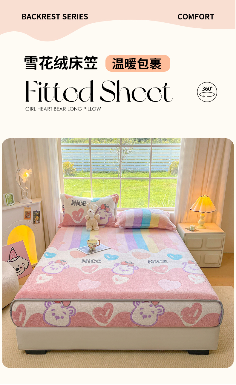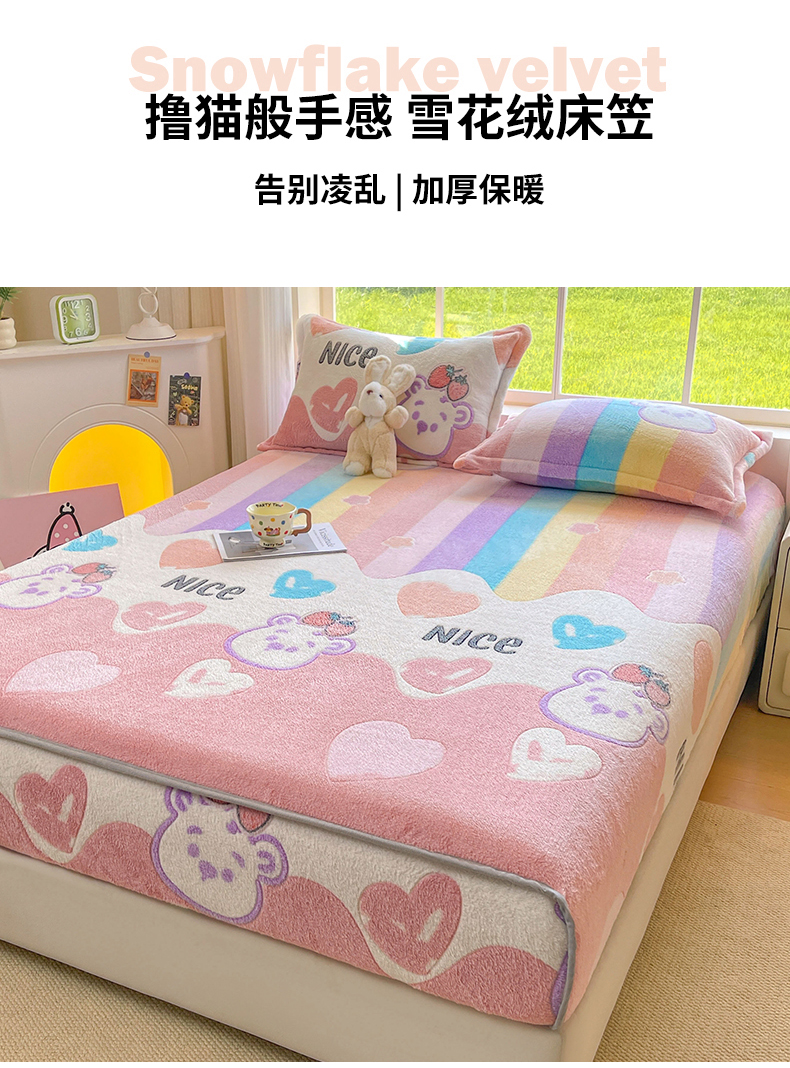商品名称:牵梦萦家纺 2025新款雪花绒立体包边床笠 彩虹爱心