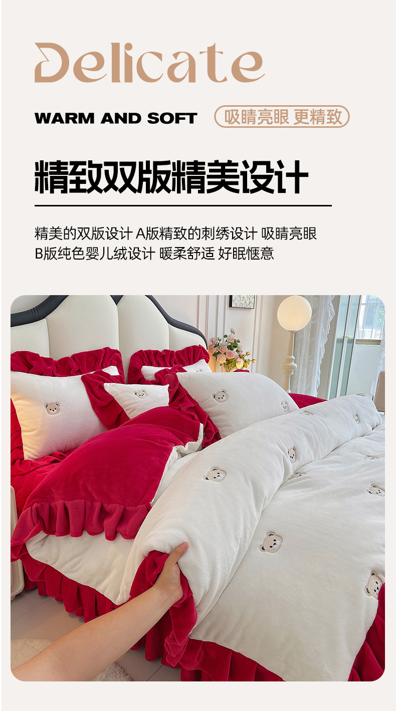 商品名称:茉保家纺 2025新款高克重9.5斤婴儿绒牛奶绒绣花夹棉床盖四件套 小熊-白拼红