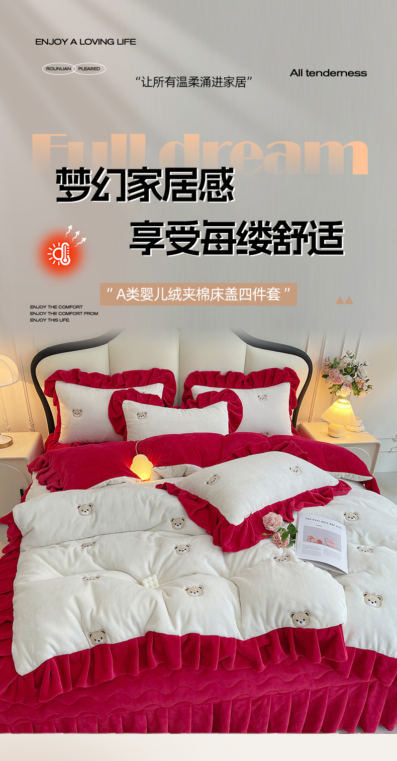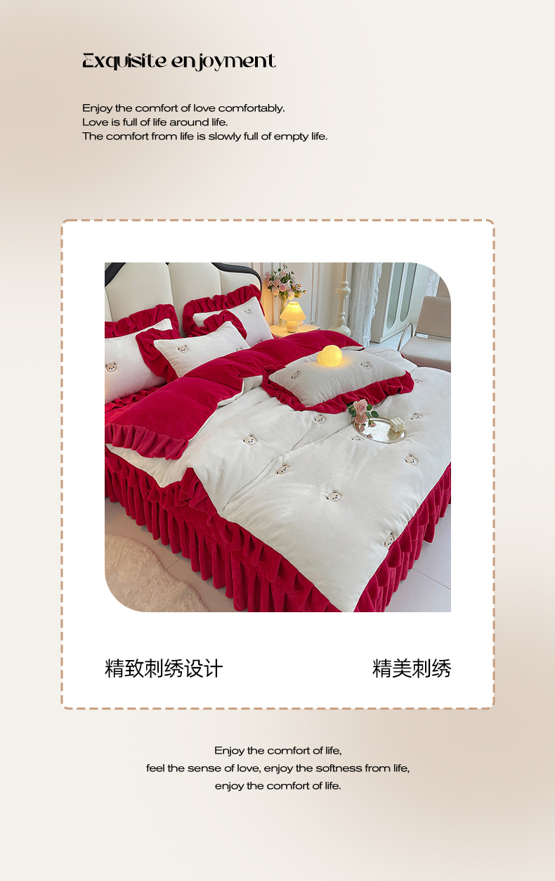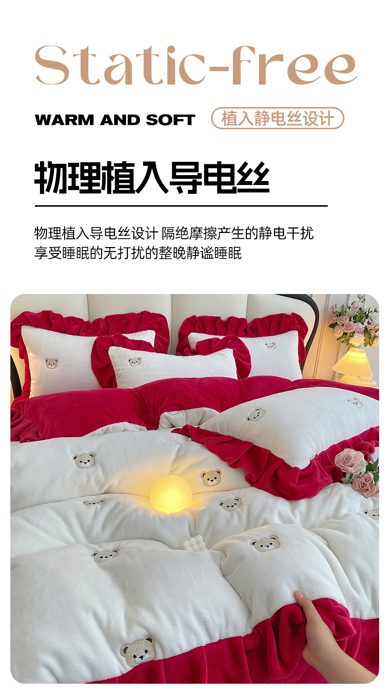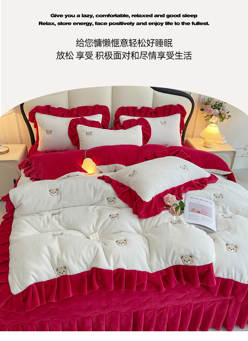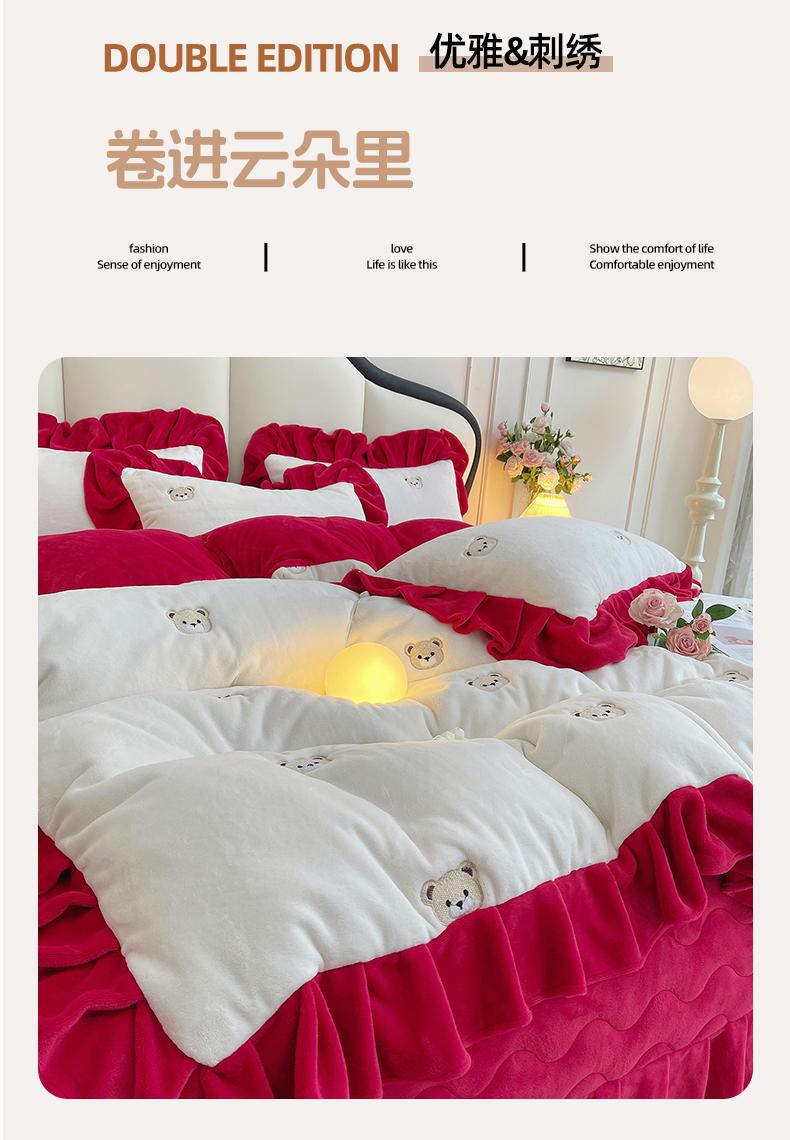 茉保家纺 2025新款高克重9.5斤婴儿绒牛奶绒绣花夹棉床盖四件套 小熊-白拼红