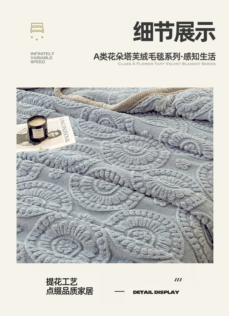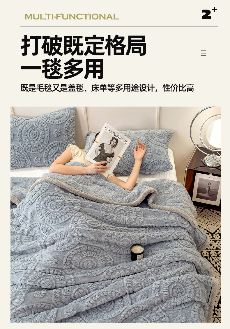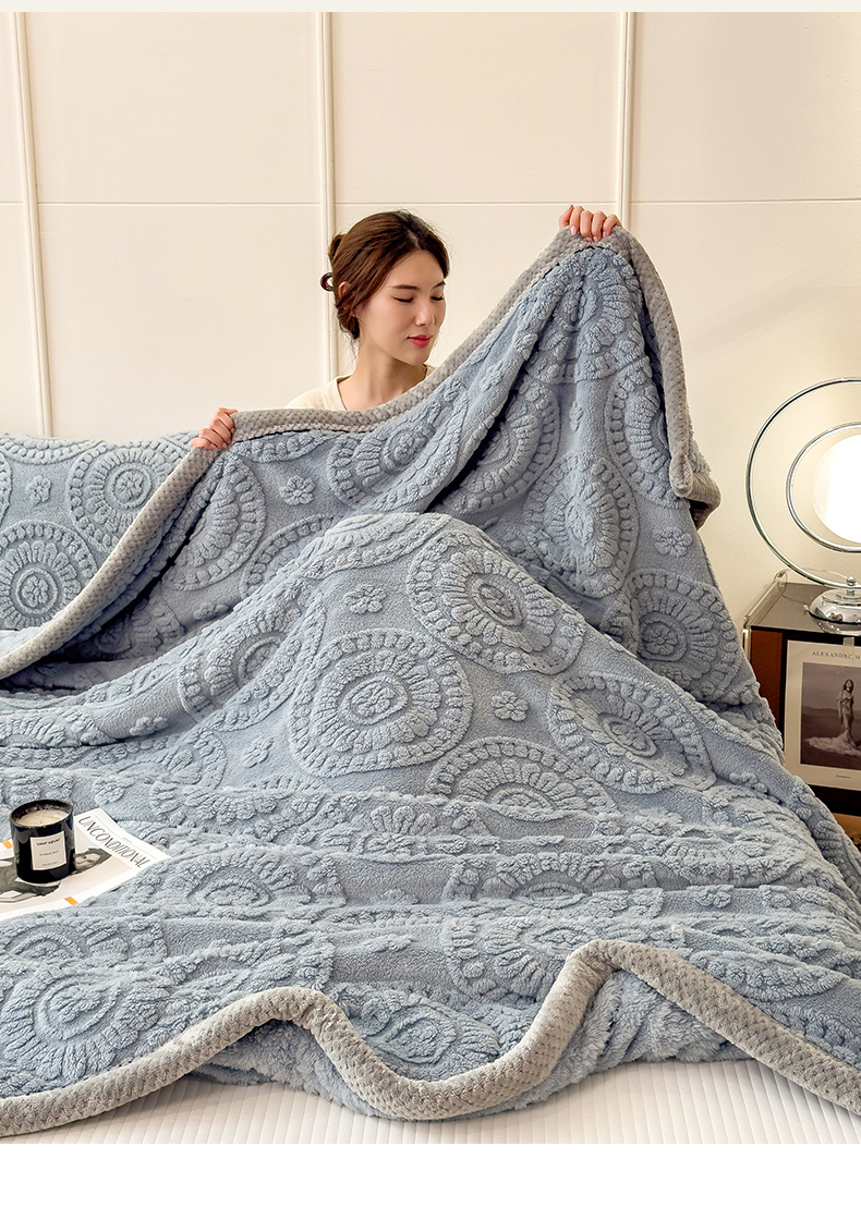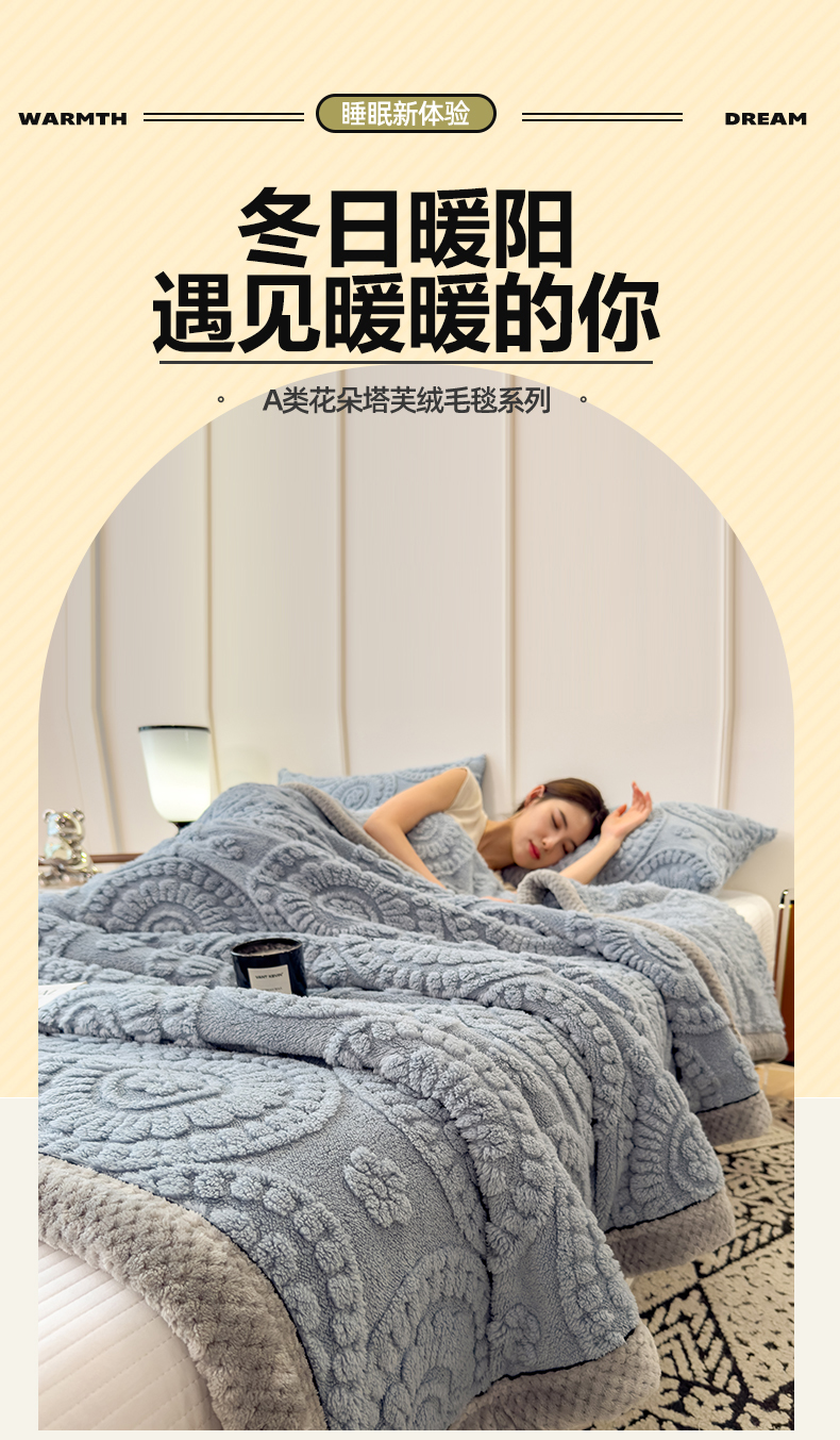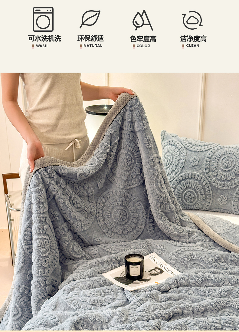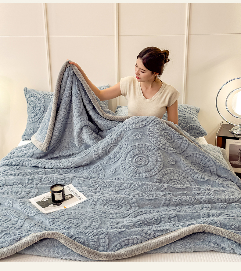 莱家富 2026新款新款A类塔芙绒雕花双面毛毯毯子-花朵(可提供跨境压缩) 花朵-湖蓝