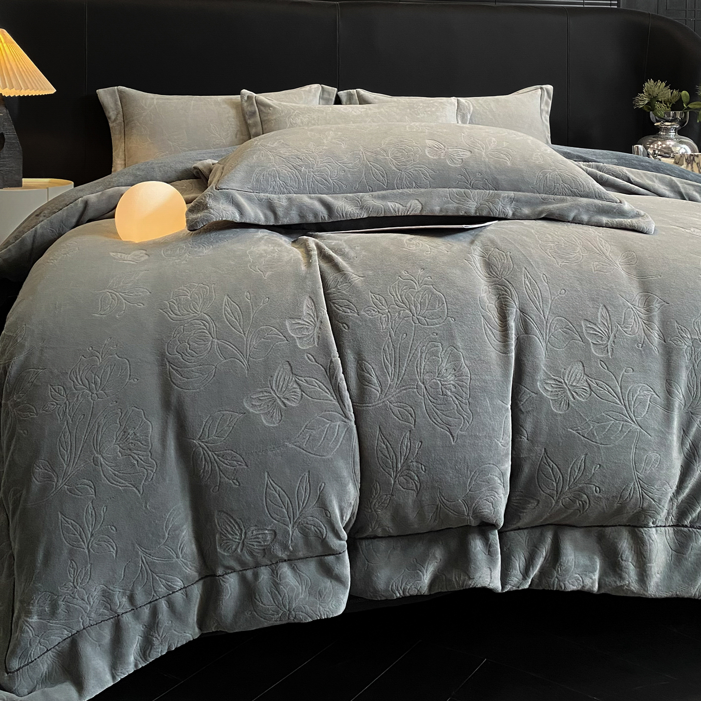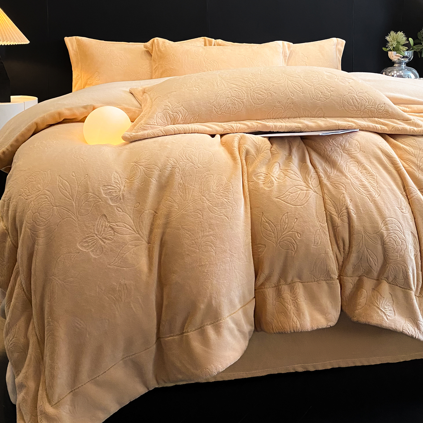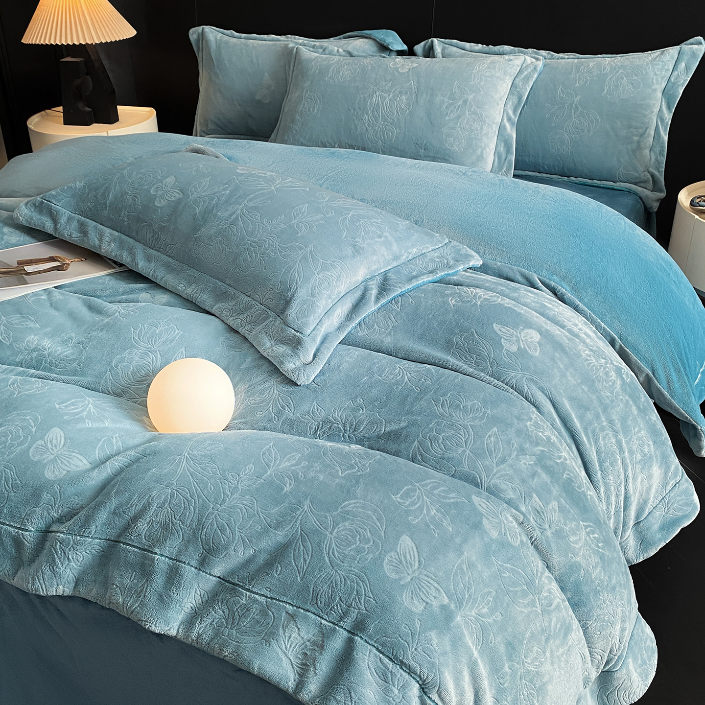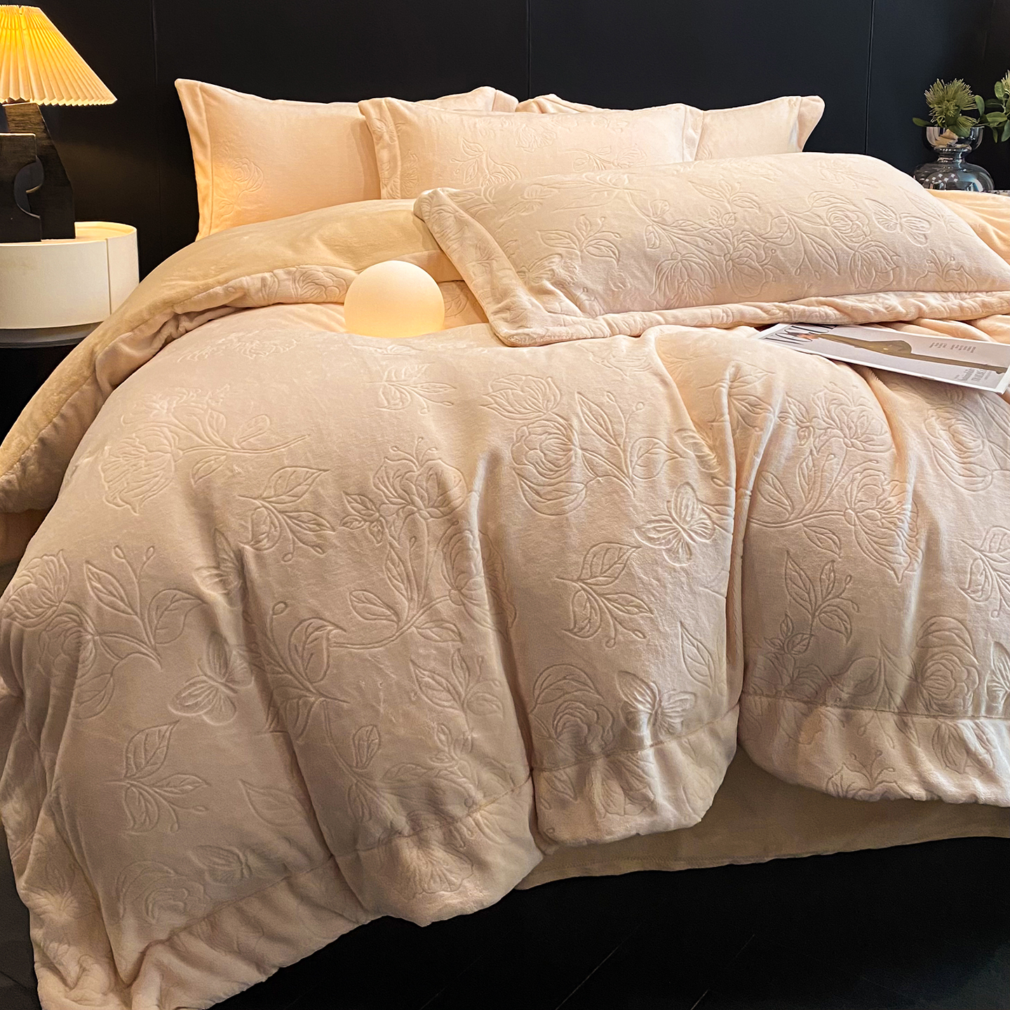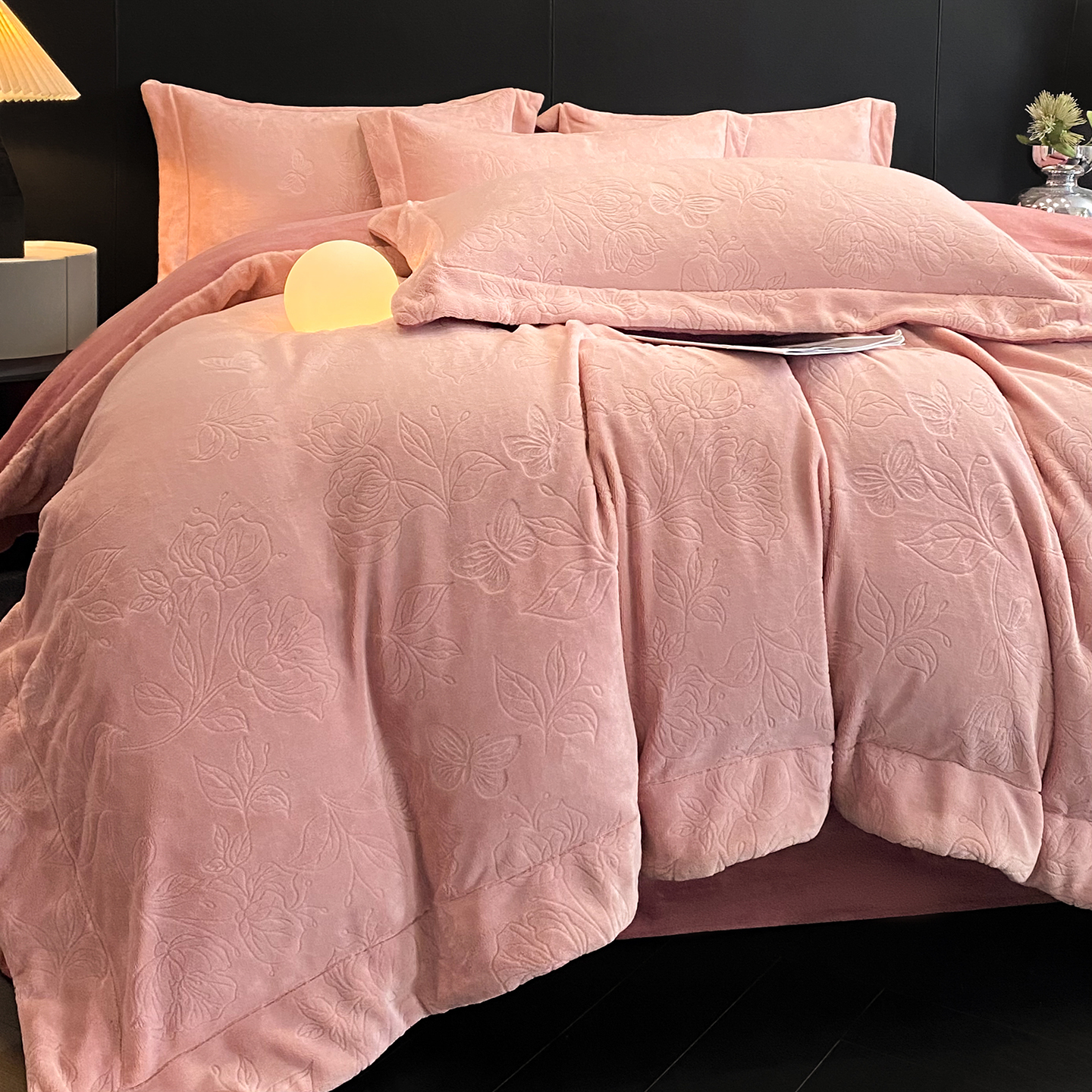 商品名称:(总)控价 专版花型 2025年新款240克9.2斤全消光A类烂花牛奶绒四件套-蝴蝶戏花