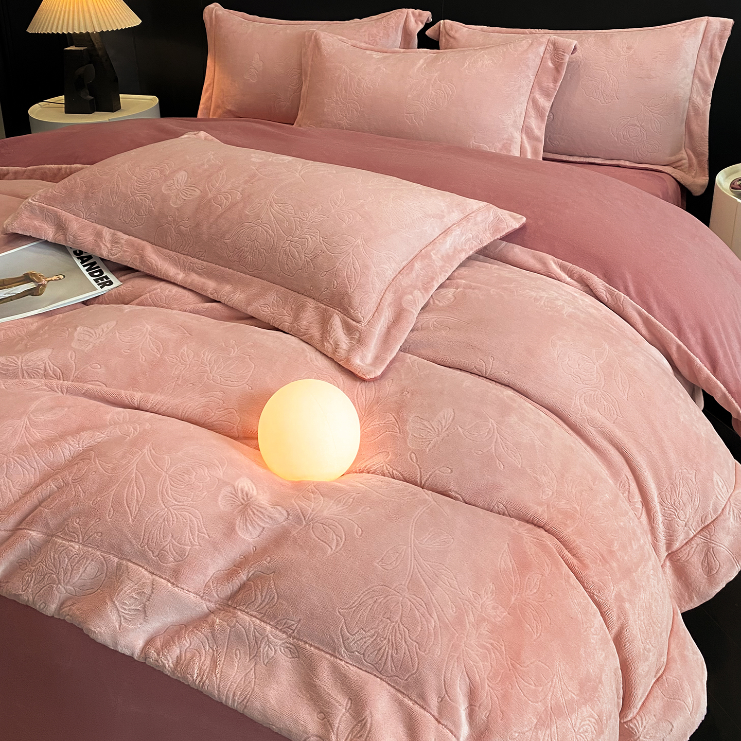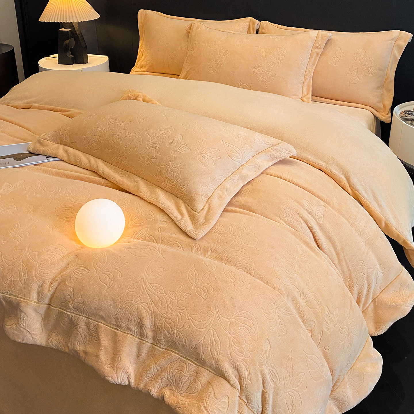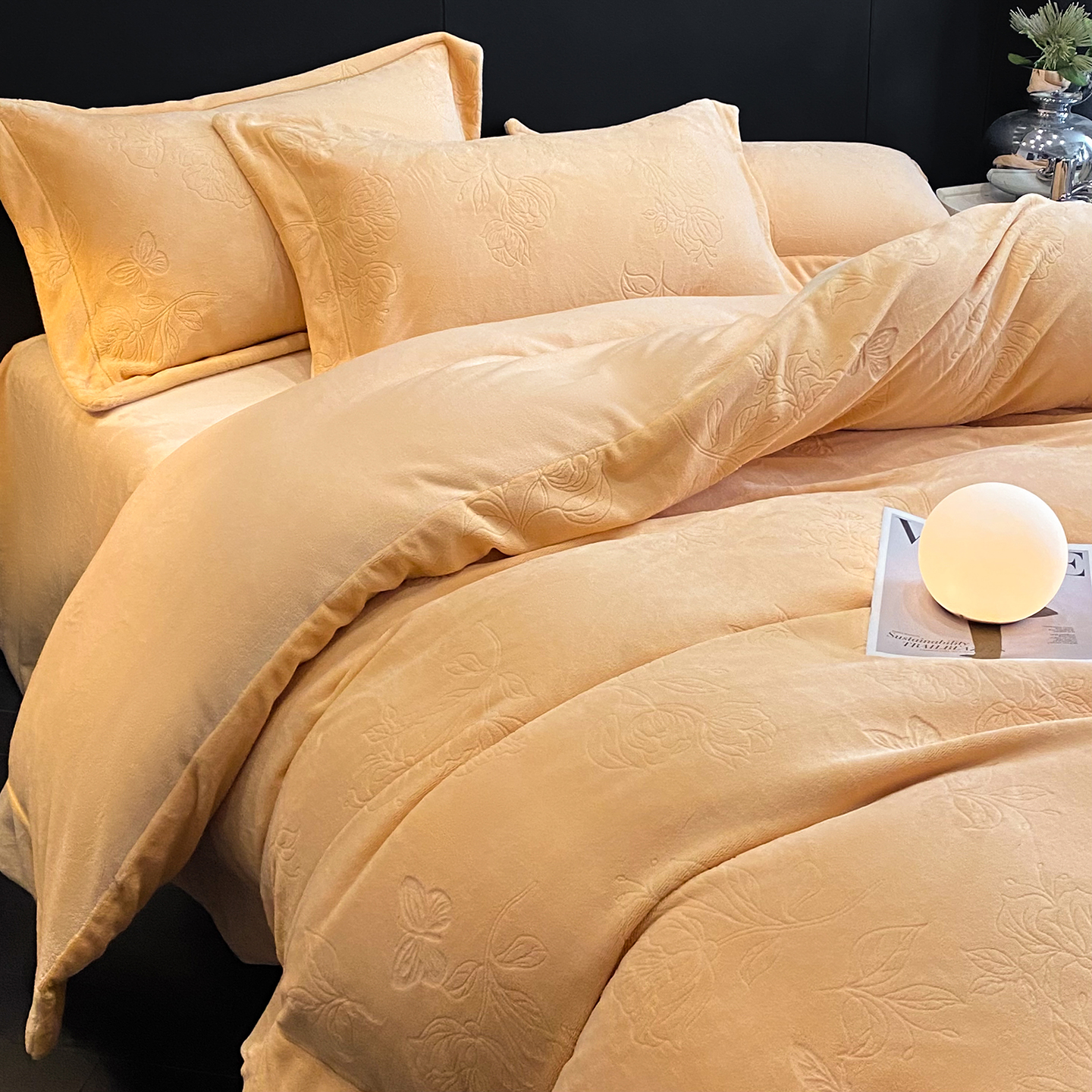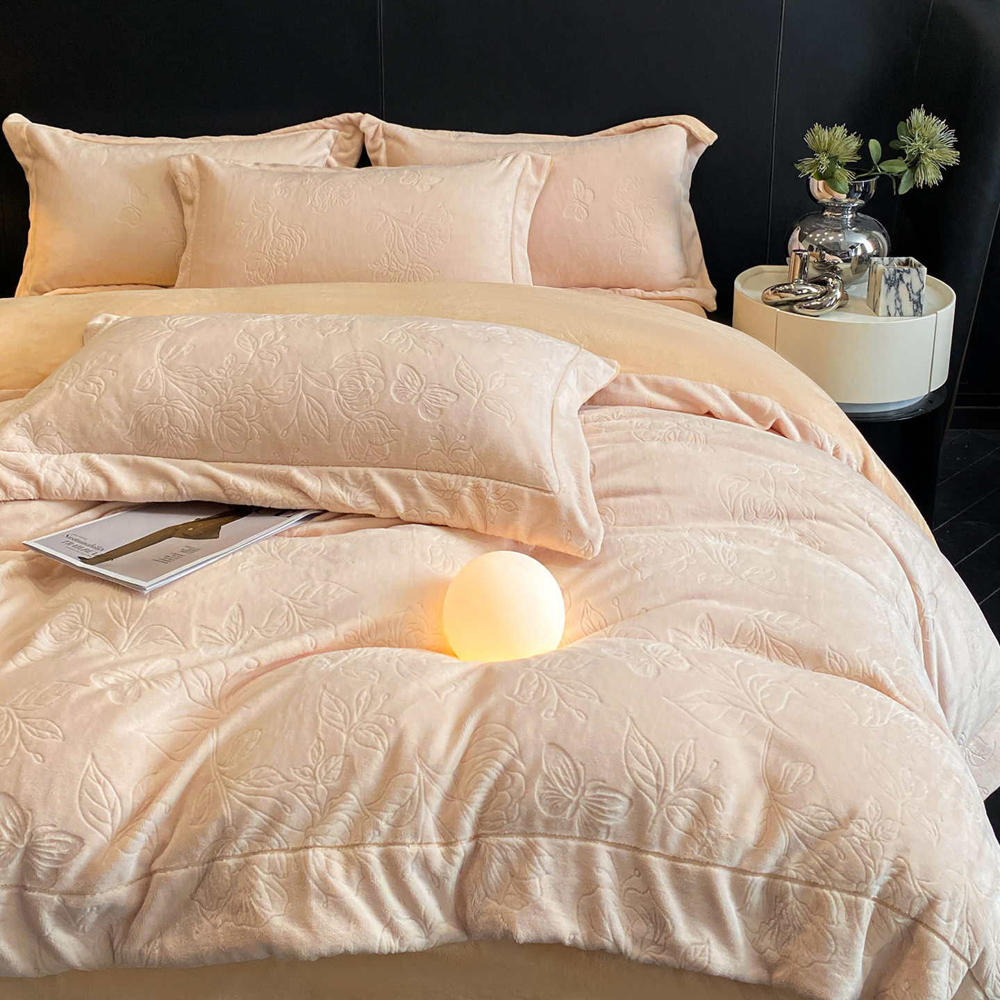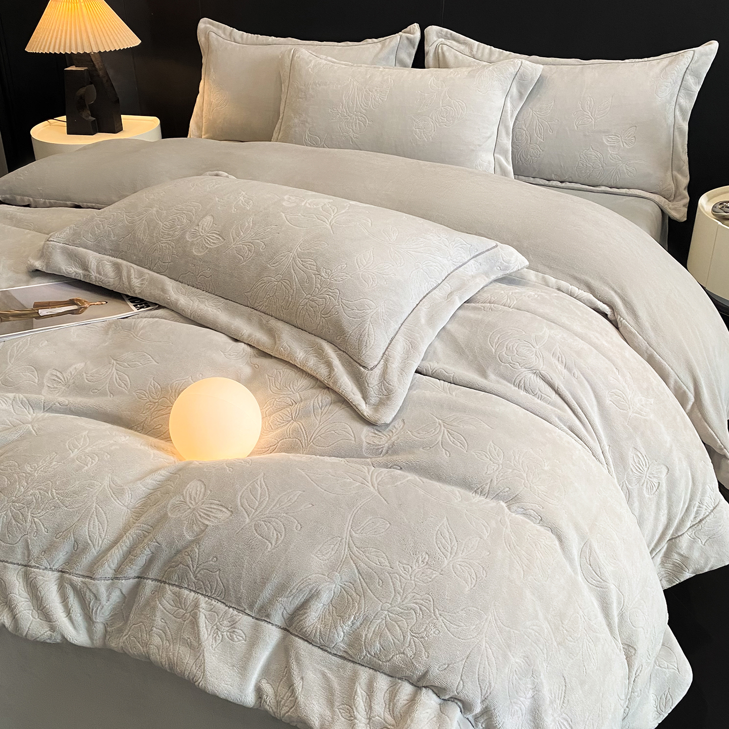 商品名称:(总)控价 专版花型 2025年新款240克9.2斤全消光A类烂花牛奶绒四件套-蝴蝶戏花