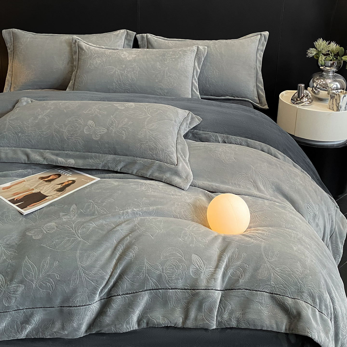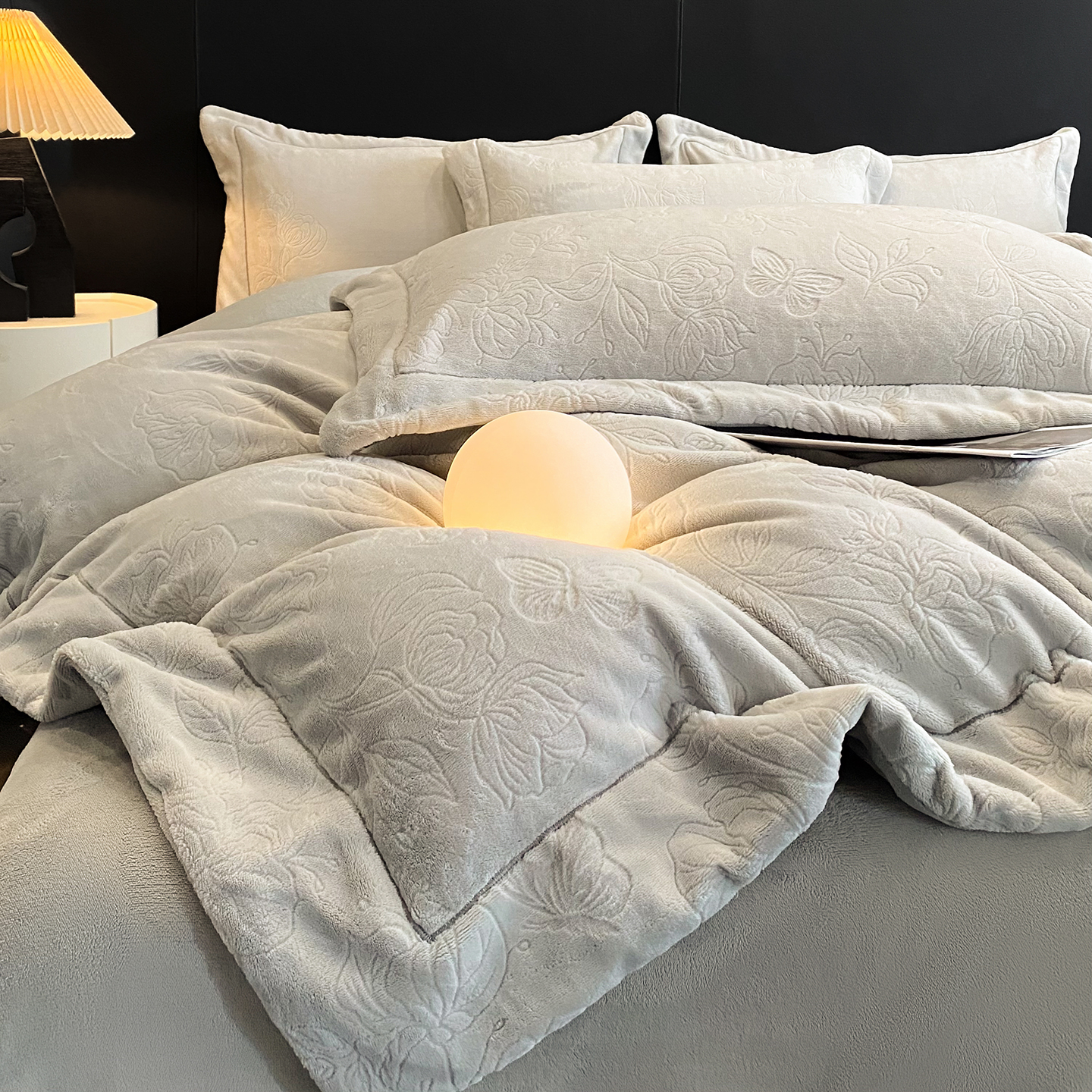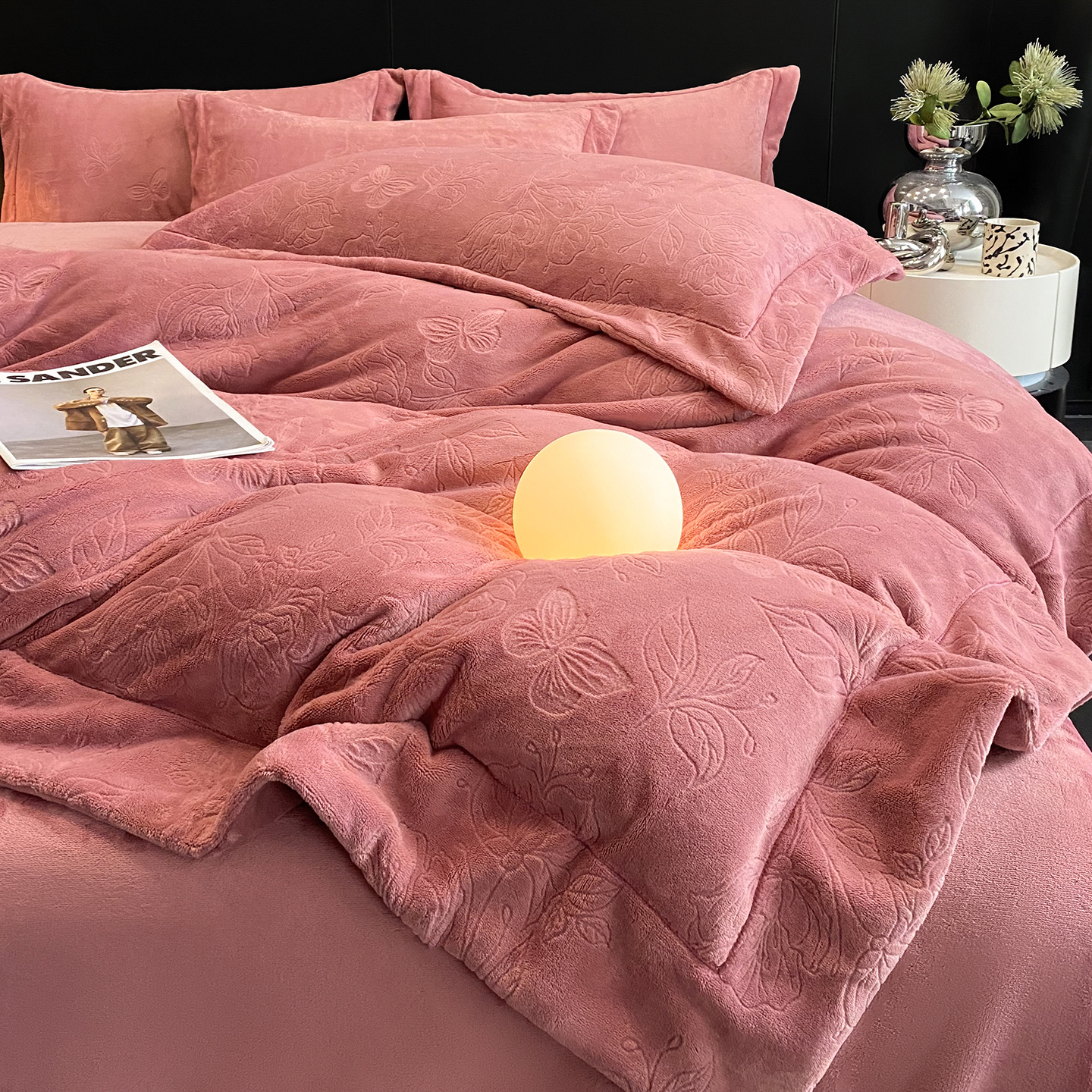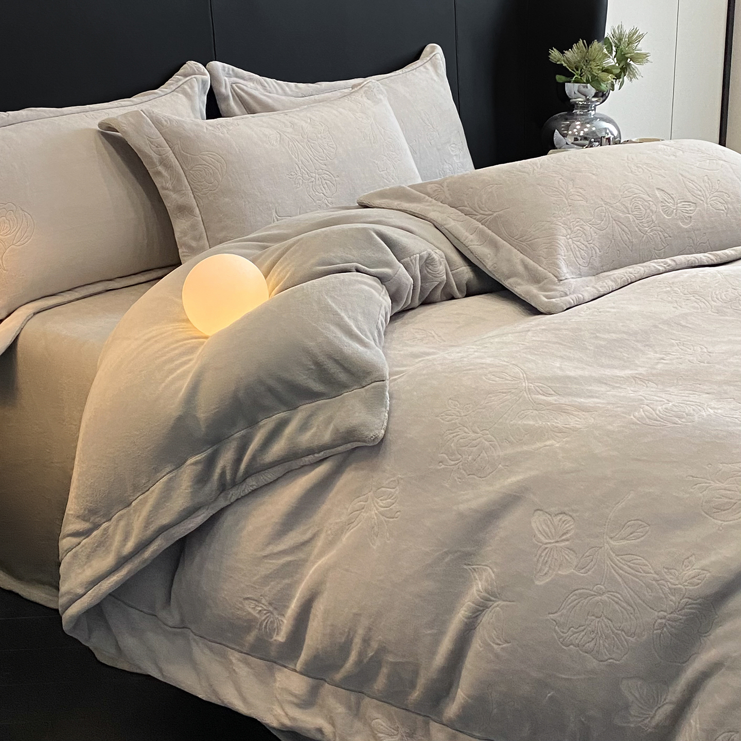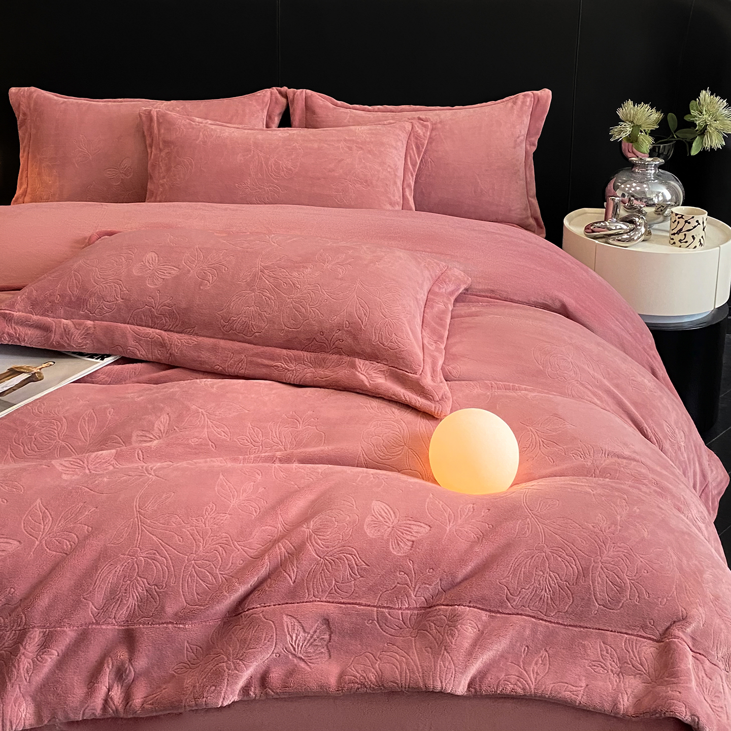 商品名称:(总)控价 专版花型 2025年新款240克9.2斤全消光A类烂花牛奶绒四件套-蝴蝶戏花