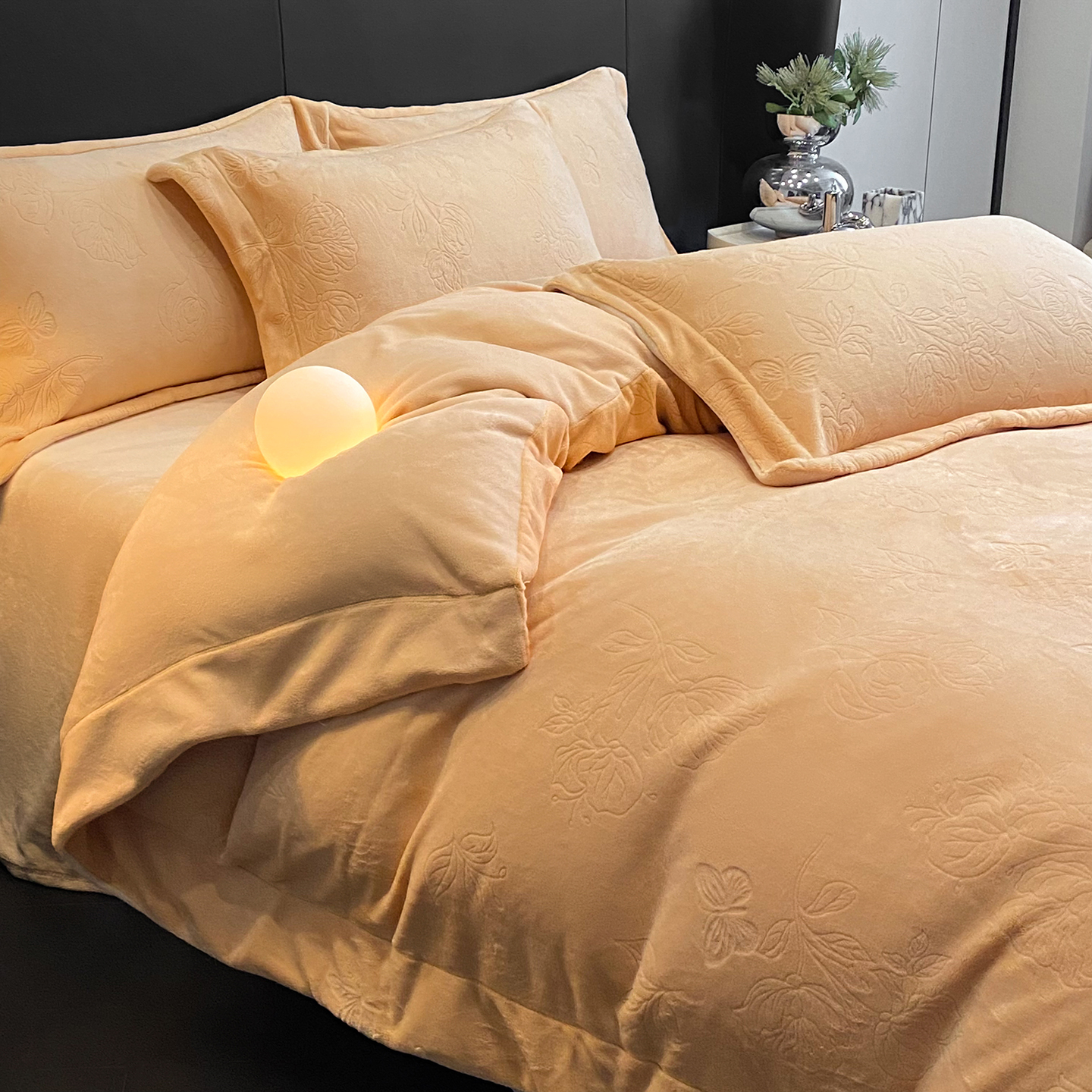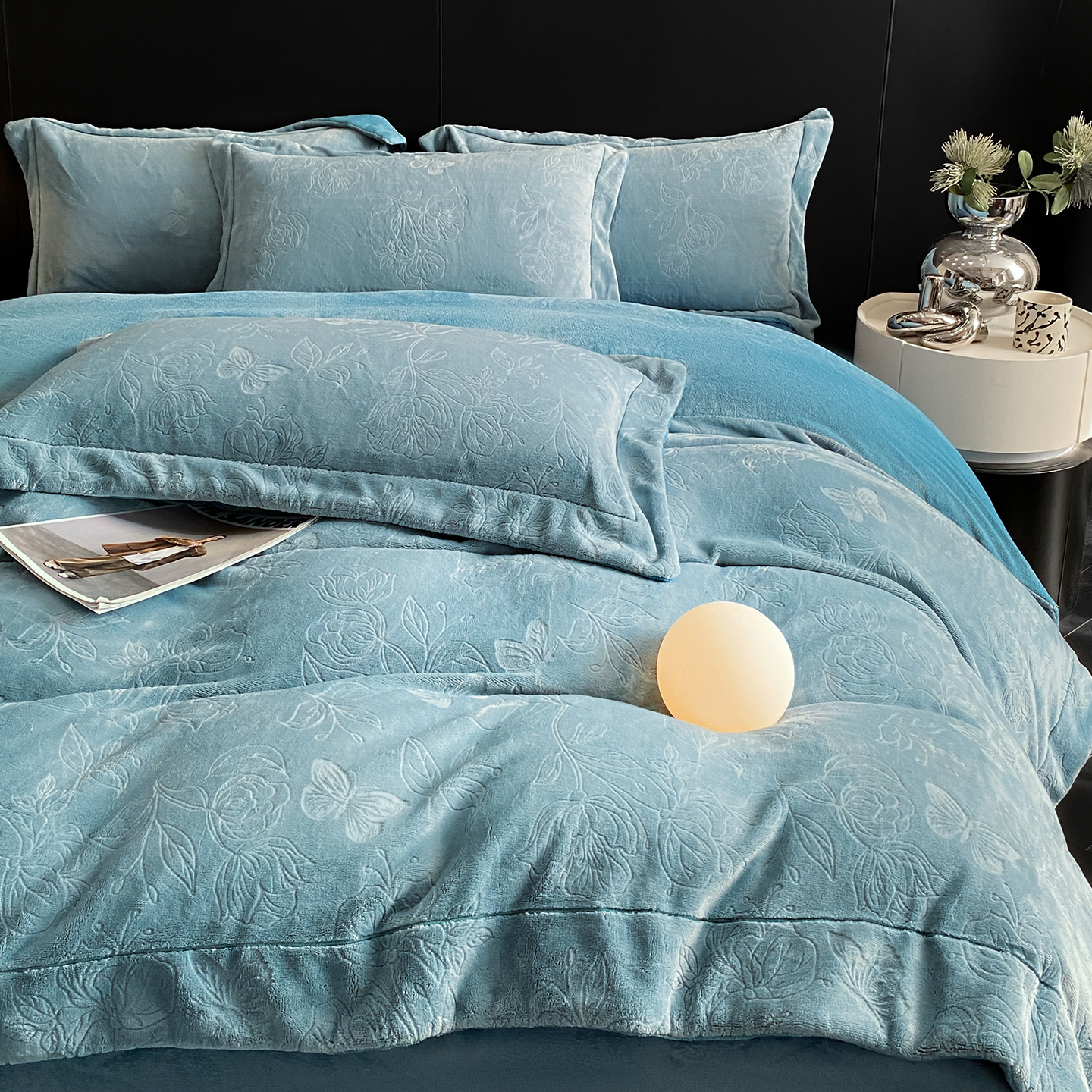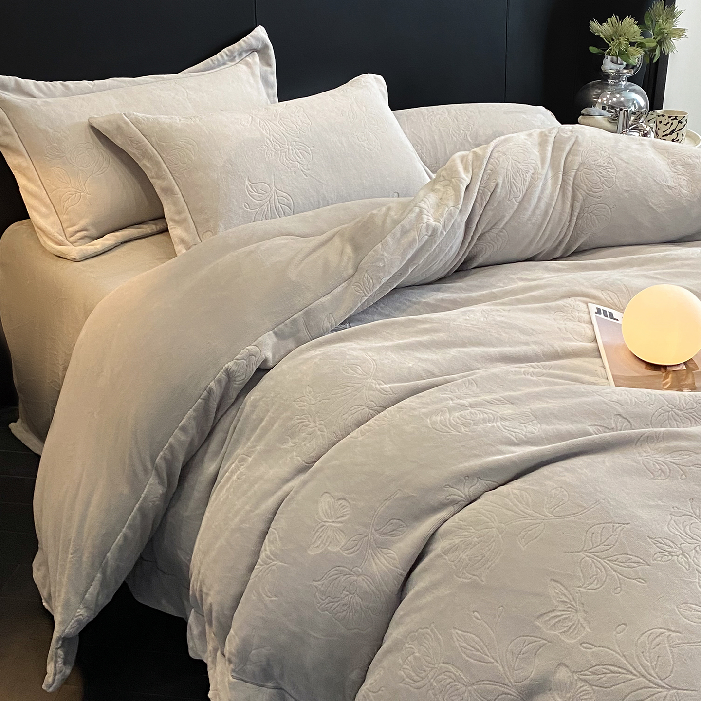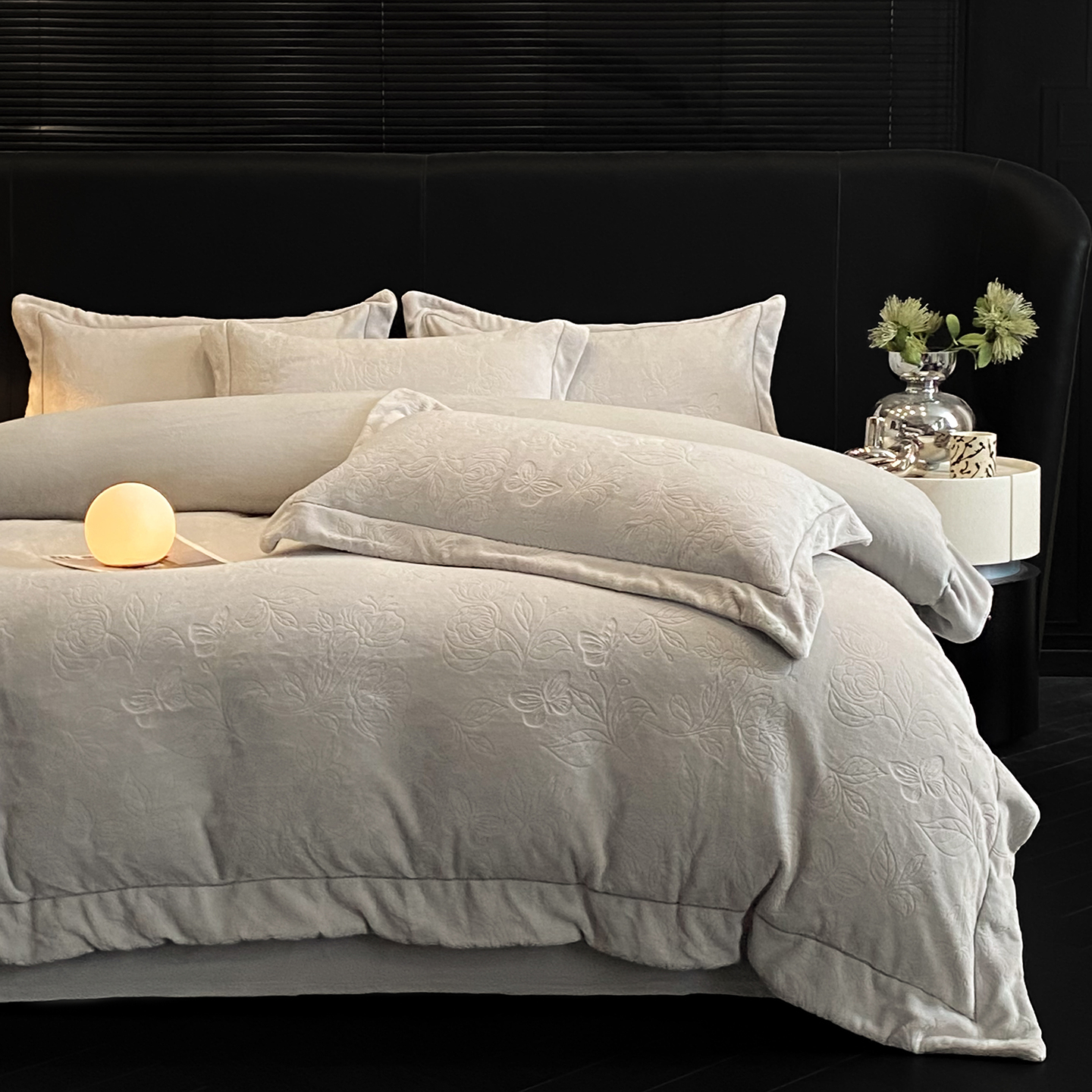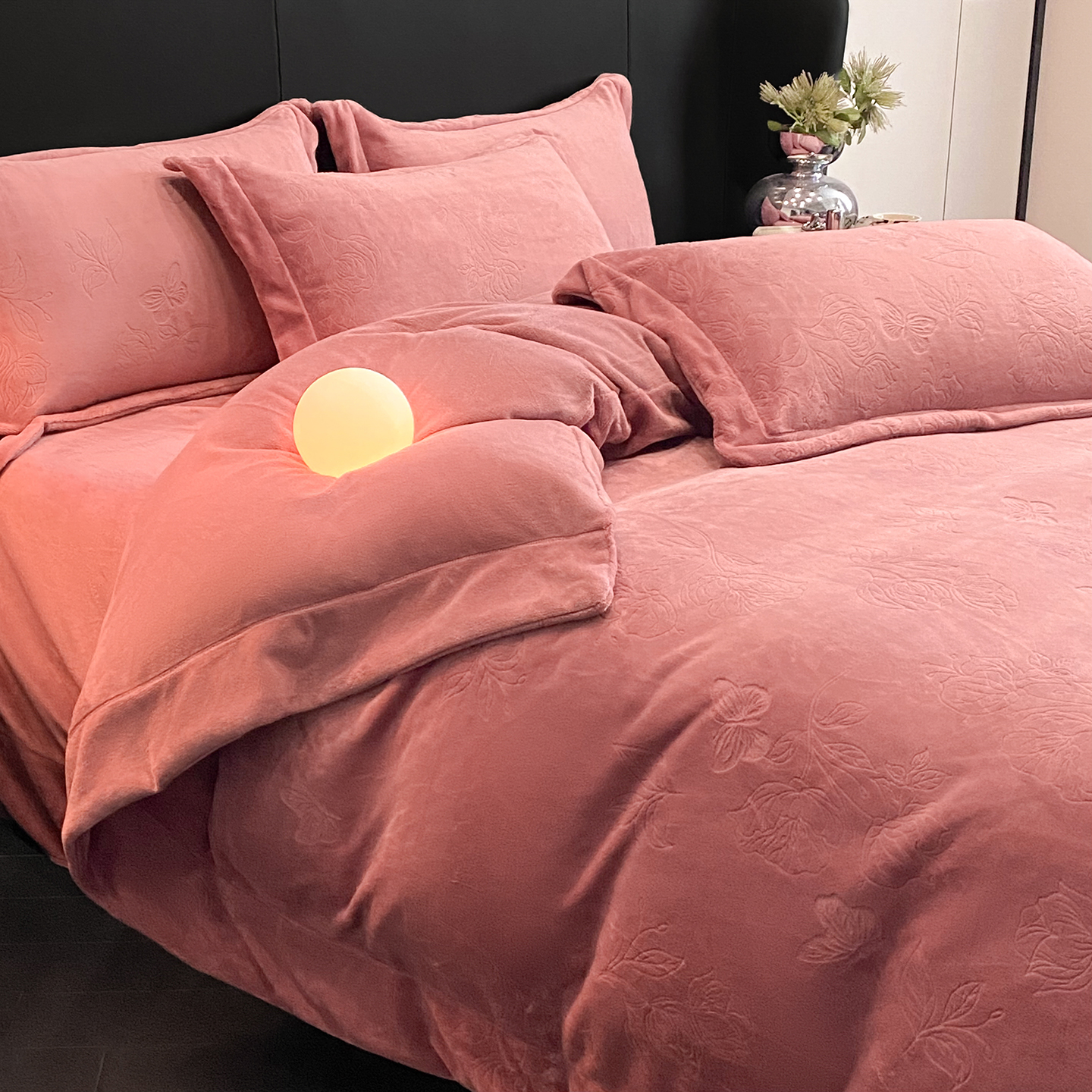 商品名称:(总)控价 专版花型 2025年新款240克9.2斤全消光A类烂花牛奶绒四件套-蝴蝶戏花