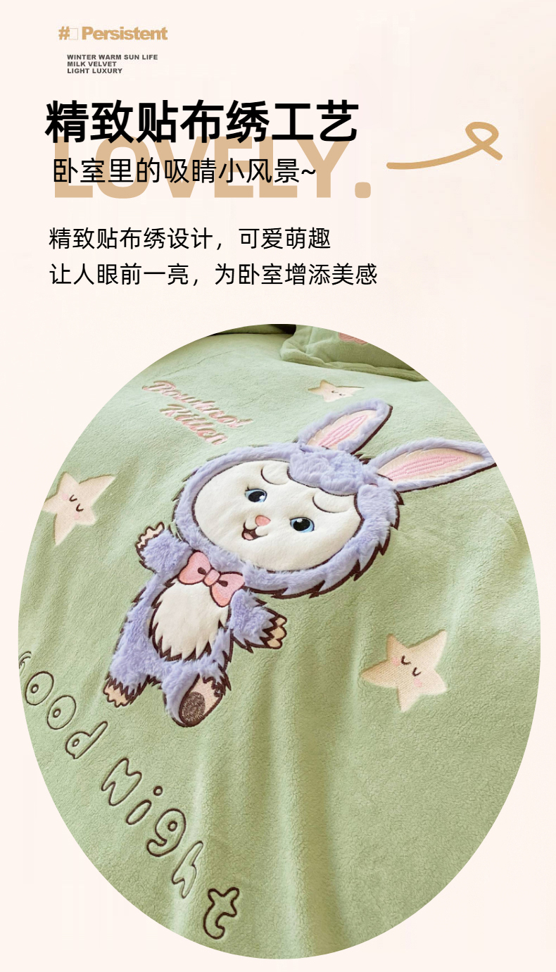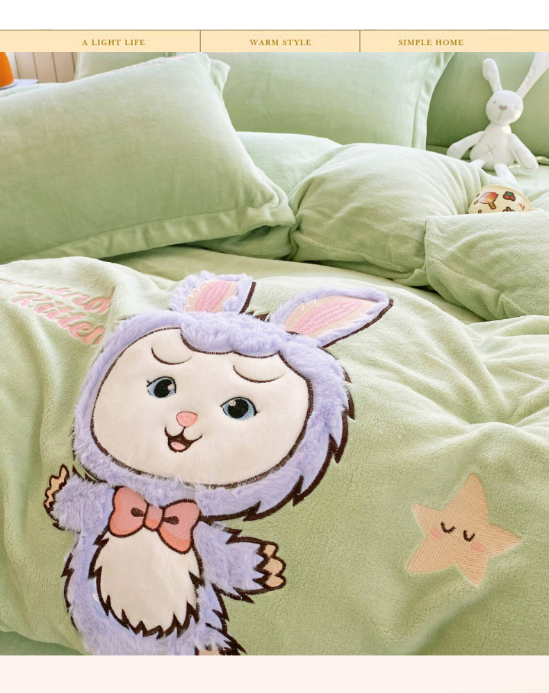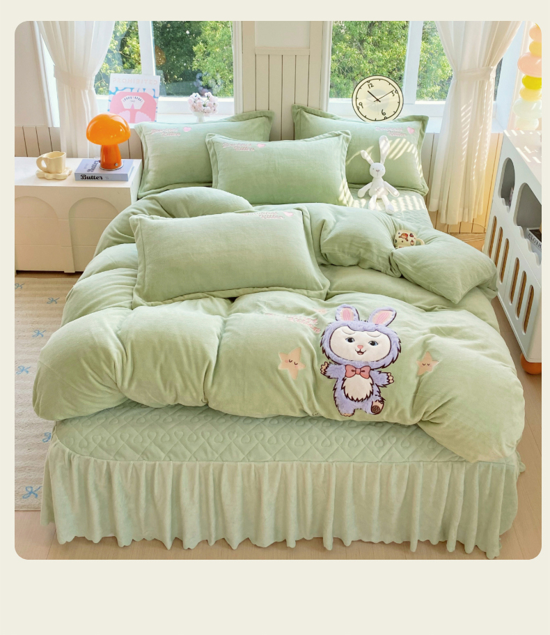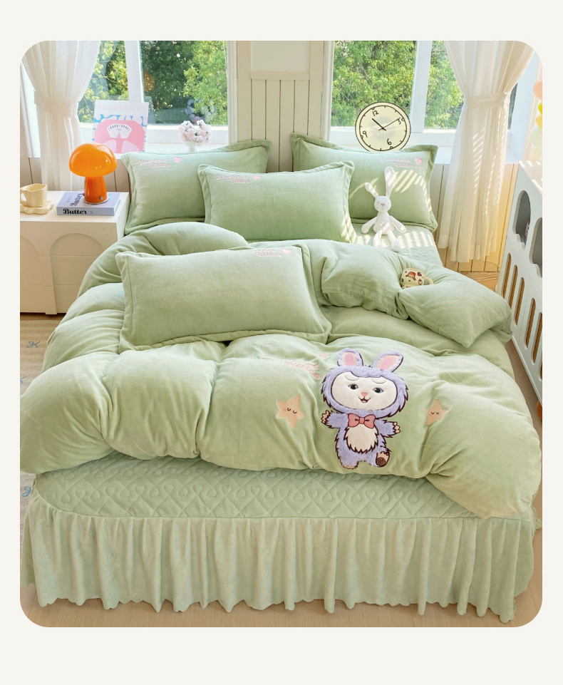 当前位置: 91家纺网 > 商品网购 > 床品套件 > 四件套 > 牛奶绒四件套 > 悦织湾家纺 2025新款牛奶绒四件套纯色贴布绣床单款床盖款床上用品四件套时尚小兔2025新款加厚 床盖款-时尚小兔-绿