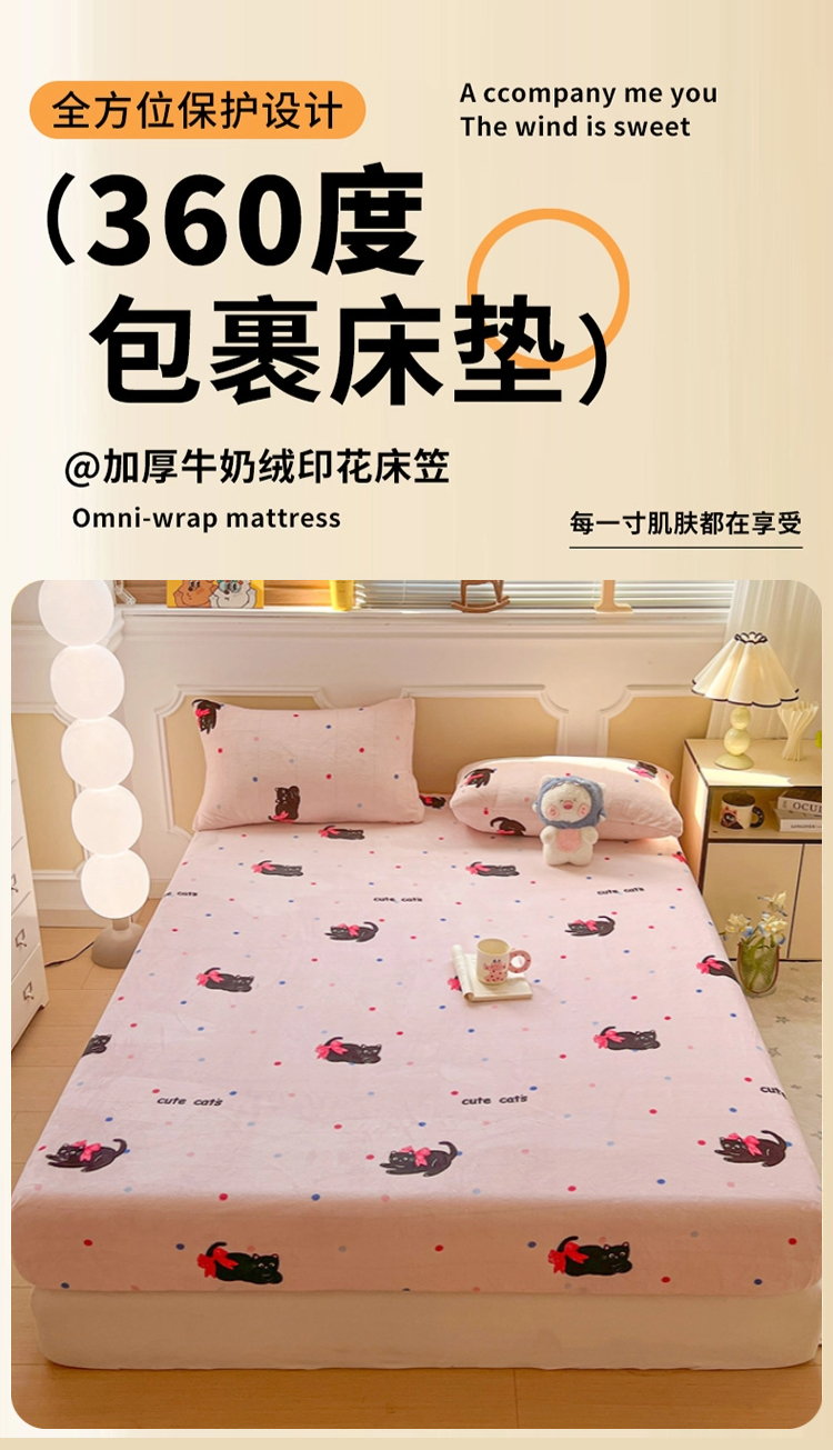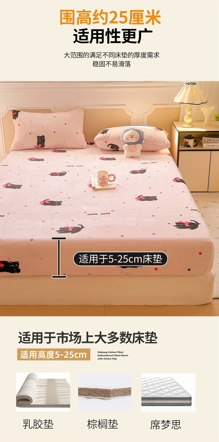 维娜斯家纺 2025新款卡通牛奶绒印花床笠单件 可爱猫咪