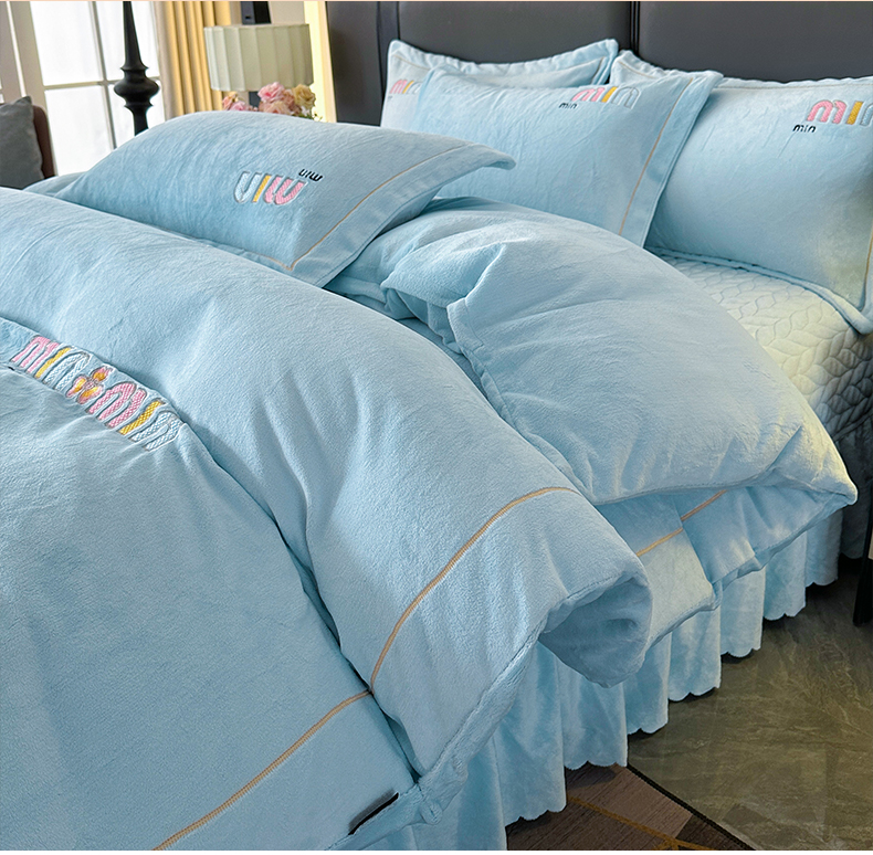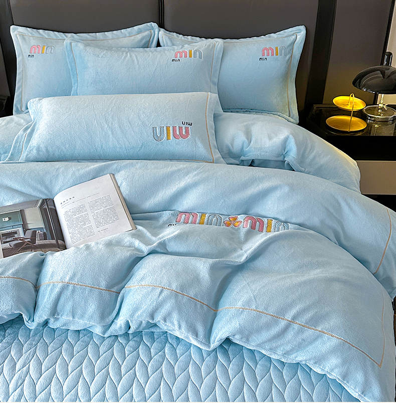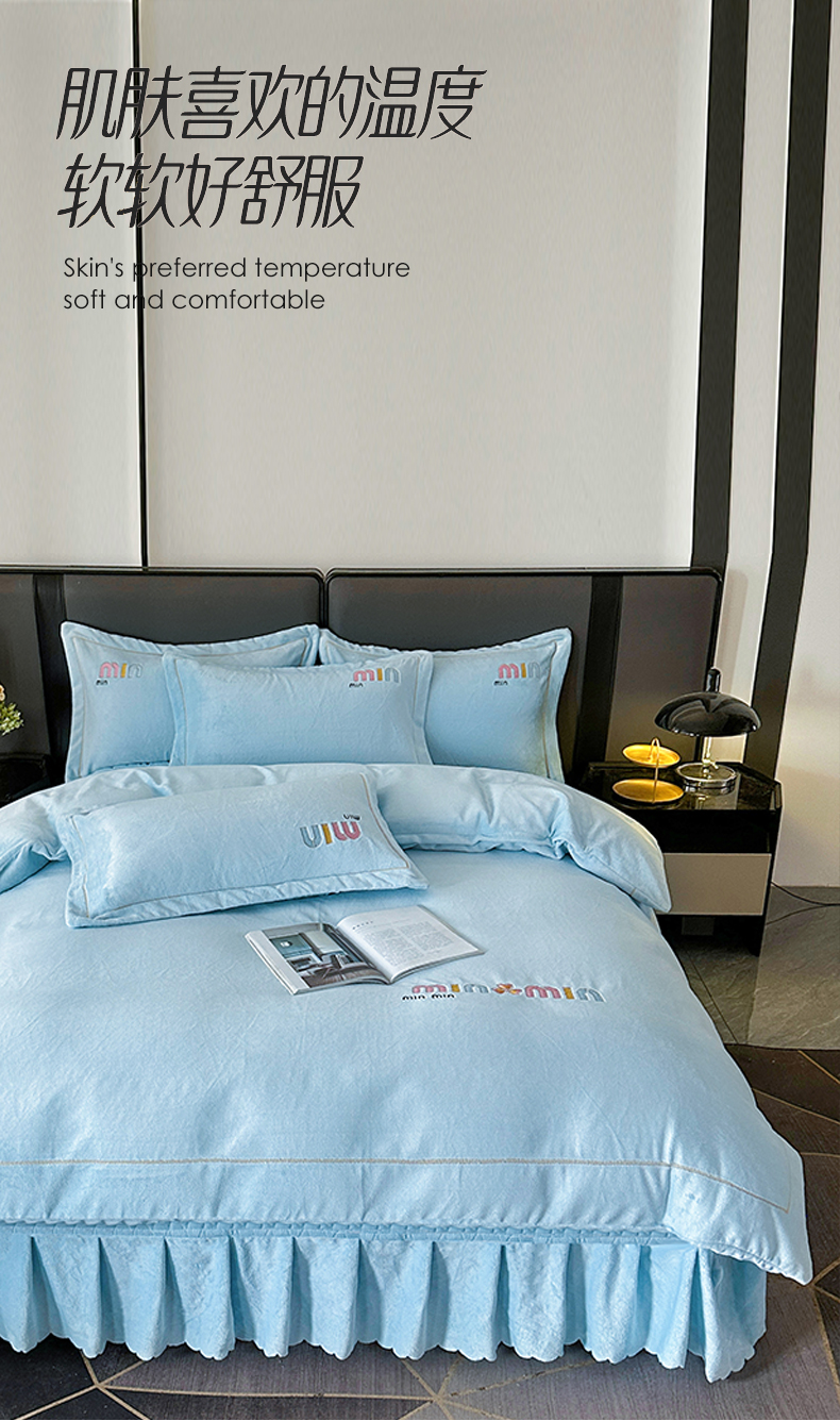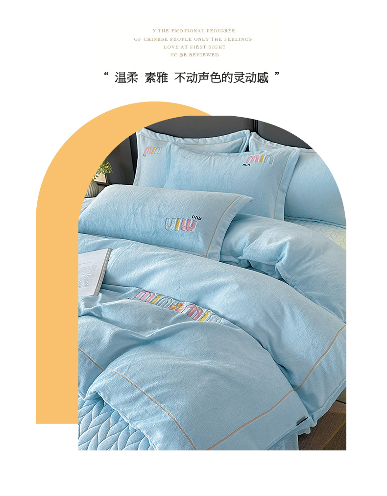 商品名称:柏薇 2025新款高克重牛奶绒绣花床盖四件套-缪系列 奶蓝色