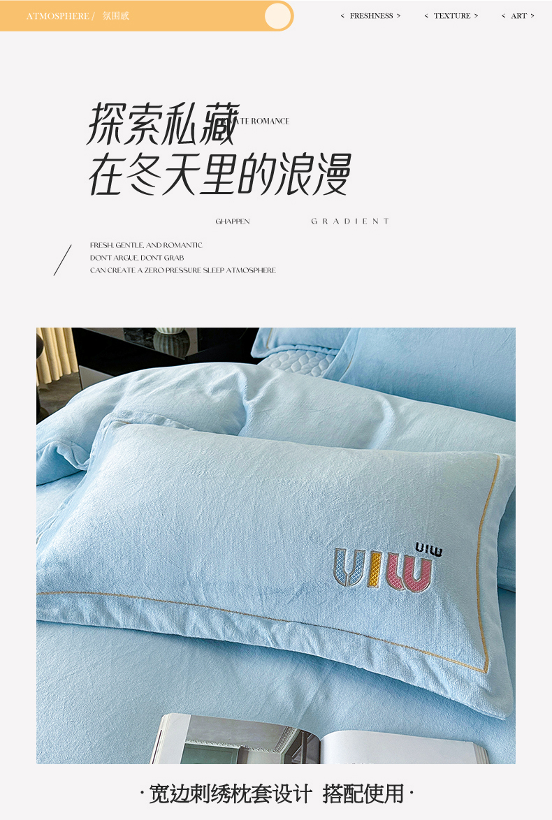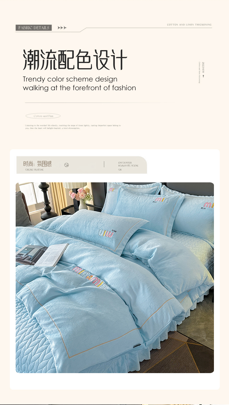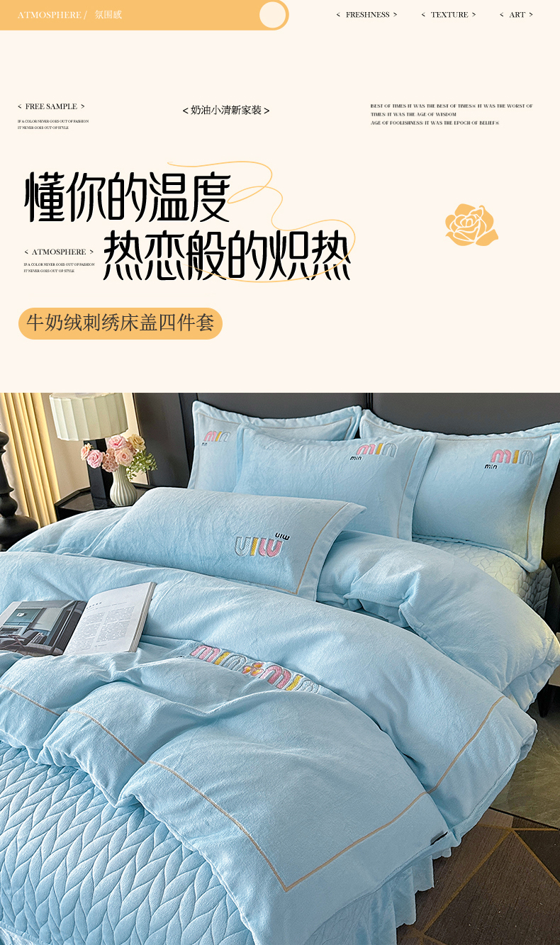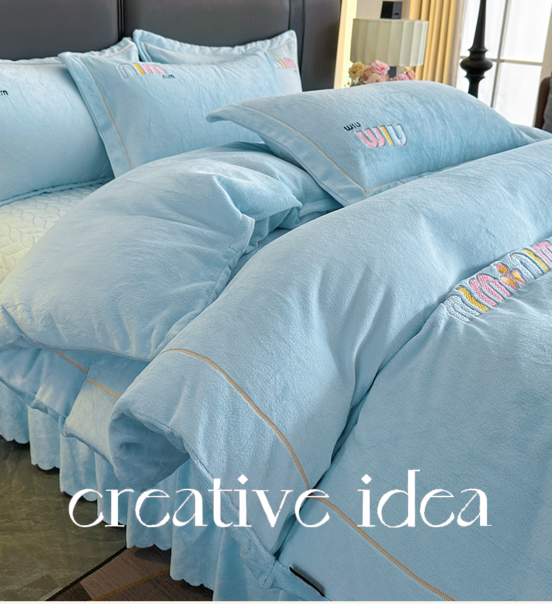商品名称:柏薇 2025新款高克重牛奶绒绣花床盖四件套-缪系列 奶蓝色