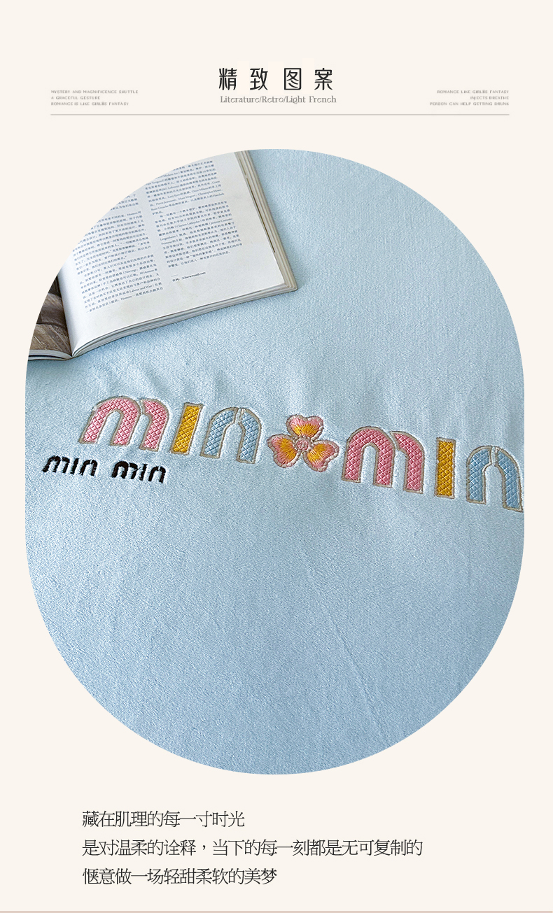 (总)柏薇 2025新款高克重牛奶绒绣花床盖四件套-缪系列,豆沙色,粉色,灰色,梦幻紫,奶蓝色,清新绿