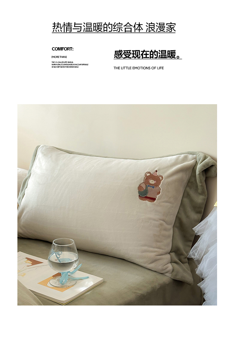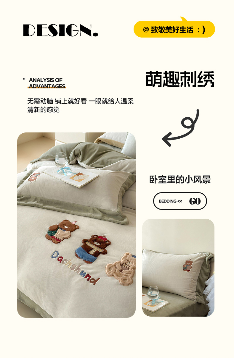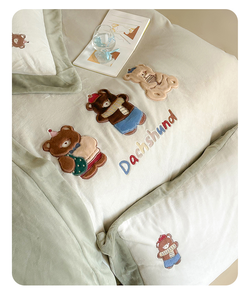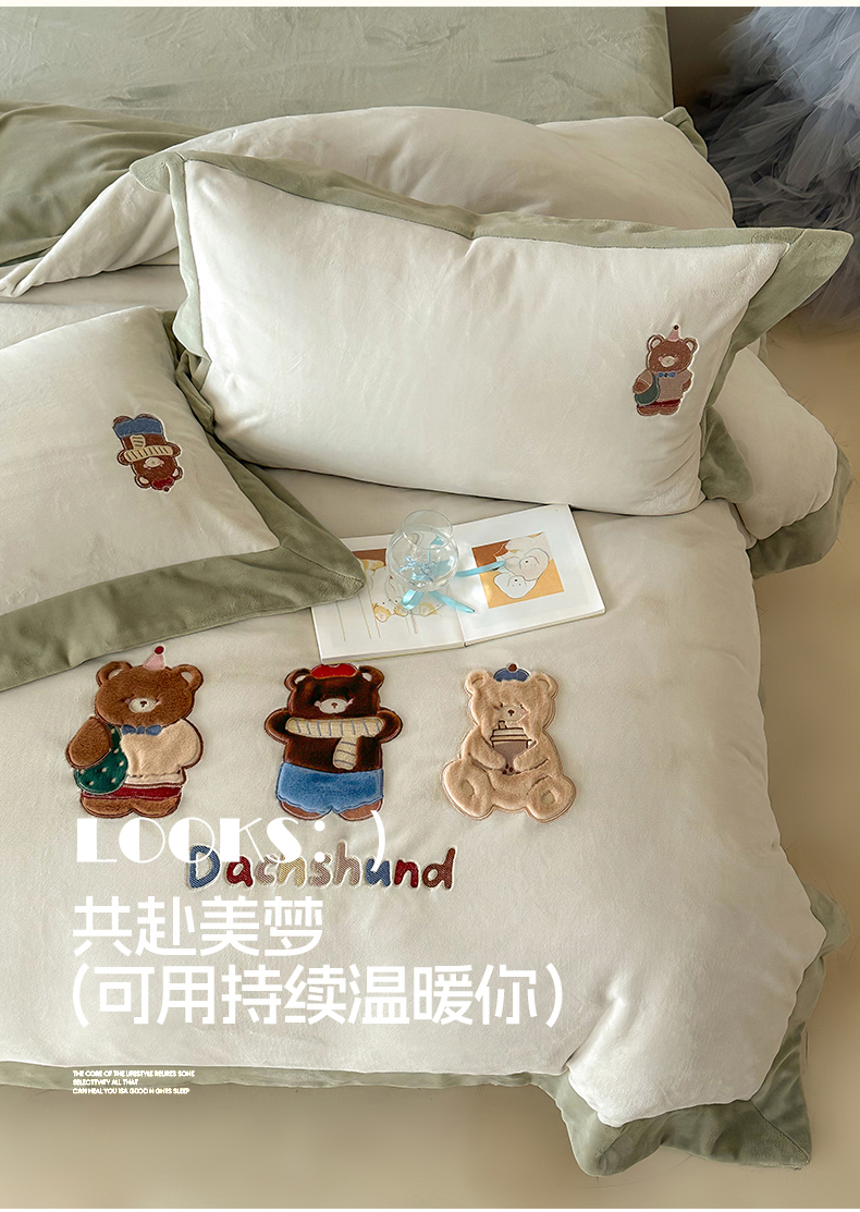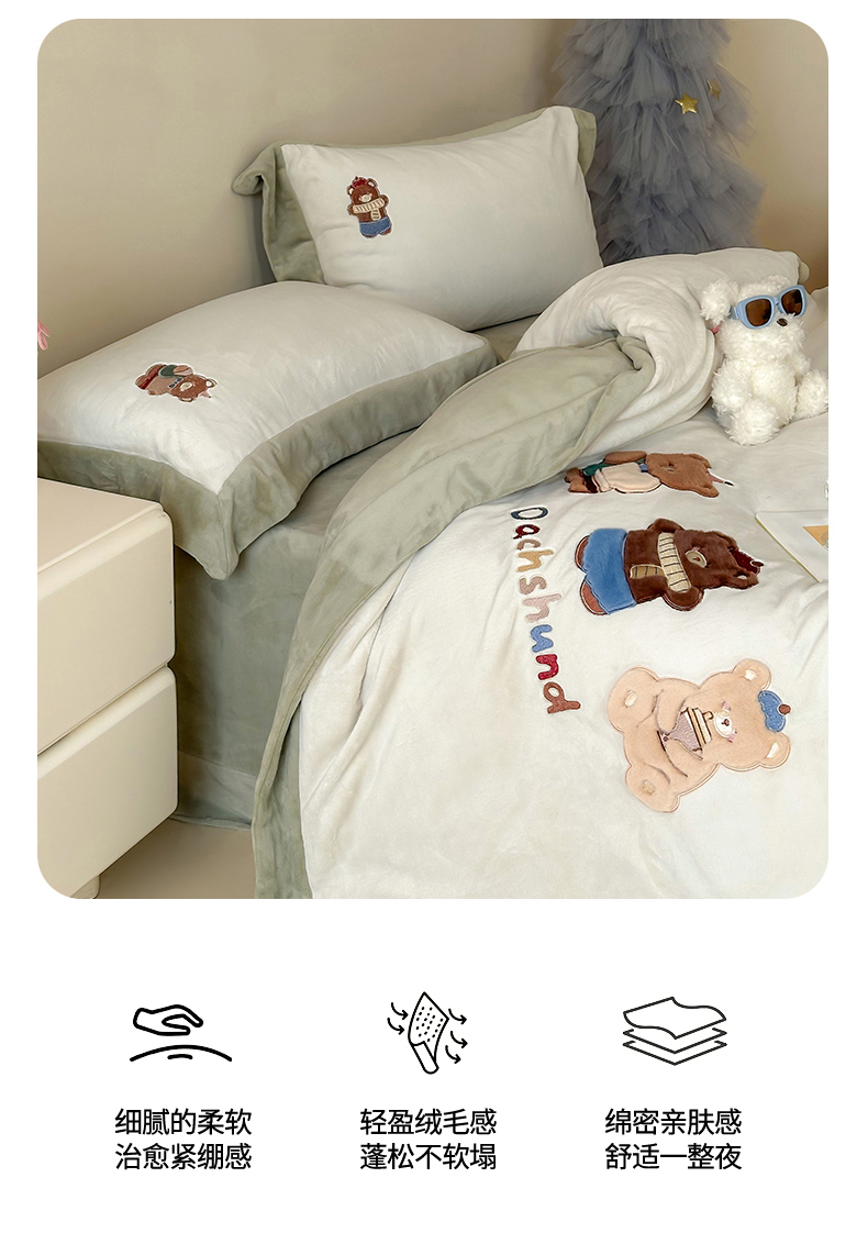 商品名称:泽西家纺+V17798841158发大图 2025新品秋冬加厚保暖240克奶肤绒宽边卡通牛奶绒四件套 熊宝假日-葱绿
