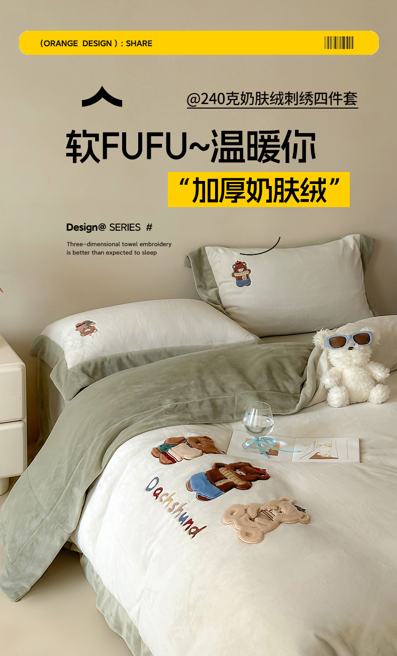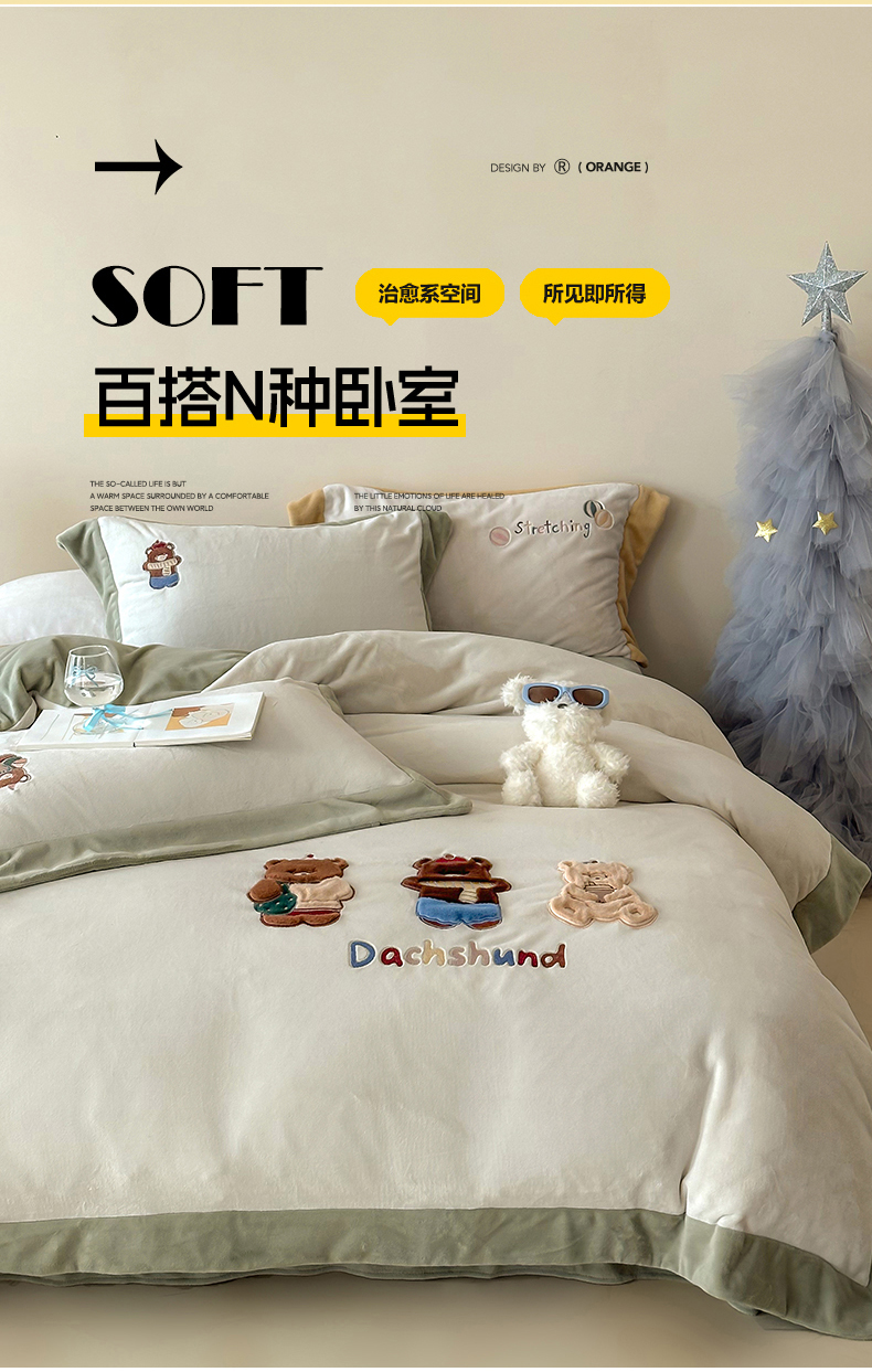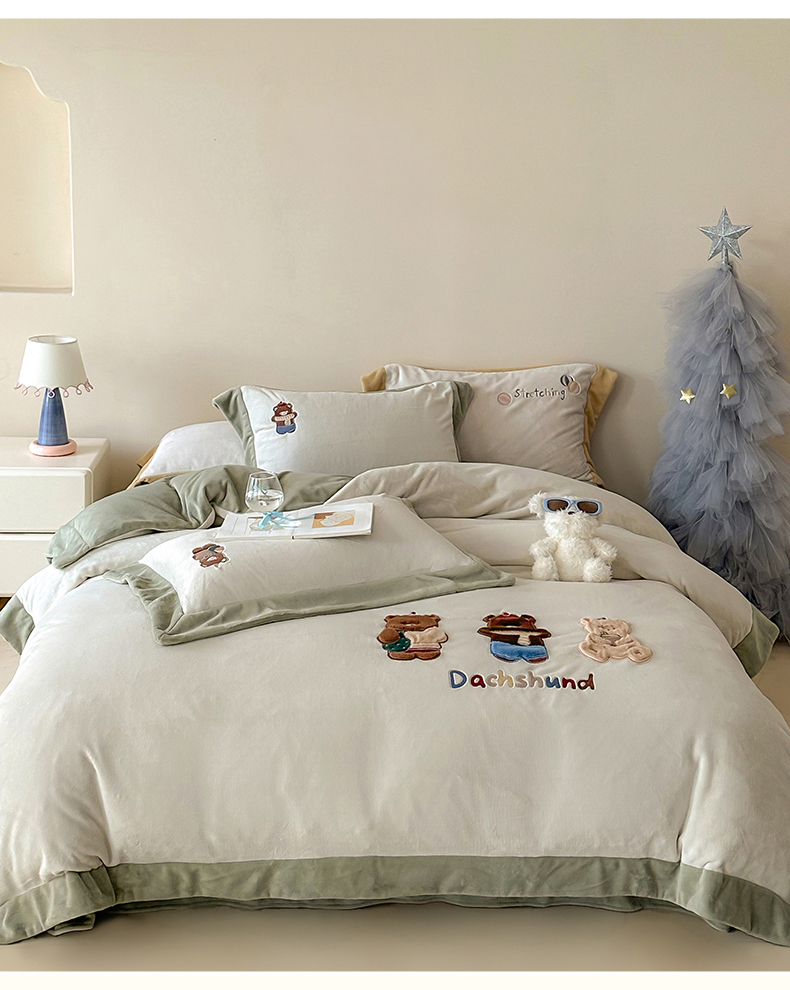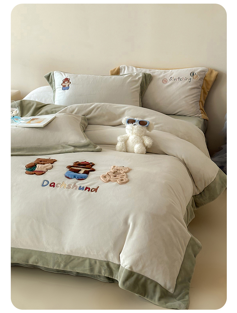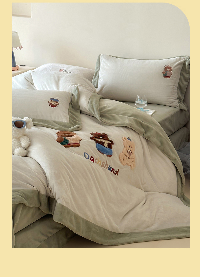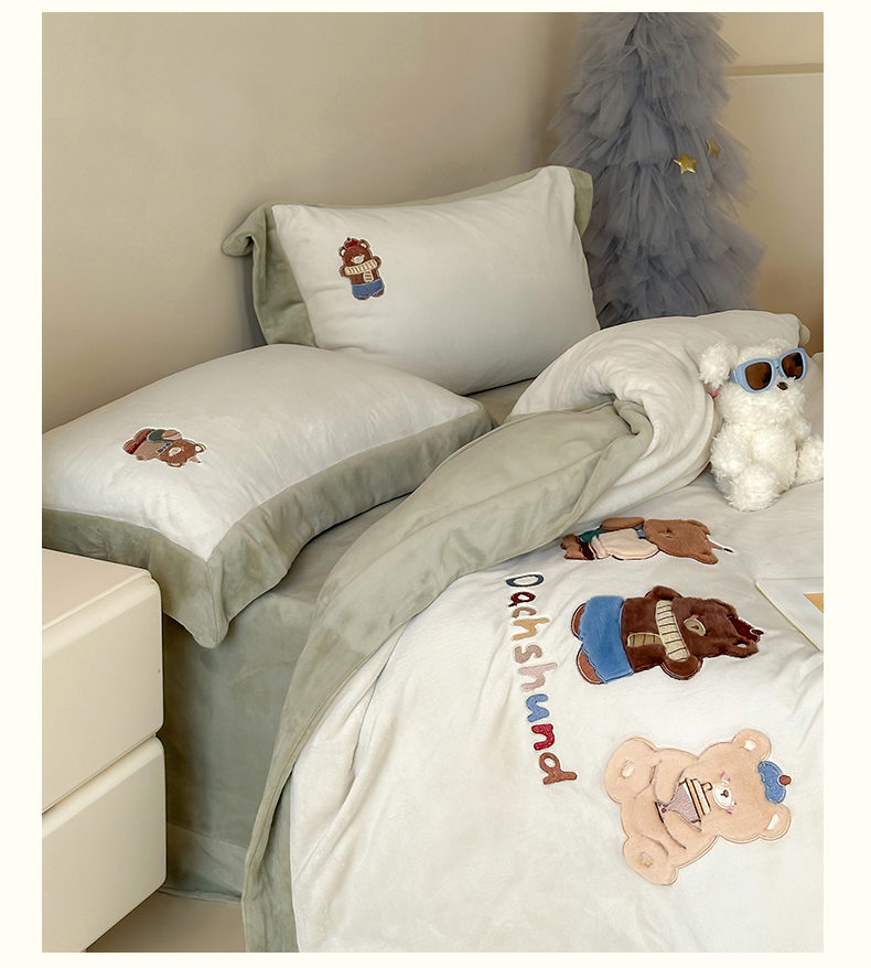 泽西家纺+V17798841158发大图 2025新品秋冬加厚保暖240克奶肤绒宽边卡通牛奶绒四件套 熊宝假日-葱绿