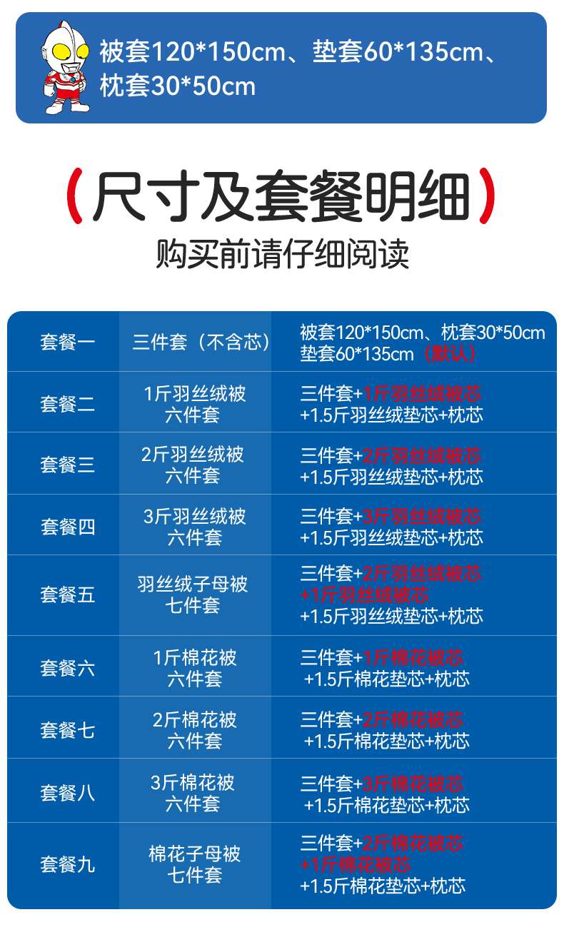 三件套(不含芯):被套120x150cm+垫套60x135cm+枕套30x50cm | ¥60.00 |