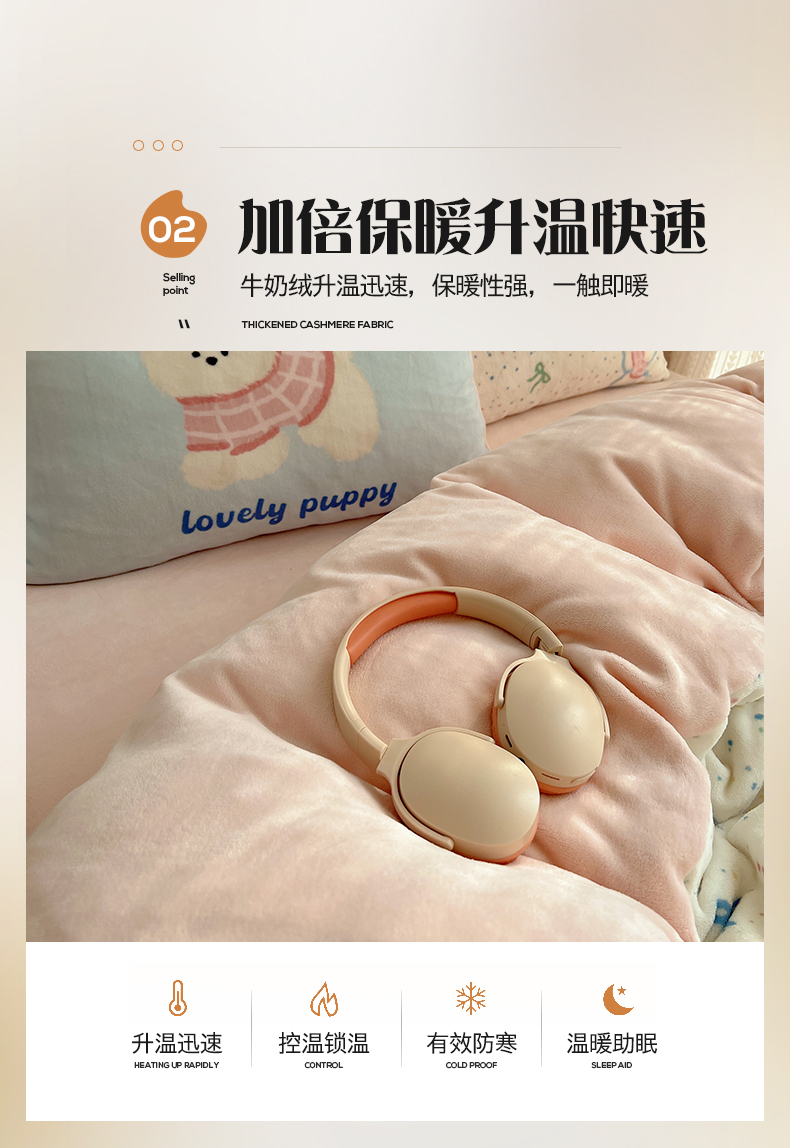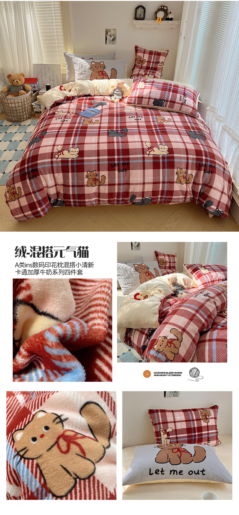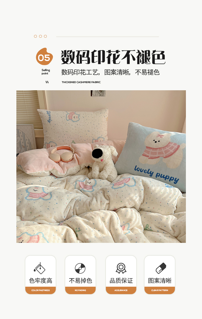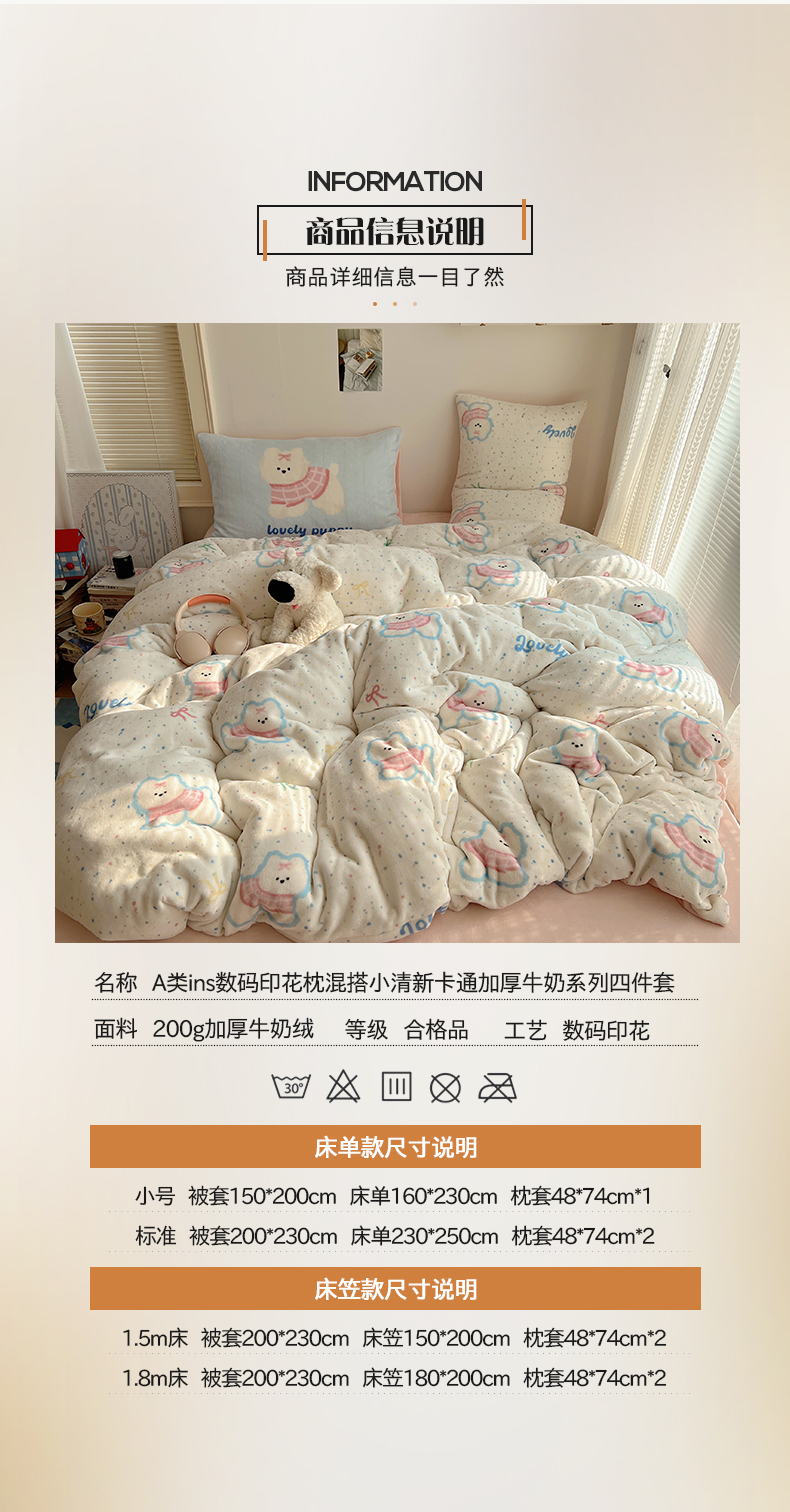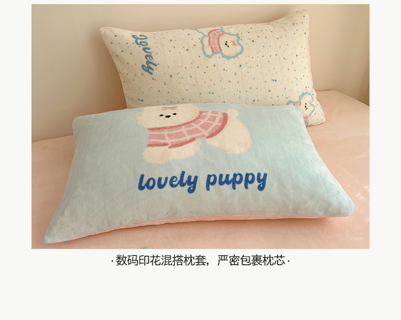 商品名称:桃子家居 2025新款A类ins数码印花枕混搭小清新少女卡通猫咪加厚牛奶系列四件套 绒-混搭蝴蝶结小狗