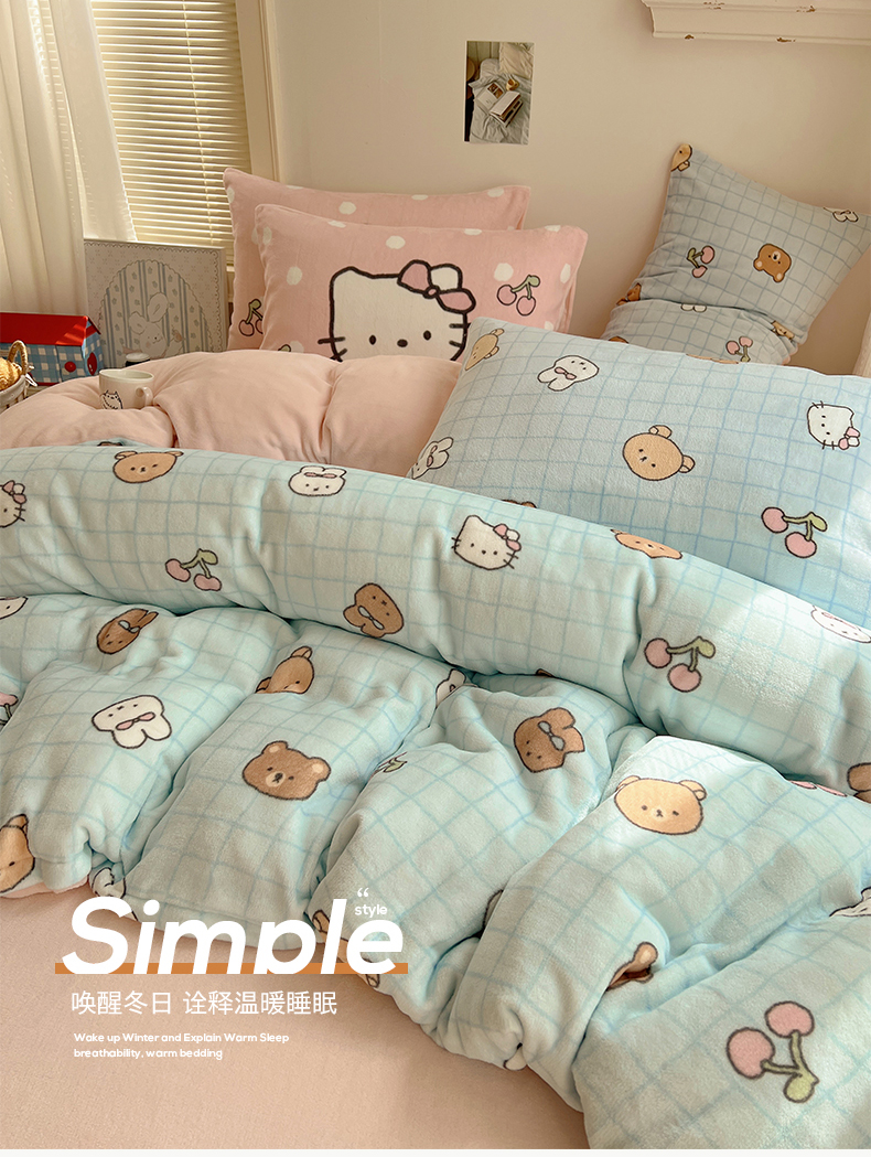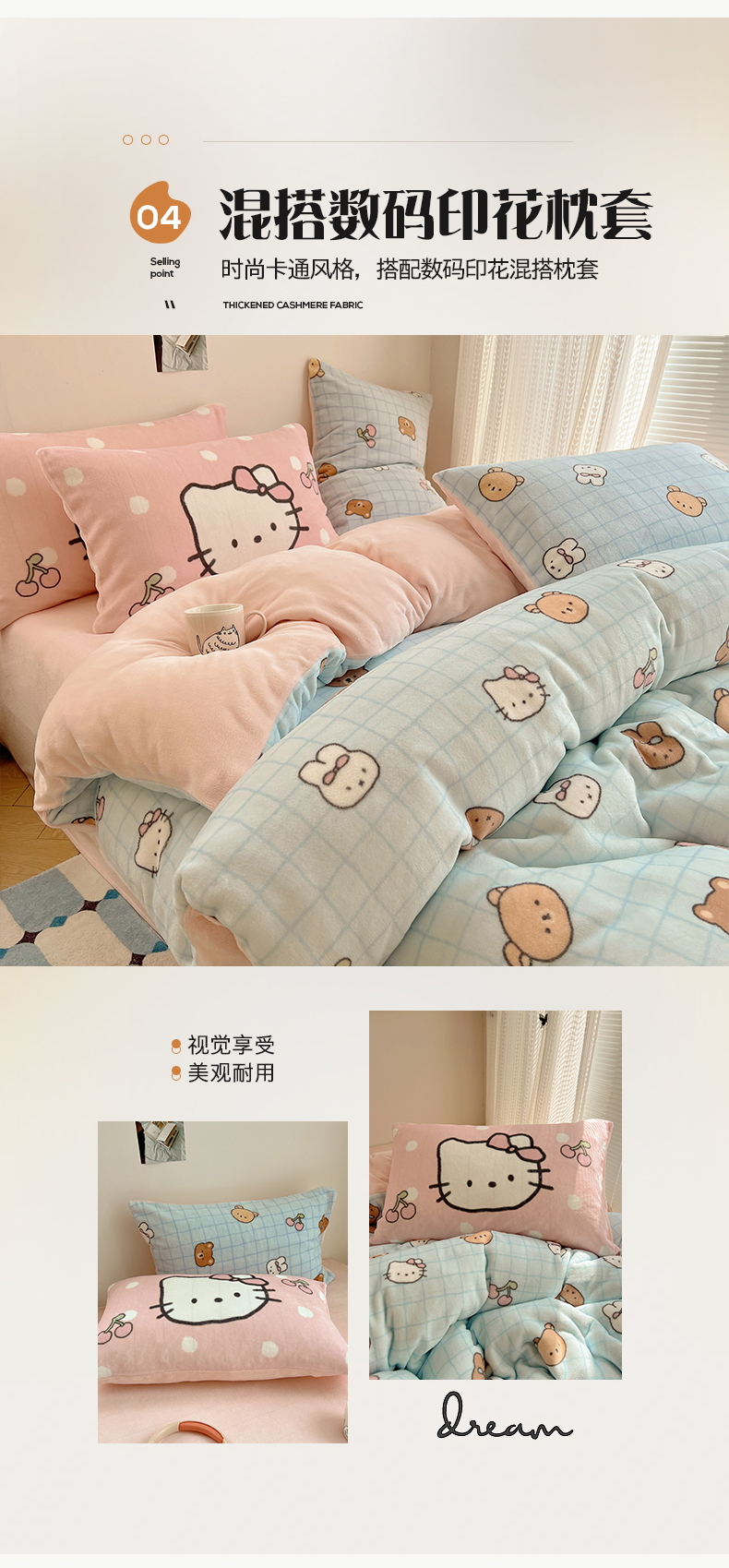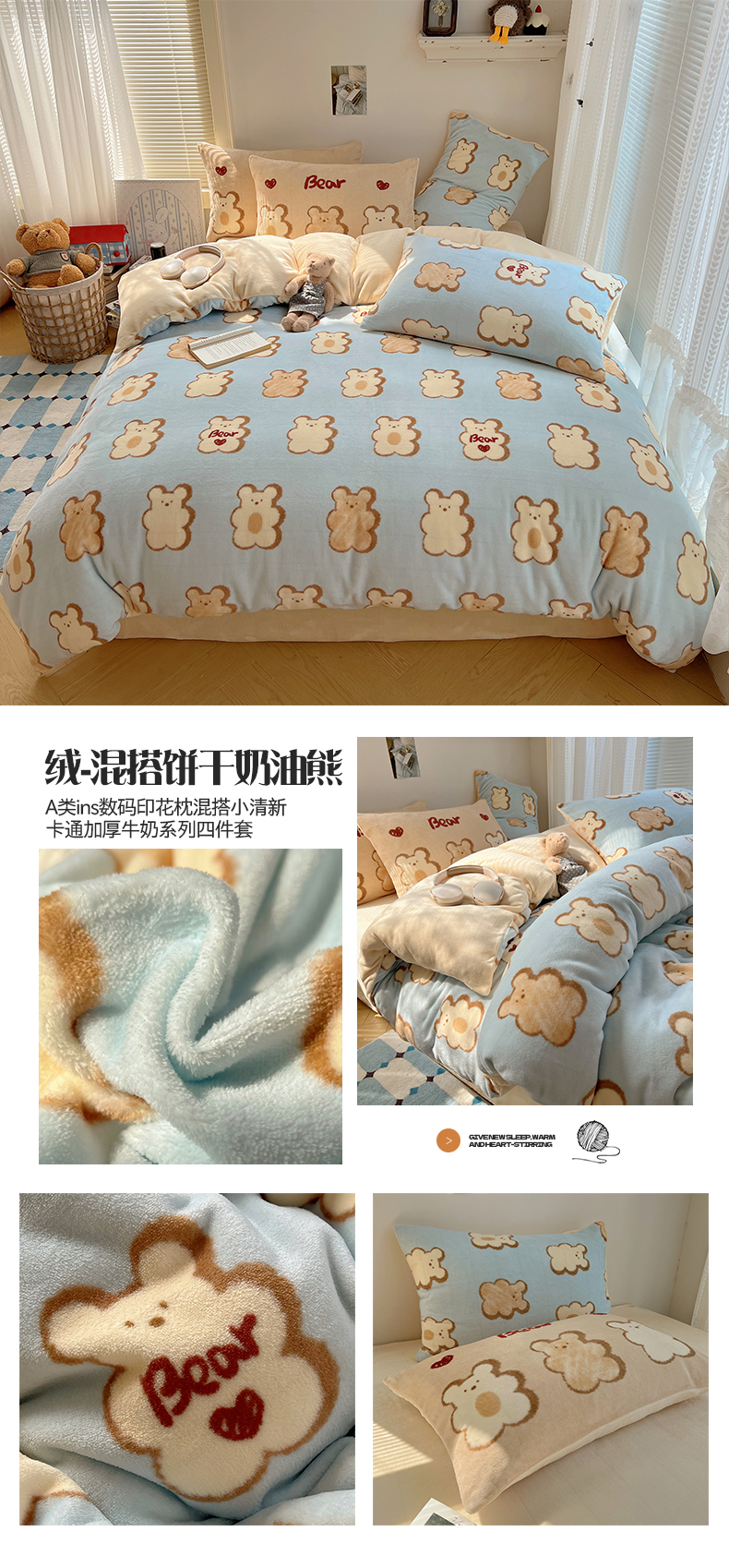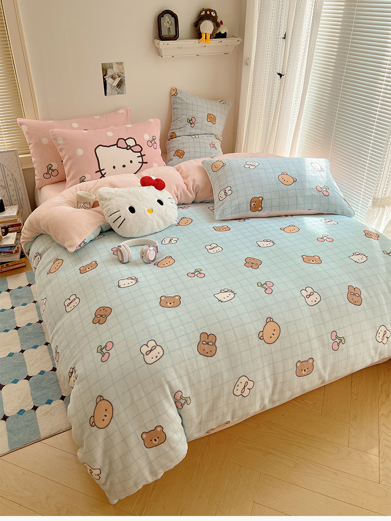 桃子家居 2025新款A类ins数码印花枕混搭小清新少女卡通猫咪加厚牛奶系列四件套 绒-混搭樱桃熊兔